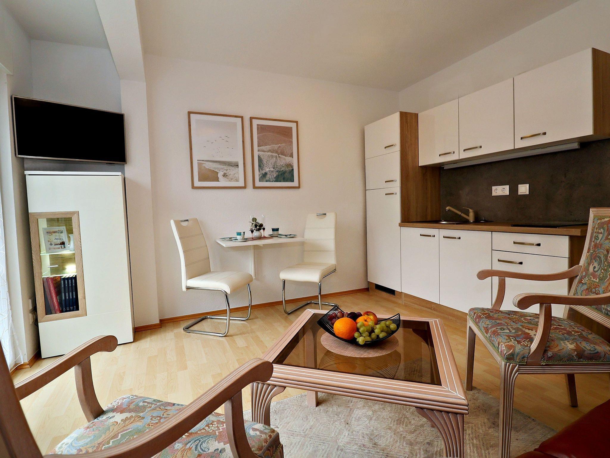 Die Ferienwohnung verfügt über ein Wohnzimmer mit offenem Küchen- und Essbereich, ein separates Schlafzimmer und ein Duschbad.