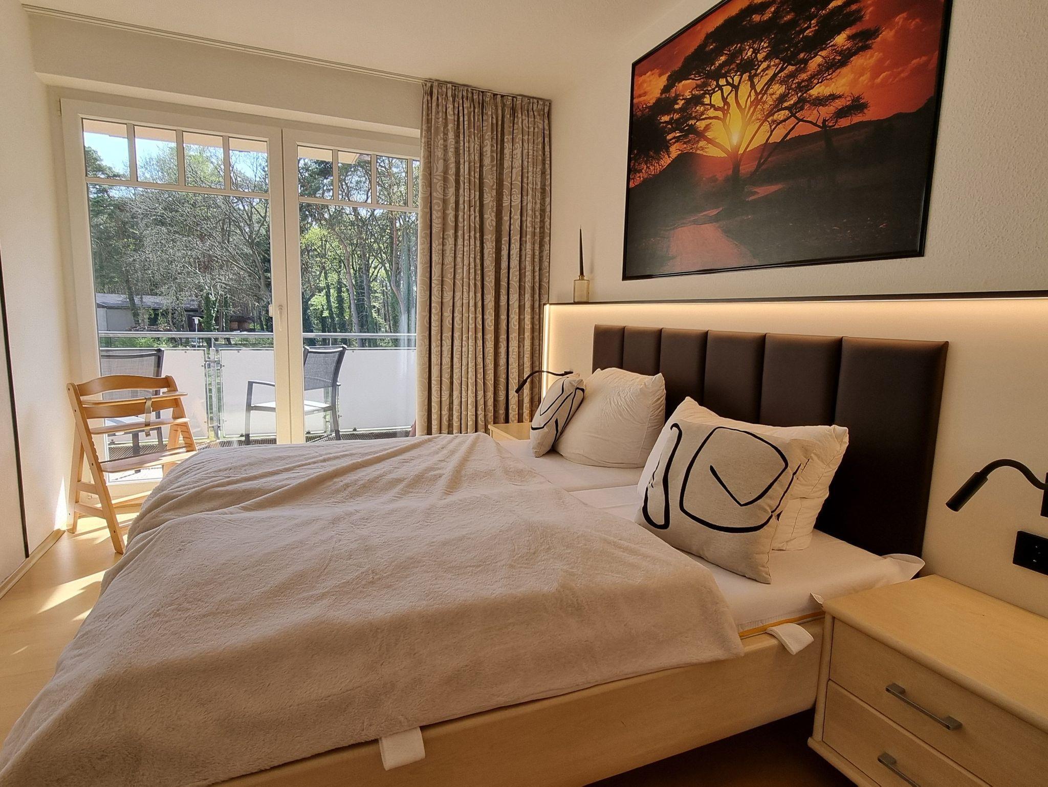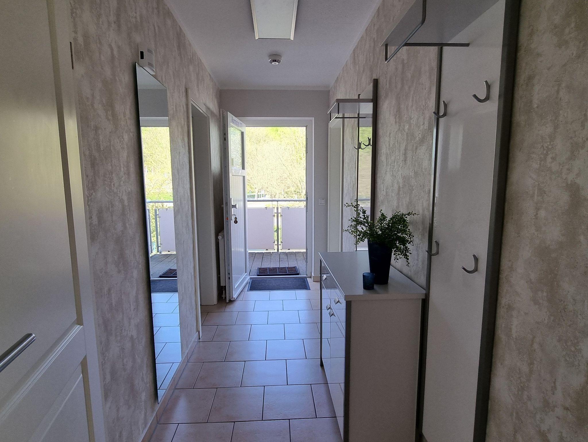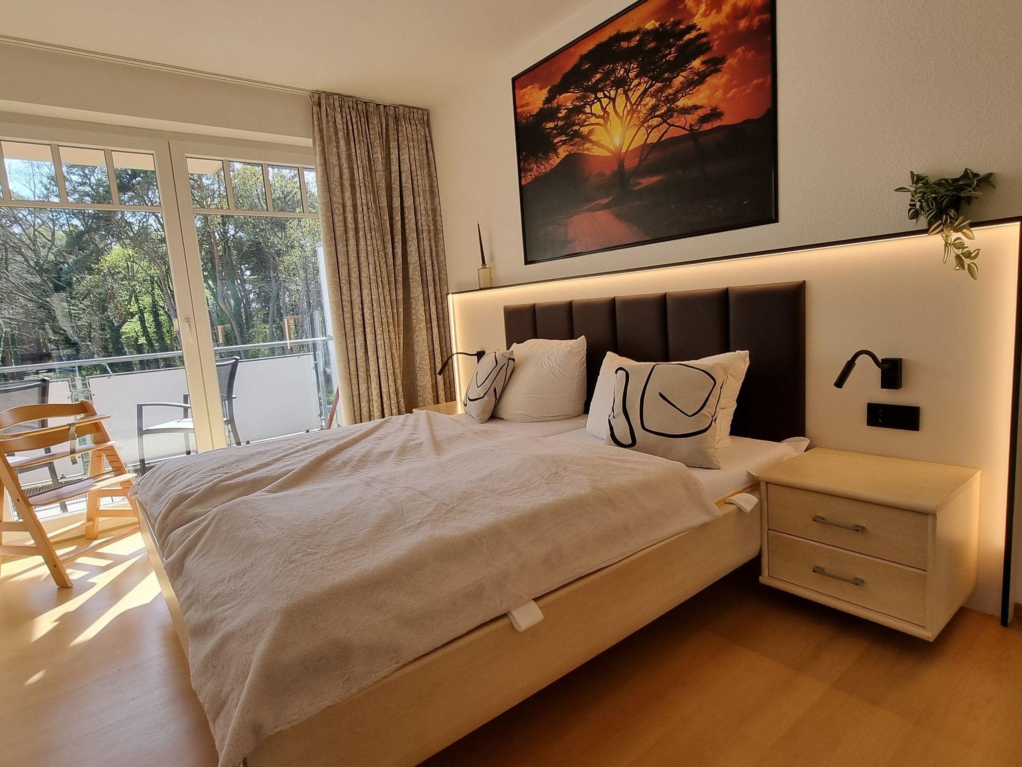 Die Ferienwohnung liegt im Obergeschoß des Ferienhauses. Sie besteht aus Wohnzimmer, kompl. ausgestatteter Küche, Schlafzimmer und Tageslichtbad. Die Ausstattung der Einbauküche ist neuwertig funktional und qualitativ hochwertig unter anderem mit Toaster, Kaffeemaschine, Backofen mit Heißluft, Kochfeld, Geschirrspüler, Gefrierfach. Großer Südbalkon mit Blick auf den Küstenwald, große Spielwiese.