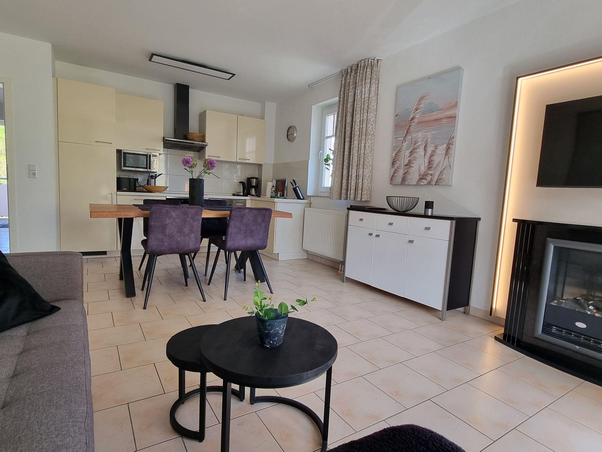 • Wohnzimmer mit off. Küche, Eßtisch, Couch, teilw. Elektrokamin