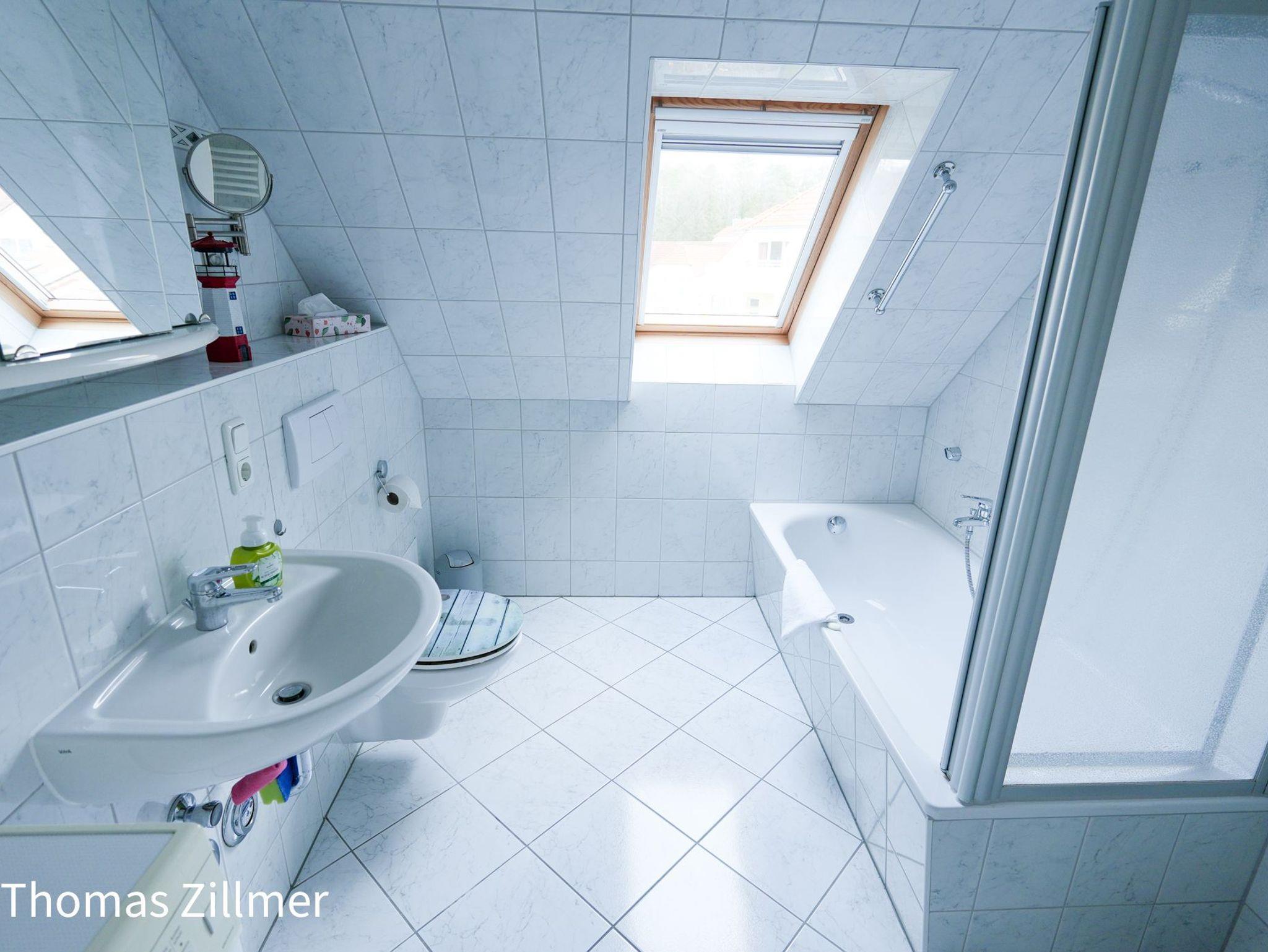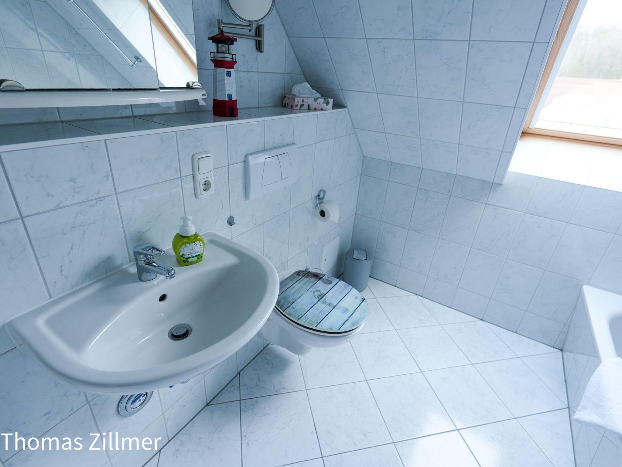 Das Bad hat ein Fenster und ist mit einer Wannendusche ausgestattet.