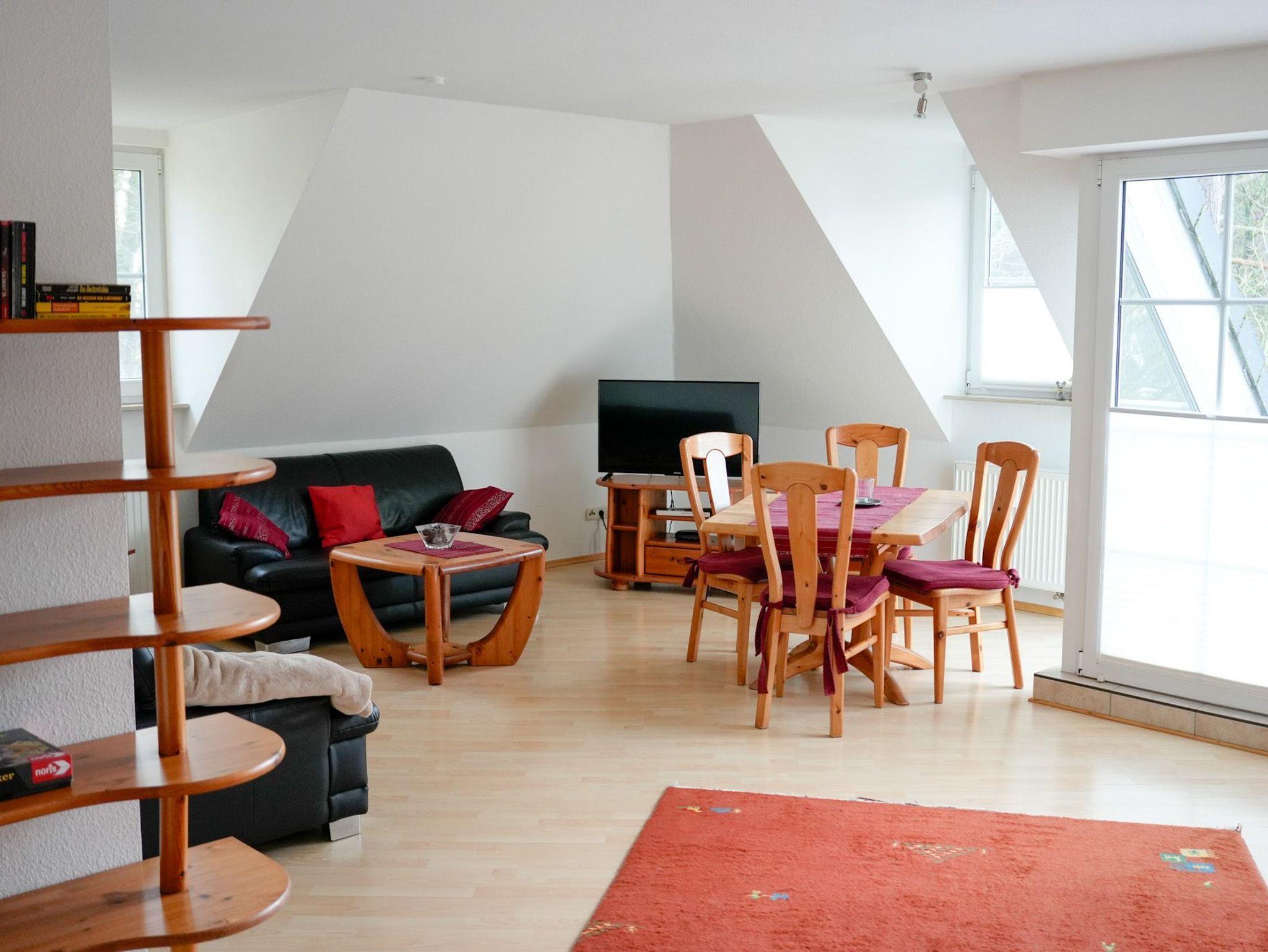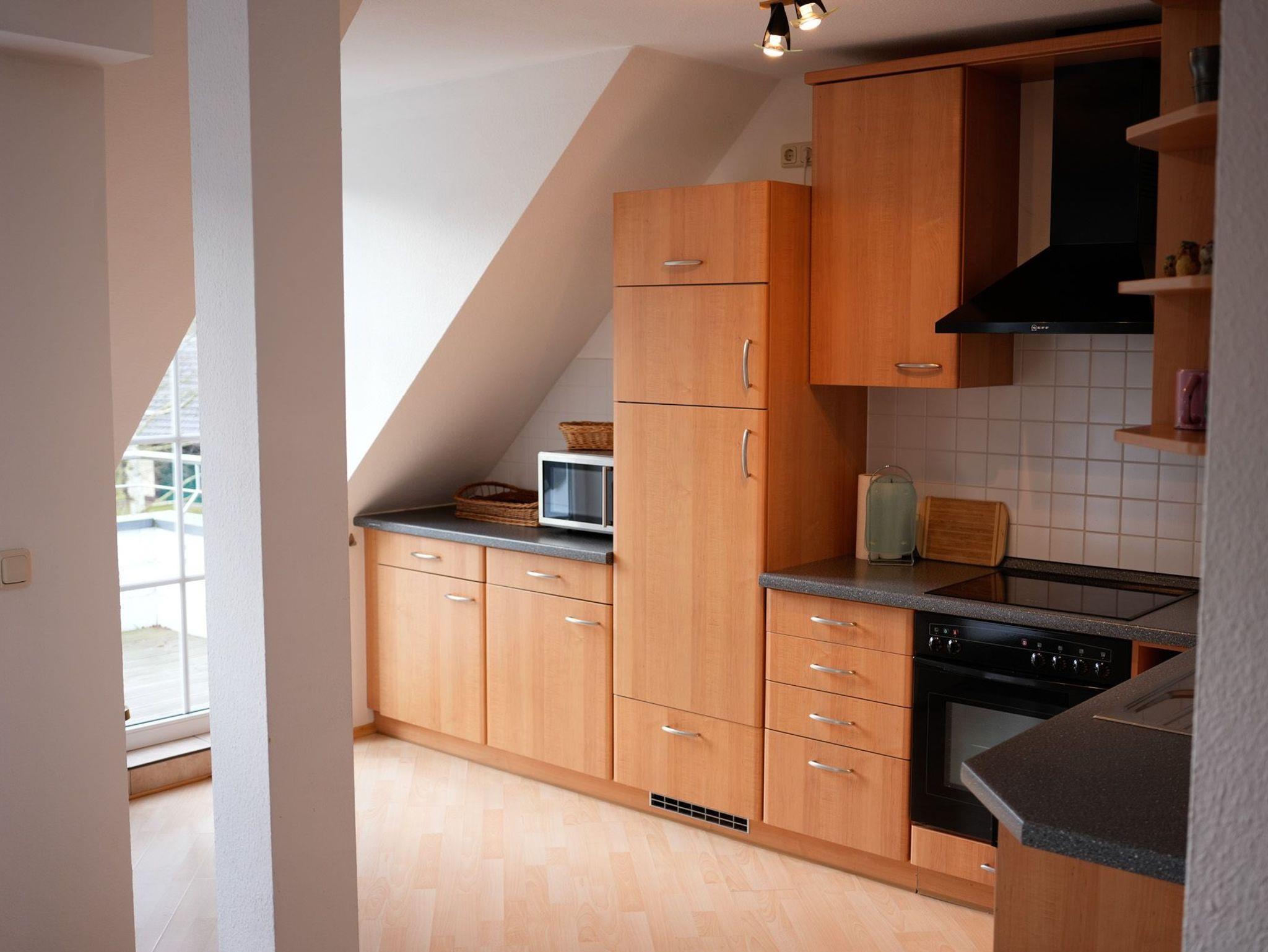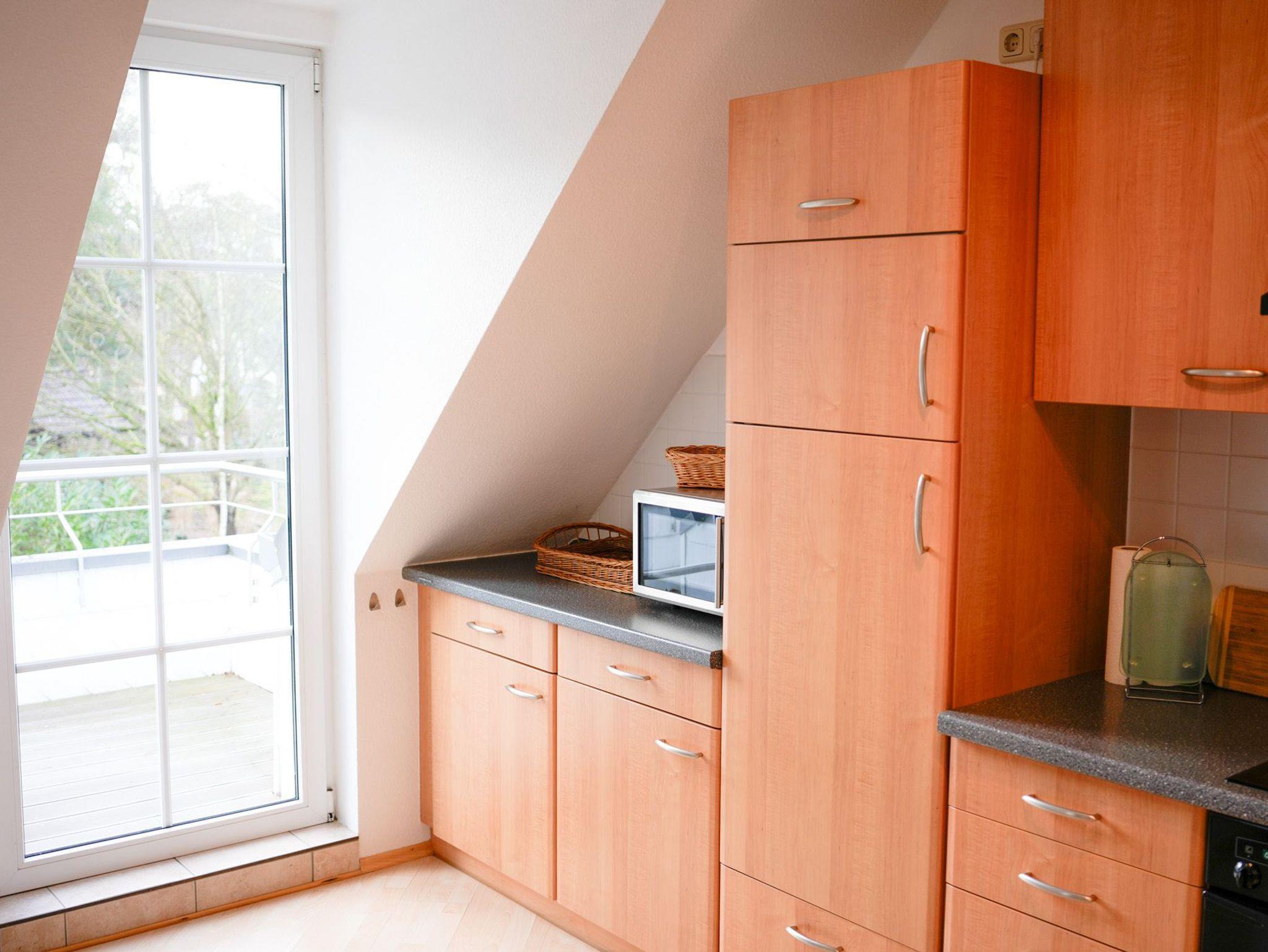 Die Fewo Gabriele ist hell, da sie nach Süden ausgerichtet und mit vielen Fenstern und einem Balkon ausgestattet ist. W-LAN / Internet ist kostenlos nutzbar.. In der unteren Ebene befinden sich eine voll ausgestattete Einbauküche, ein gemütlicher Wohn-/Essbereich, das untere Schlafzimmer mit Doppelbett und das Badezimmer mit Fußbodenheizung und Dusche. Mittels Holztreppe gelangt man in die Galerie. Dort befindet sich das zweite Schlafzimmer mit Doppelbett. Der Balkon ist mit Gartenmöbeln ausgestattet.
