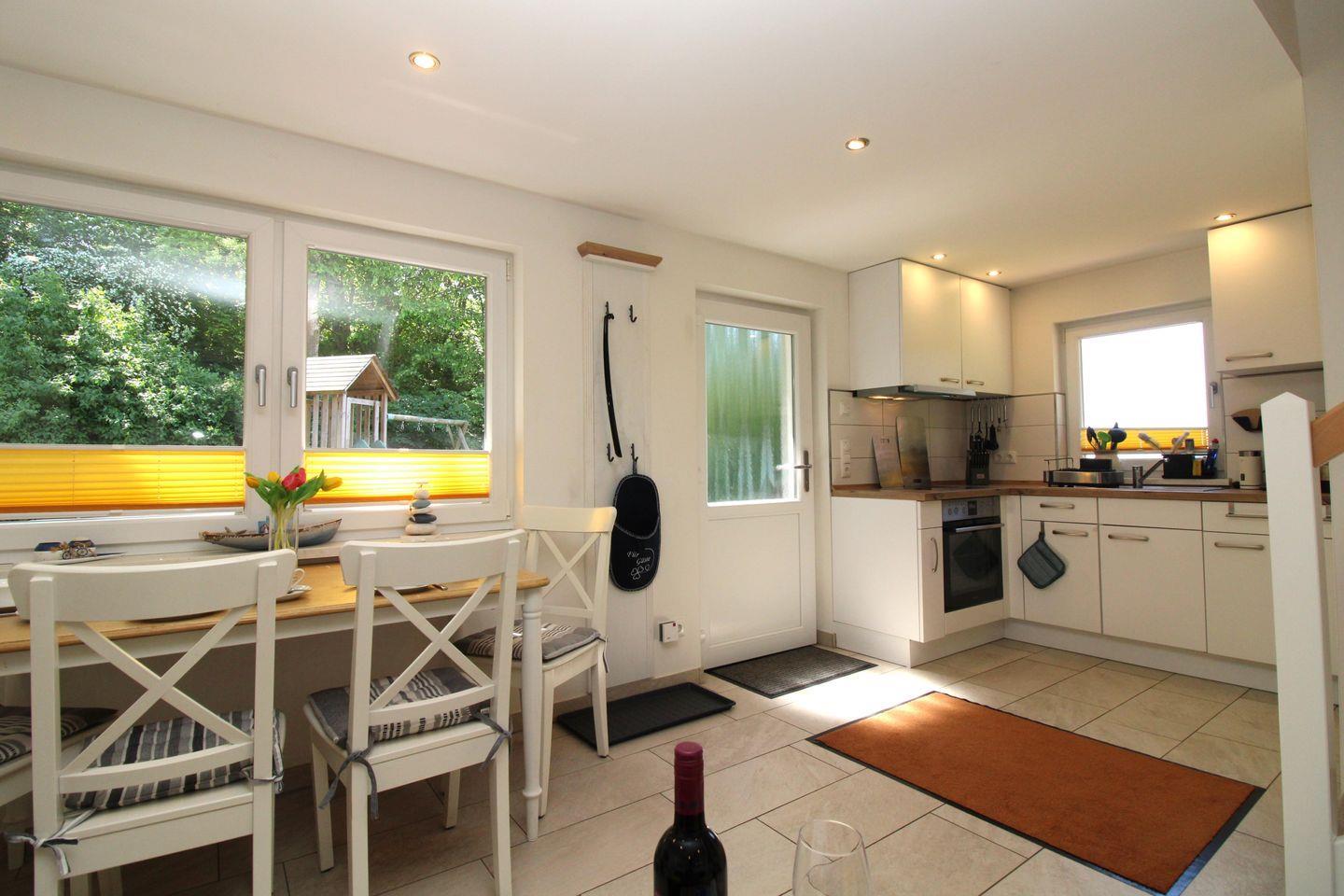 Die offene Küche beinhaltet eine voll ausgestattete Einbauküchenzeile mit 4-Zonen-Ceran-Kochfeld, Backofen, Dunstabzug, Kühlschrank mit Gefrierfach, Kaffeemaschine, Wasserkocher, Toaster und Eierkocher. Die Küche ist mit Geschirr, Gläsern, Besteck und Töpfen komplett ausgestattet. Auf der Terrasse kann mit dem vorhandenen Elektrogrill auch gerne gegrillt werden – auf Grund der umliegenden Häuser mit Reet-Bedachung ist die Nutzung eines Kohlegrills nicht möglich und untersagt!