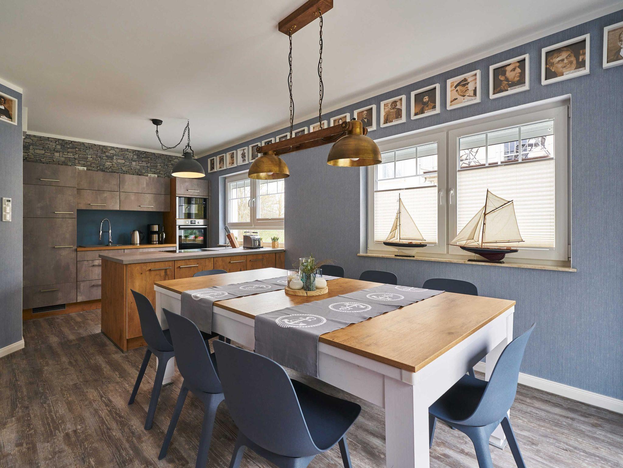 Das Haus bietet eine moderne Einrichtung im martitimen Flair. Für einzigartige und unvergessliche Ferien im Fischerdorf Freest sorgen in unseren Kapitänshäusern eine Sauna, voll ausgestattete Küche mit Ceranfeld, Backofen und Mikrowelle. Der anschließende gemütliche Wohnbereich ist ausgestattet mit einer hochwertigen Federkerncouch, Kamin, 65 Zoll HD- Fernseher und einen Billardtisch.