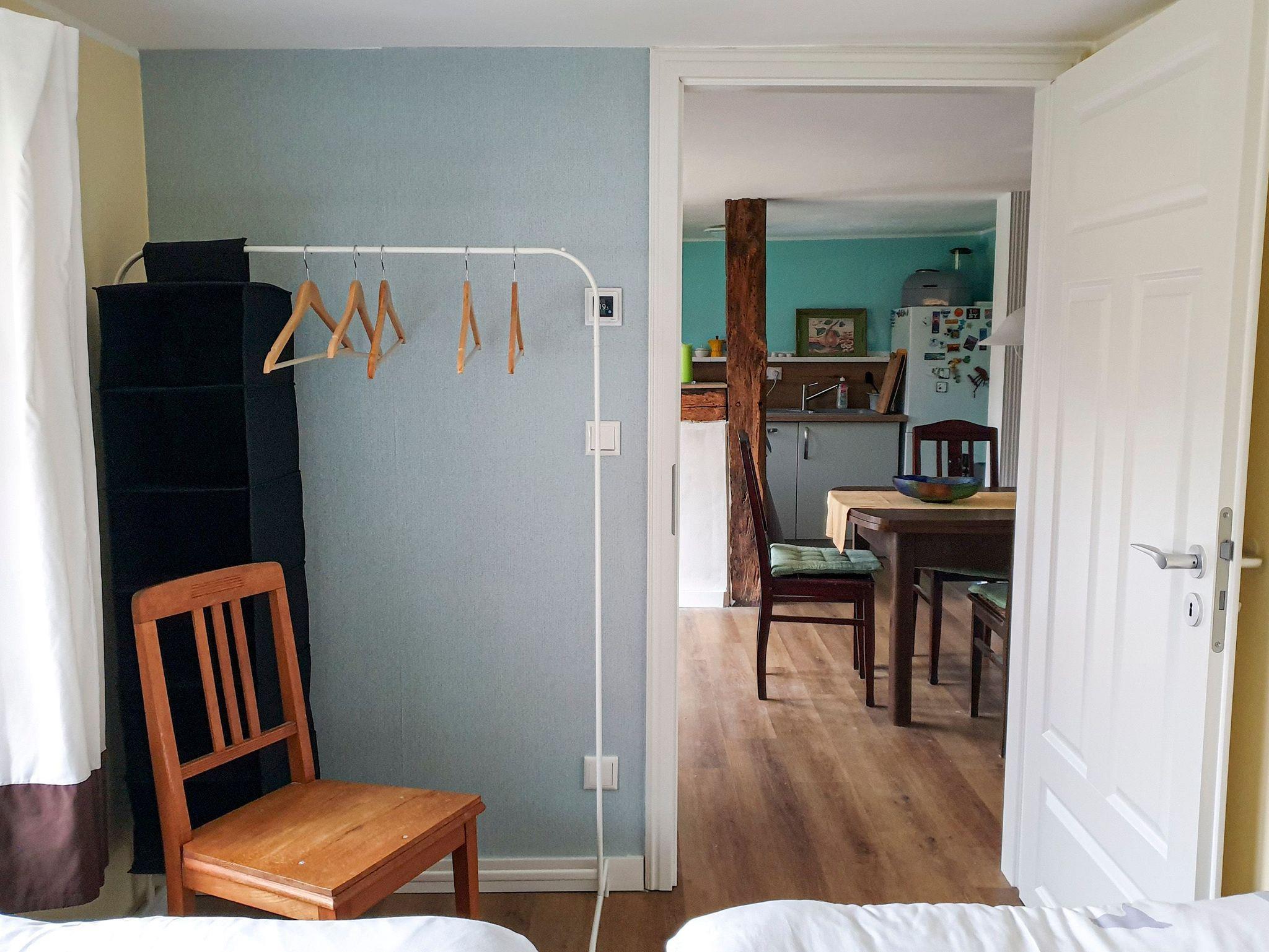 In dem etwas größeren Schlafzimmer mit Fenster nach Norden und Osten steht ein Doppelbett (160x200) mit durchgehender Matratze und auch ein Kleiderschrank. In dem kleineren Schlafzimmer, welches ein Fenster zum Garten hat, stehen zwei Einzelbetten (90x200) und ein Kleiderständer.