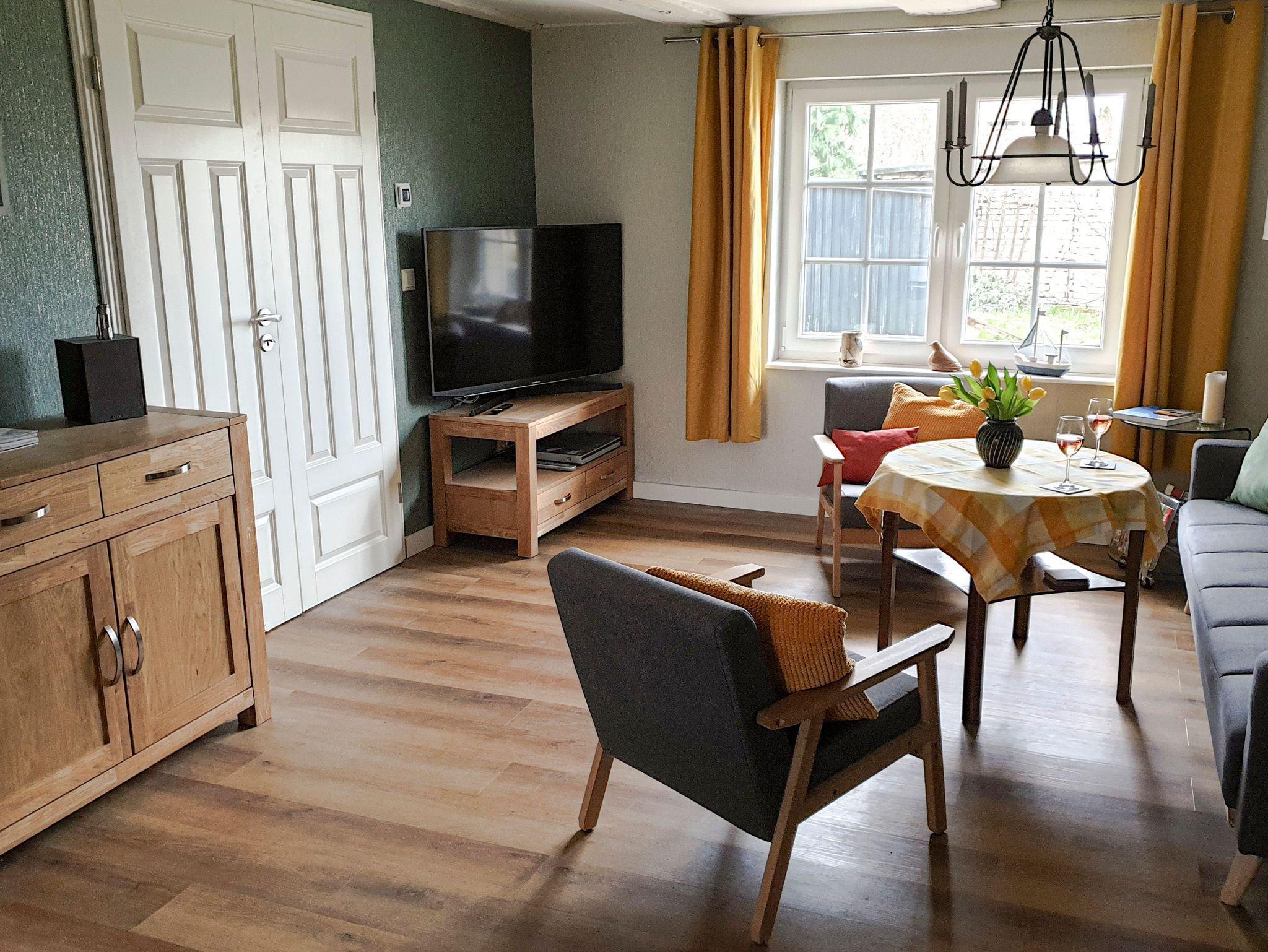 Vom Flur aus geht es durch eine schöne, zweiflüglige Tür in den großzügigen Wohnraum mit Couch, Tisch und zwei Sesseln. Außerdem findest du hier die Unterhaltungselektronik mit Smart TV, Radio, CD-Player und Plattenspieler. Ein Bluetooth-Lautsprecher steht dort ebenfalls bereit. In den Schränken findest du nicht nur Spiele für Innen und Außen, sondern auch Informationsmaterial und Unterhaltungsliteratur. Vielleicht stöberst du ja auch gern in der Vergangenheit? Dann sieh dir die Fundstücke aus der Sanierungszeit des Hauses an. In der Vitrine sind neben handgeschmiedeten Nägeln auch noch einige spannende Dokumente älter als 100 Jahre.