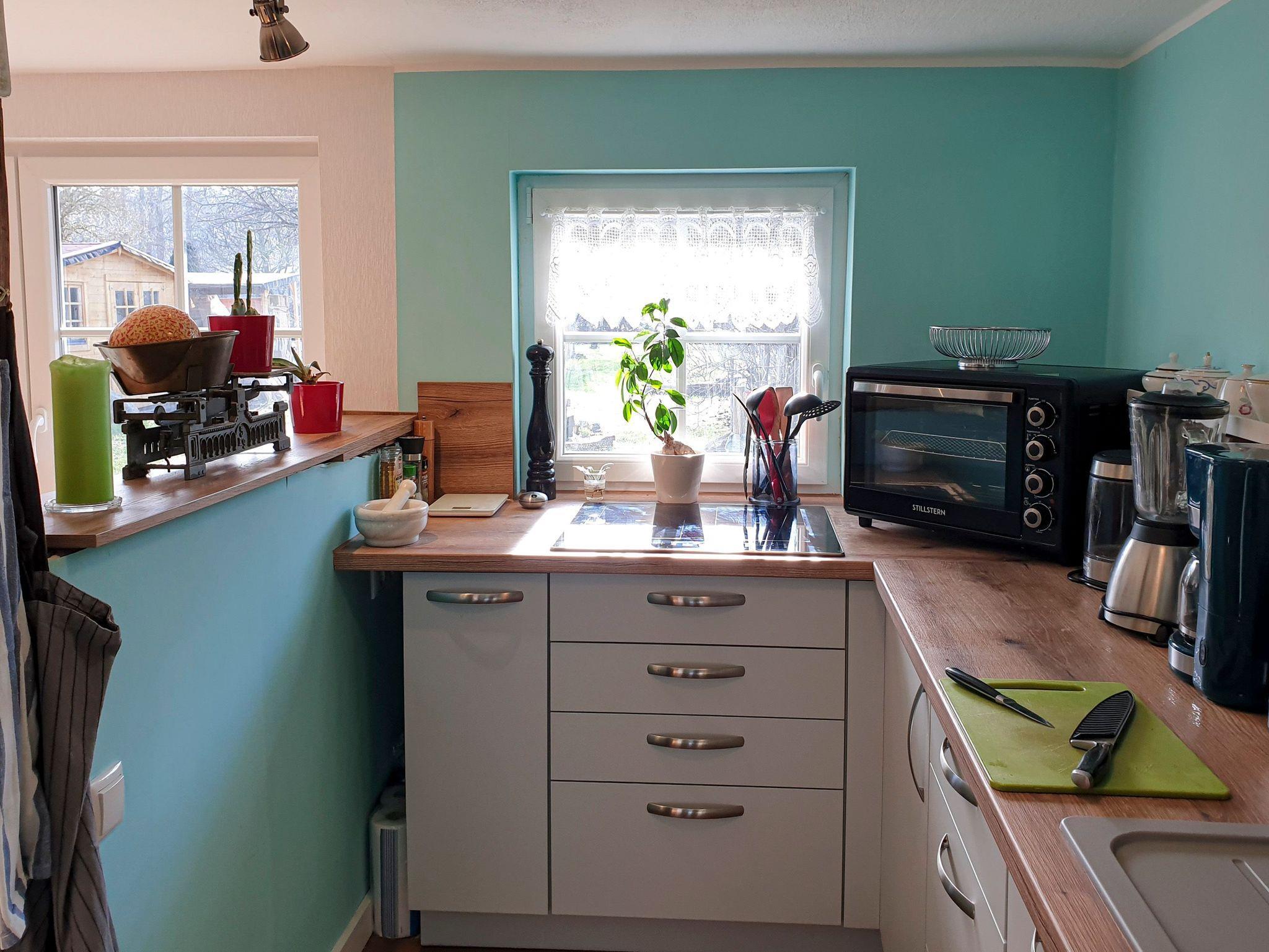 Neben dem Ess- und Spielebereich mit großem, ausziehbarem Tisch und historischen Holzstühlen geht es in die komplett und modern ausgestattete Küche. In den Schubkästen finden sich alle möglichen Besteckteile und umfangreiche Kochutensilien. Passend dazu auch die kleinen und großen Küchenhelfer Induktionsherd, Backofen, Spüle, Spülmaschine, Kühlschrank mit Gefrierteil, Handmixer, Mixstab, Standmixer, Toaster, Kaffeemaschine, Wasserkocher, Küchenwaage, historische Balkenwaage, Schüsseln, Töpfe, Pfannen, Siebe und auch eine Grundausstattung an Gewürzen.