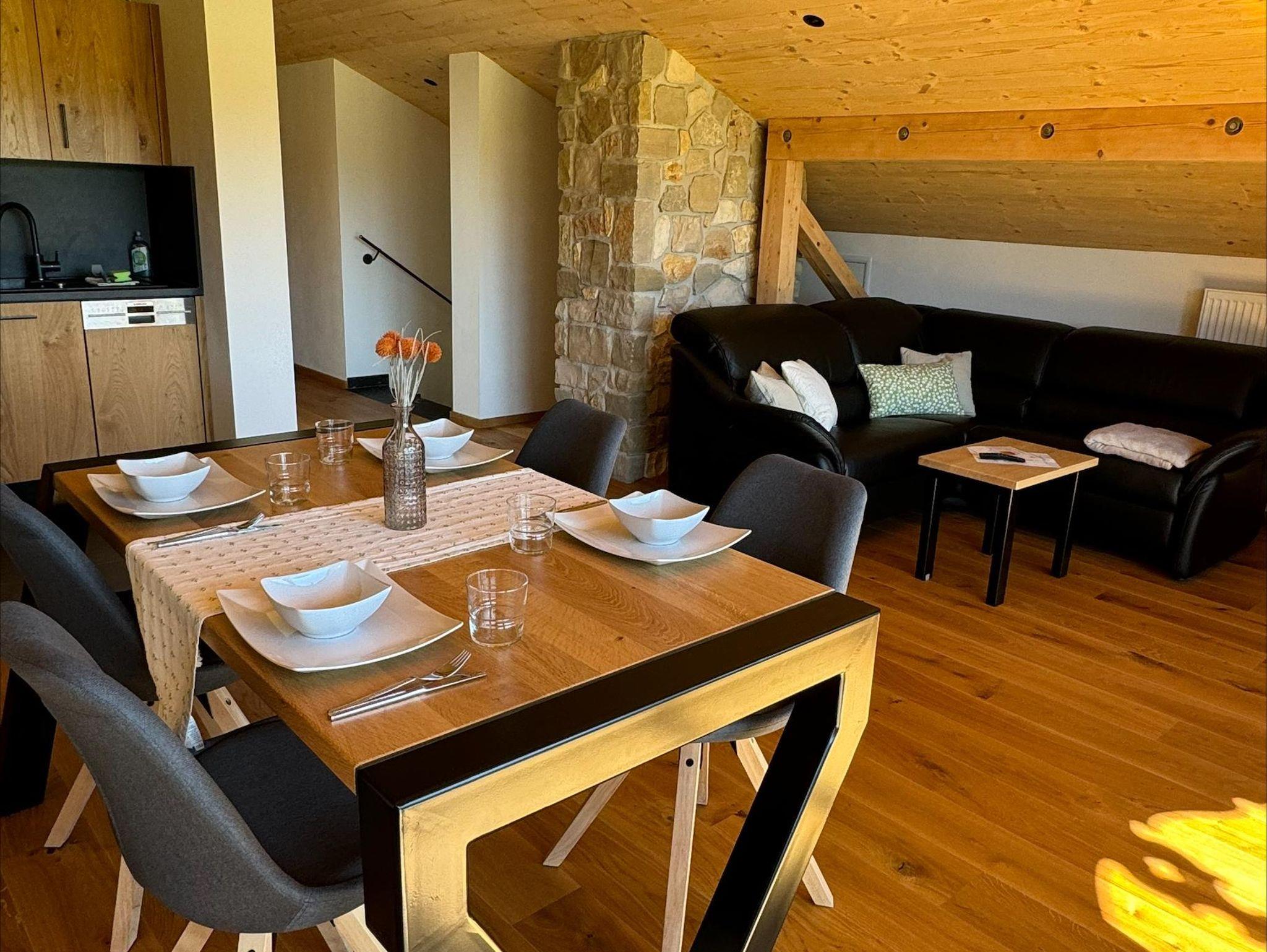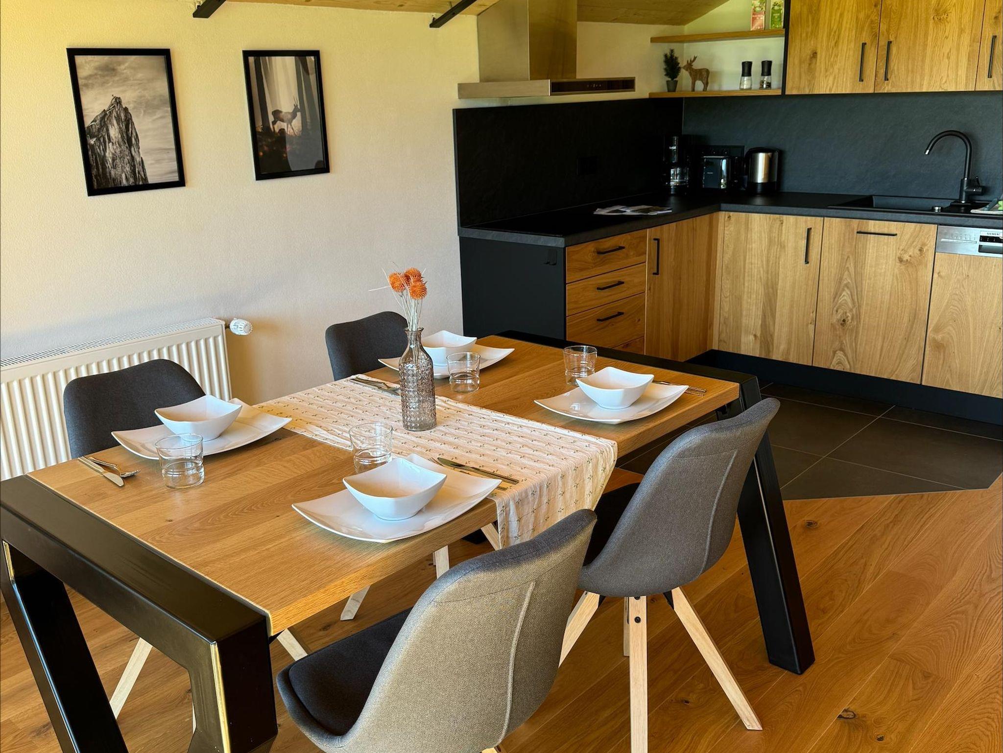 Unsere Ferienwohnung Alpspitze bietet mit einem westlich ausgerichteten Balkon traumhafte Sonnenuntergänge und einen herrlichen Ausblick auf das gesamte Karwendel- und Wettersteinmassiv inkl. Zugspitze. Die Ferienwohnung verfügt über eine geschmackvolle & rustikale Einrichtung, eine separate Küche inkl. Geschirrspülmaschine und 3-Plattenceranfeld, Flachbild-TV und kostenfreies WLan. Das Bad ist mit einem WC und einer Dusche ausgestattet. Mit einer großen Fensterfront im Wohnzimmer, haben Sie uneingeschränkten Blick auf das tolle Bergpanorama von Krün. Eine große Couch lädt zum Entspannen vor toller Bergkulisse ein. Eine Ausziehmöglichkeit der Couch ist vorhanden. Erholsamen Schlaf finden sie in einem handgefertigtem Bett aus Eschenholz. Die Couch im Wohnzimmer ist ausziehbar und bietet ein vollwertiges Bett mit Matratzengröße 160cm x 200cm. Das macht die Ferienwohnung auch für 3 Erwachsene oder Zwei Erwachsene und zwei Kinder buchbar.