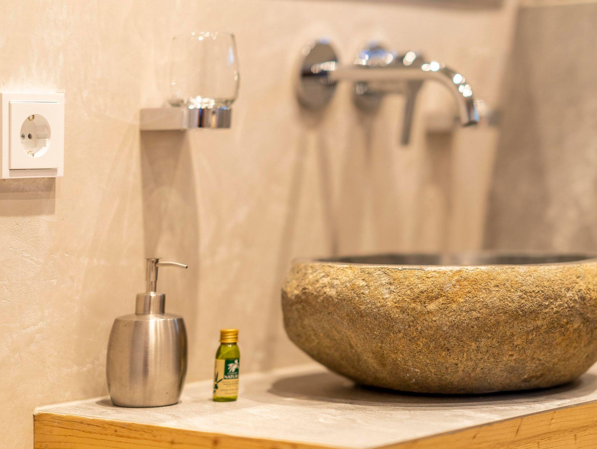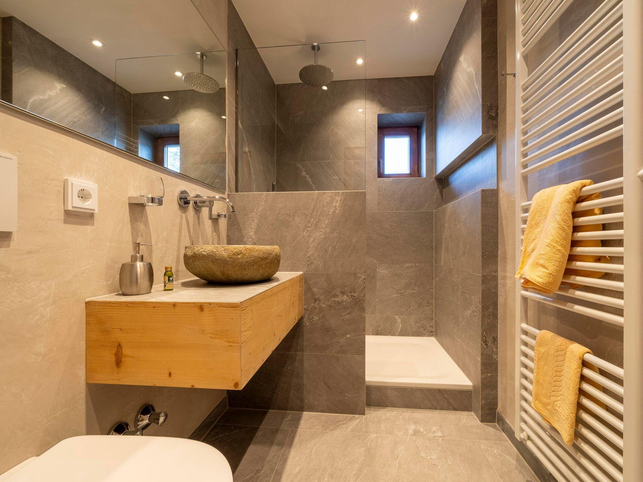 Nach einem aktiven Tag in der Natur genießen Sie pure Erholung im luxuriösen Badezimmer: Ein edles Granitsteinbecken, eine großzügige Regendusche und Naturmaterialien schaffen eine entspannende Atmosphäre.