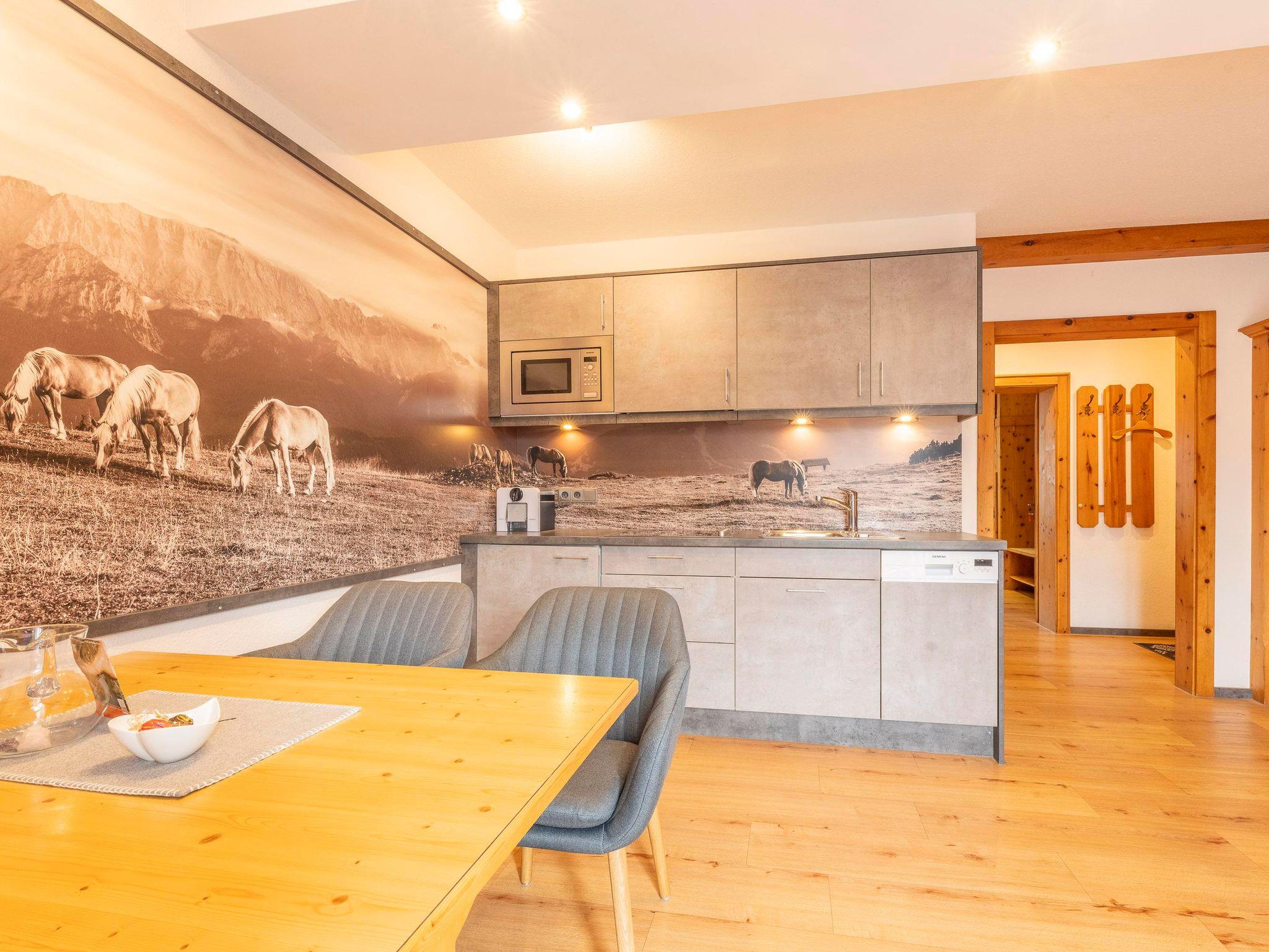 Unsere stilvolle Ferienwohnung Hufeisen verdankt ihren Namen einem ganz besonderen Blickfang: Ein großes Panoramabild in der Küche zeigt eine Gruppe Pferde auf dem Wank oberhalb von Garmisch-Partenkirchen, im Hintergrund das majestätische Wettersteingebirge – ein kraftvolles, ruhiges Motiv, das sofort Sehnsucht weckt.