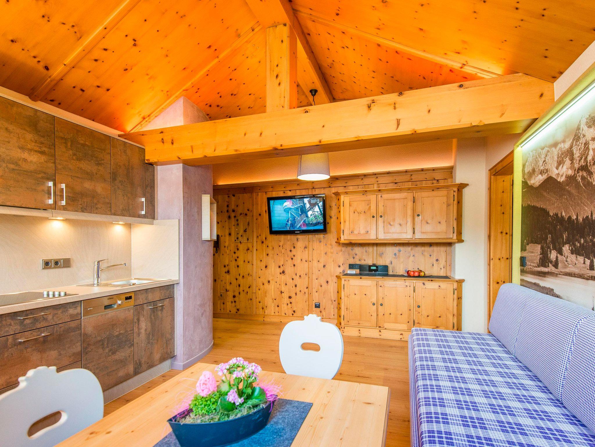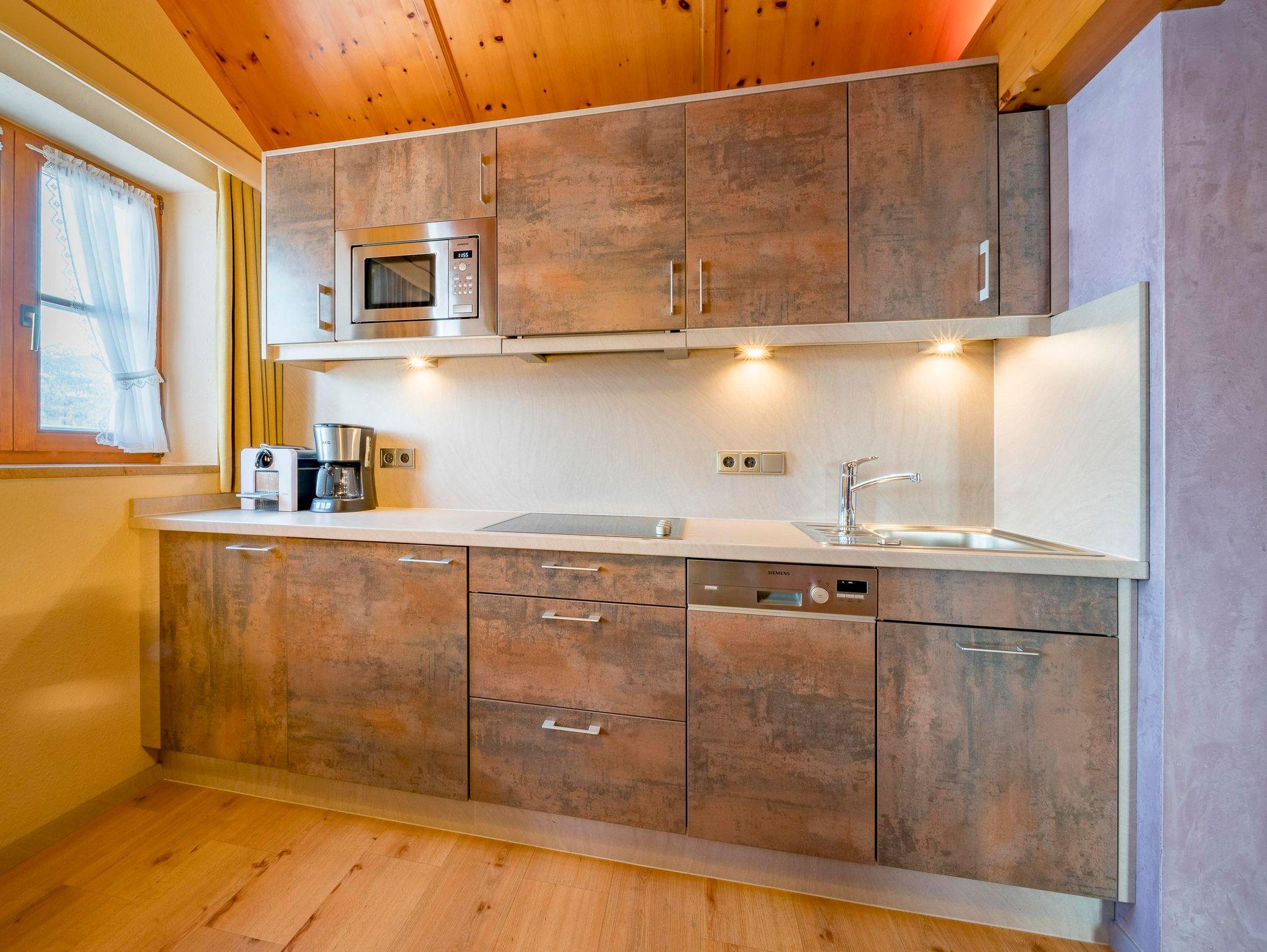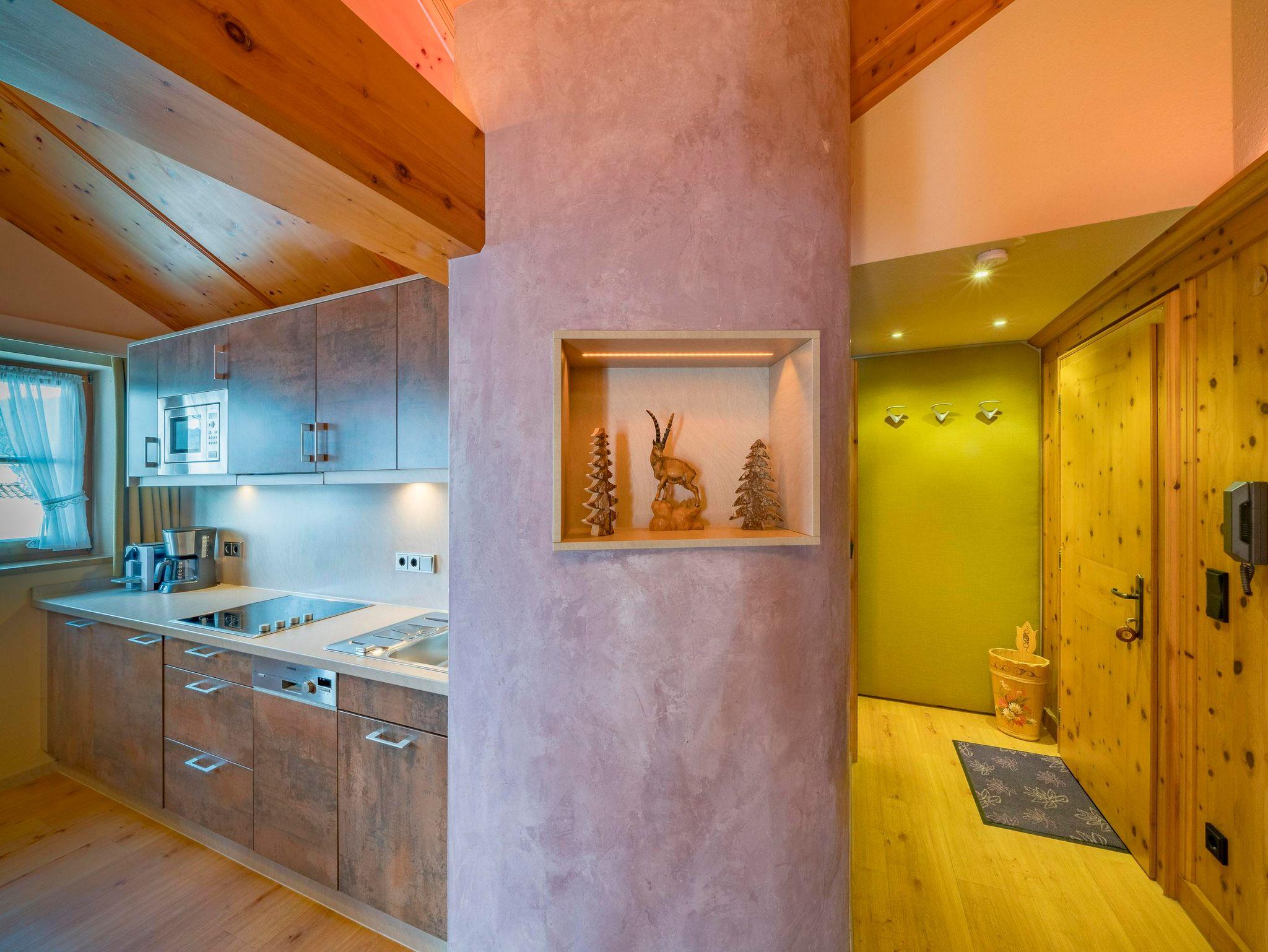 Ein echtes Highlight ist die großzügige Mansarde über dem Wohnraum, eingebettet in eine Gaube, die sich bis zum offenen Dachstuhl erstreckt. Dieses besondere Raumgefühl schafft Weite, Licht und alpine Leichtigkeit – wie ein kleiner Logenplatz mit Blick in die Berge.
