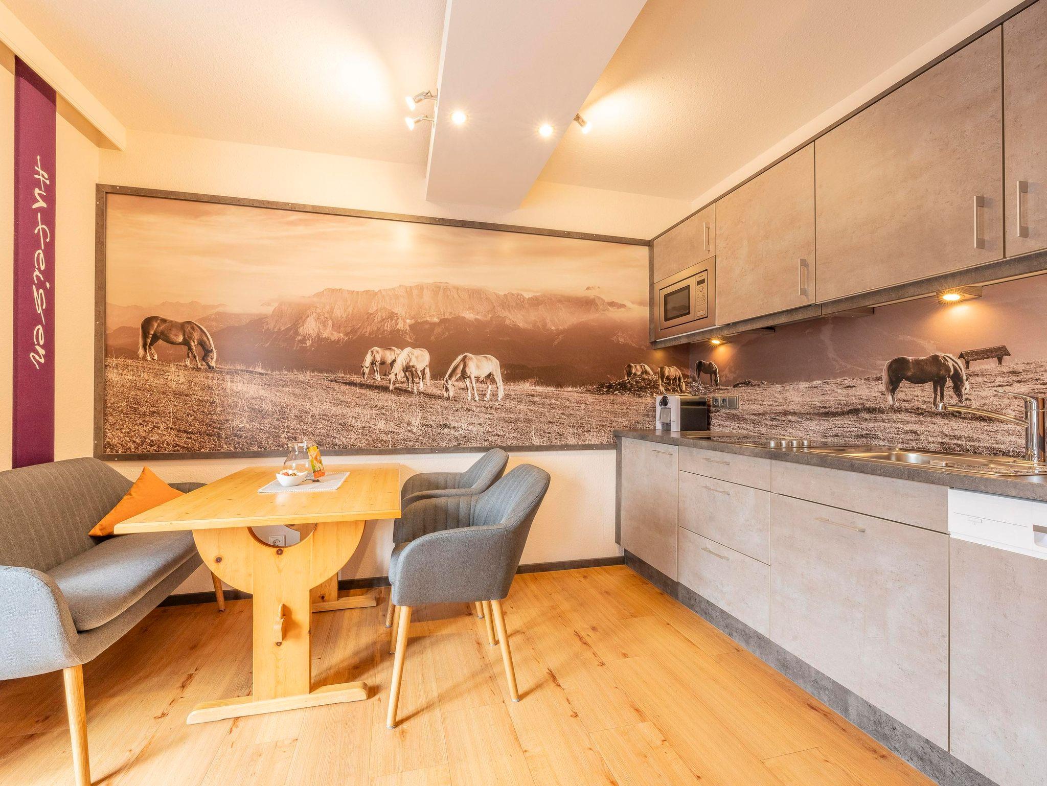 Unsere charmante Ferienwohnung Gipfelglück trägt die Liebe zu unseren Bergen im Herzen – und im Design: Stimmungsvolle Bergpanoramen zieren die Räume und lassen Sie schon beim Frühstück von neuen Gipfeln träumen.