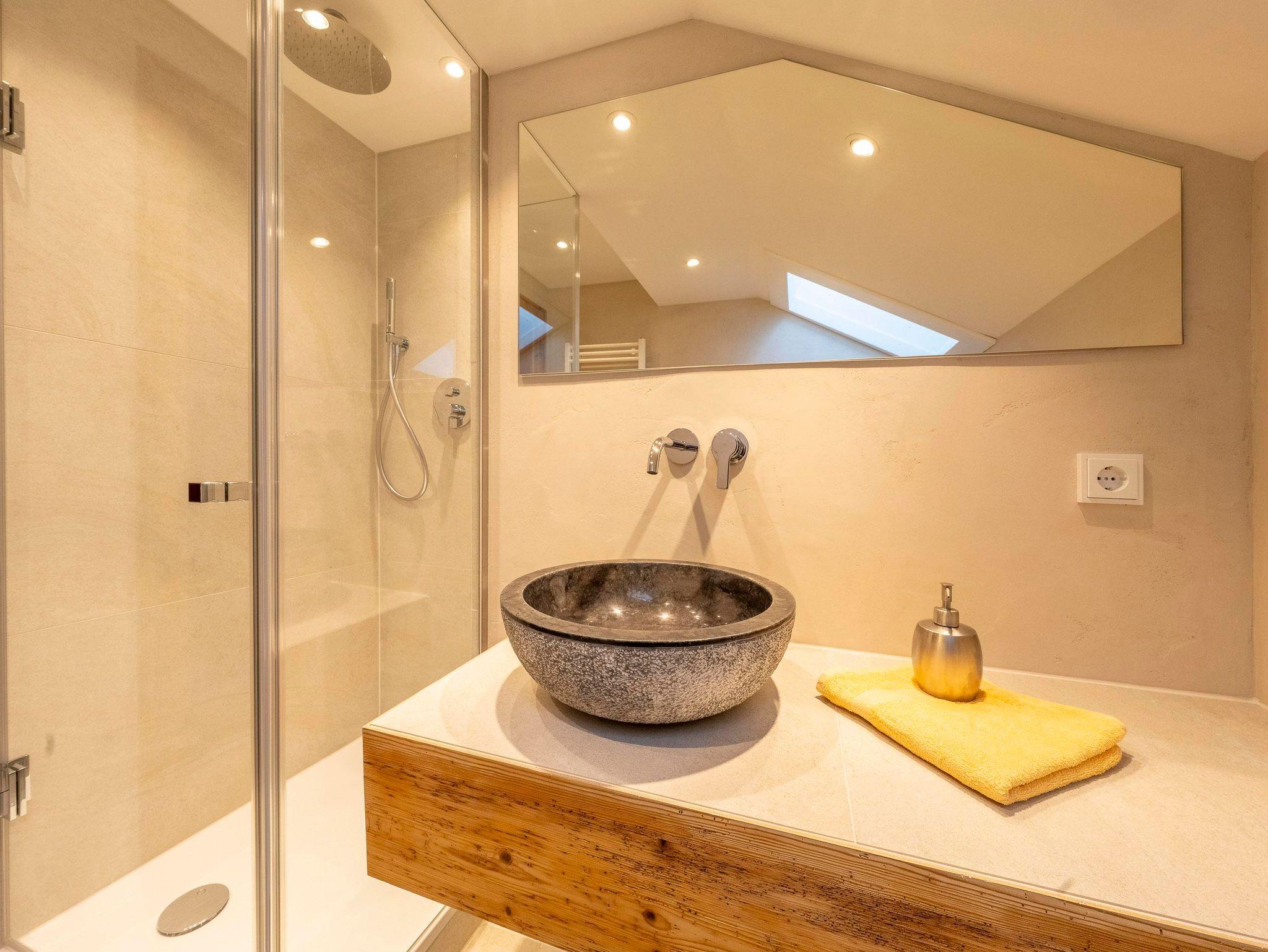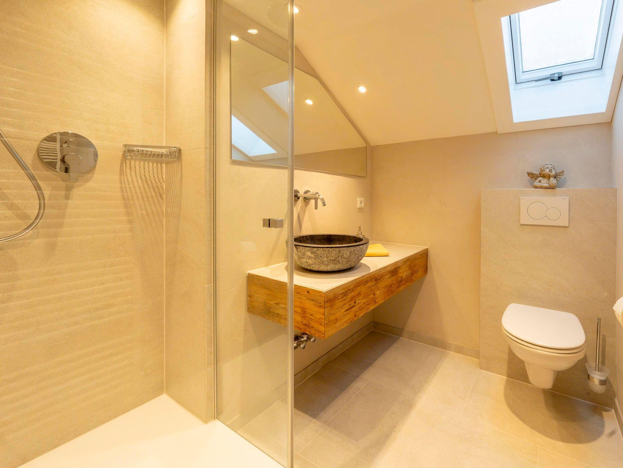 Das stilvolle Badezimmer ist mit edlen Naturmaterialien gestaltet. Eine moderne Regendusche, Naturstein und warme Töne laden zum Abschalten ein – eine Wohltat für Körper und Seele.