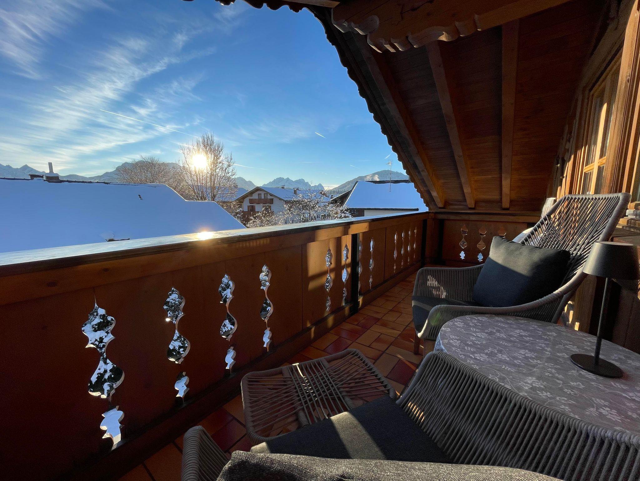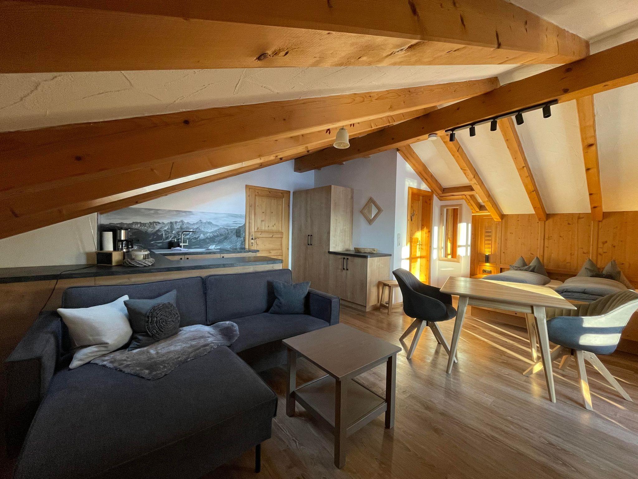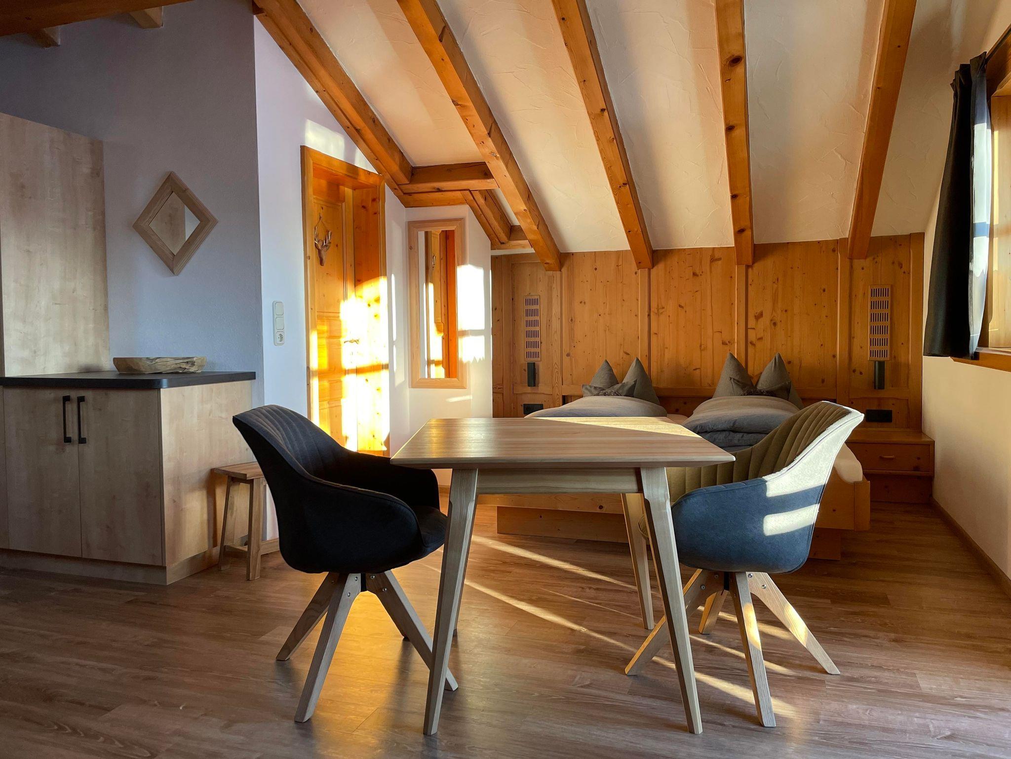 Ferienwohnung Platzhirsch: Gemütlich eingerichtete Ferienwohnung im 2. Stock für 2 Personen mit kombiniertem Wohn- Schlafraum, Südbalkon und herrlichem Gebirgsblick, Balkonmöbeln, Dusche/WC, Digitalem TV, neue Küche mit Bergblick und Spülmaschine.