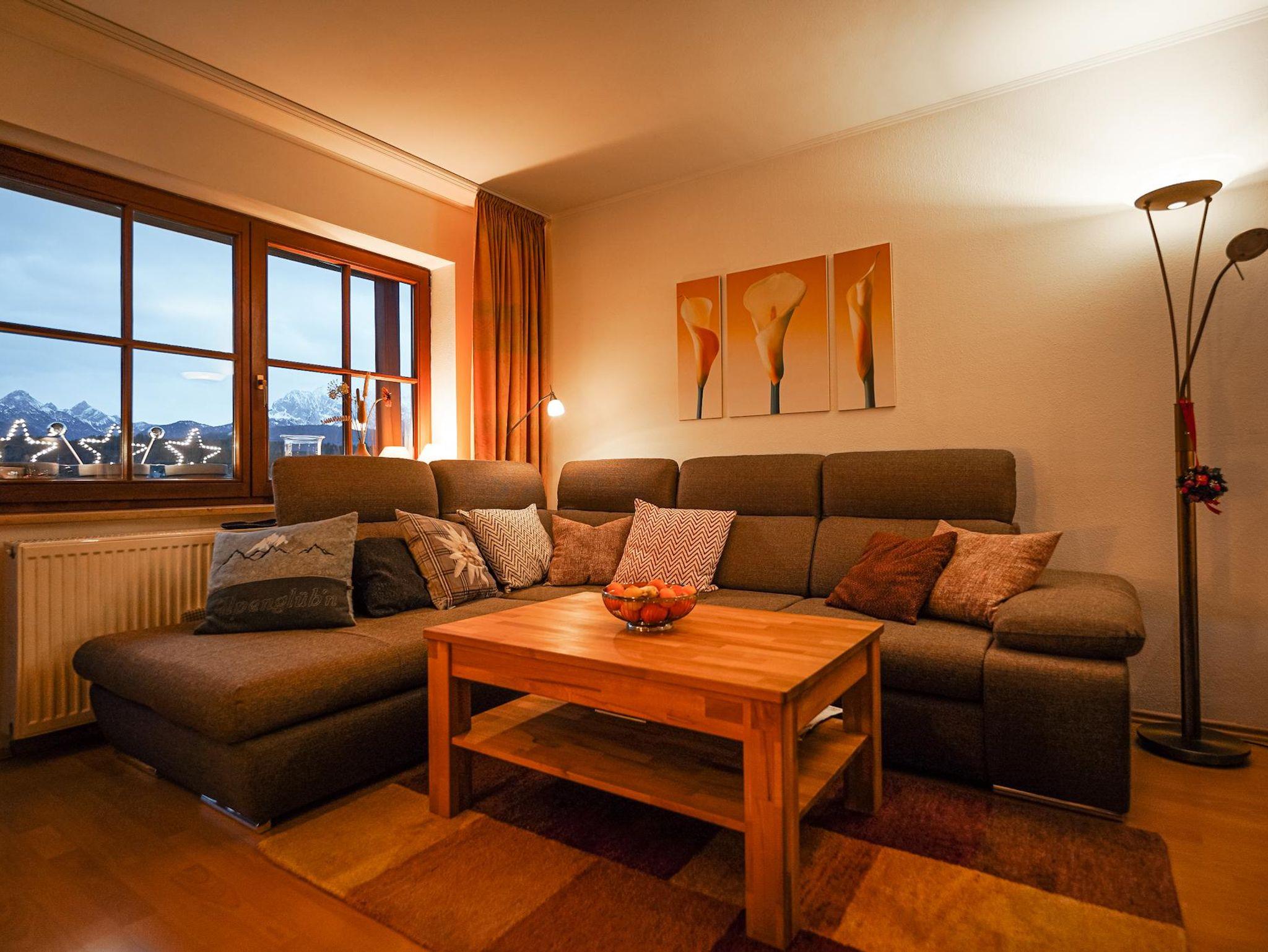 Die gepflegte 3-Zimmerwohnung im ersten Stock im Haus Abendsonne mit unverbautem. grandiosen Panoramablick auf die umliegenden Berge verfügt über zwei separate Schlafzimmer und ein großes Wohnzimmer mit Couch/Schlafcouch.