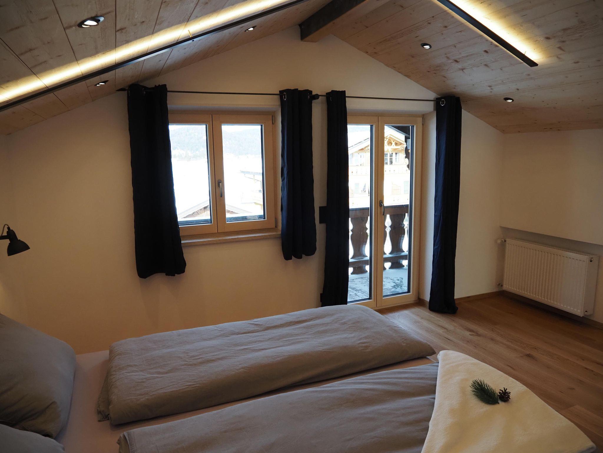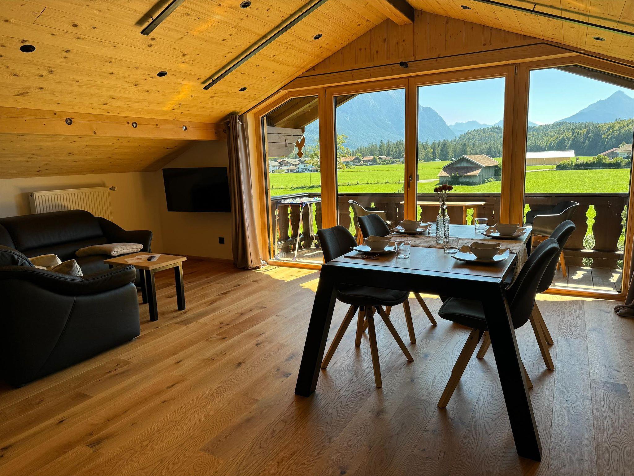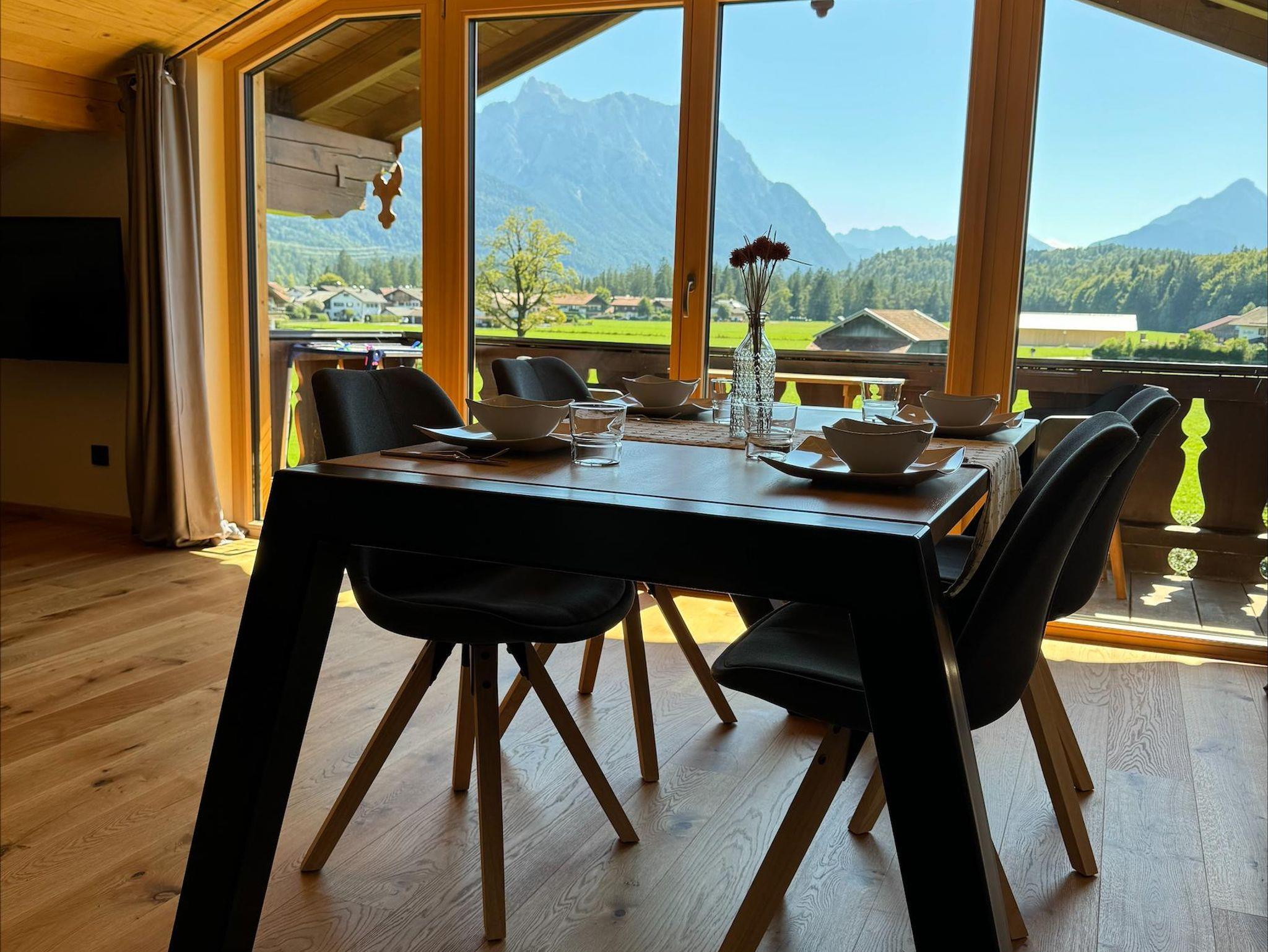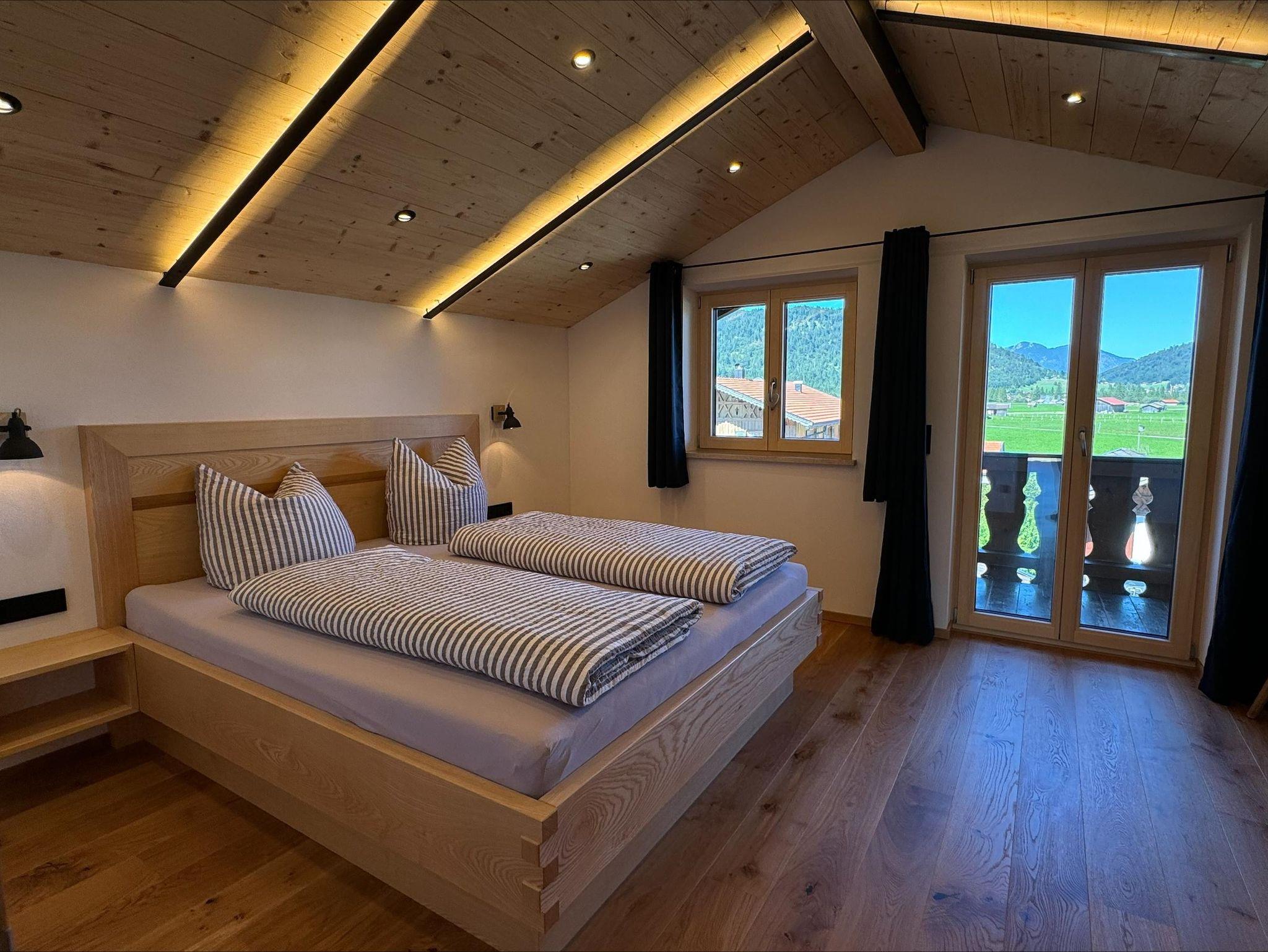 Unsere Ferienwohnung Arnspitze ist das Juwel unseres Hauses. Lassen Sie sich von dem herrlichen Ausblick auf das Karwendel- und Wettersteinmassiv verzaubern. Wir bieten Ihnen eine geschmackvoll eingerichtete Wohnung mit moderner Küche inkl. Geschirrspülmaschine und 4-Plattenceranfeld mit Dunstabzugshaube, einer hochwertigen Ledercouch, einem Flachbild-TV, Essecke, kostenfreiem WLan sowie einem Süd- als auch einen Nordbalkon. Besondere Akzente setzten wir in unserer Wohnung Arnspitze mit einer edel beleuchteten Fichtenholzdecke mit dezenten Elementen aus Schwarzstahl. Einen erholsamen Schlaf bietet ein handgemachtes Bett aus Eschenholz.