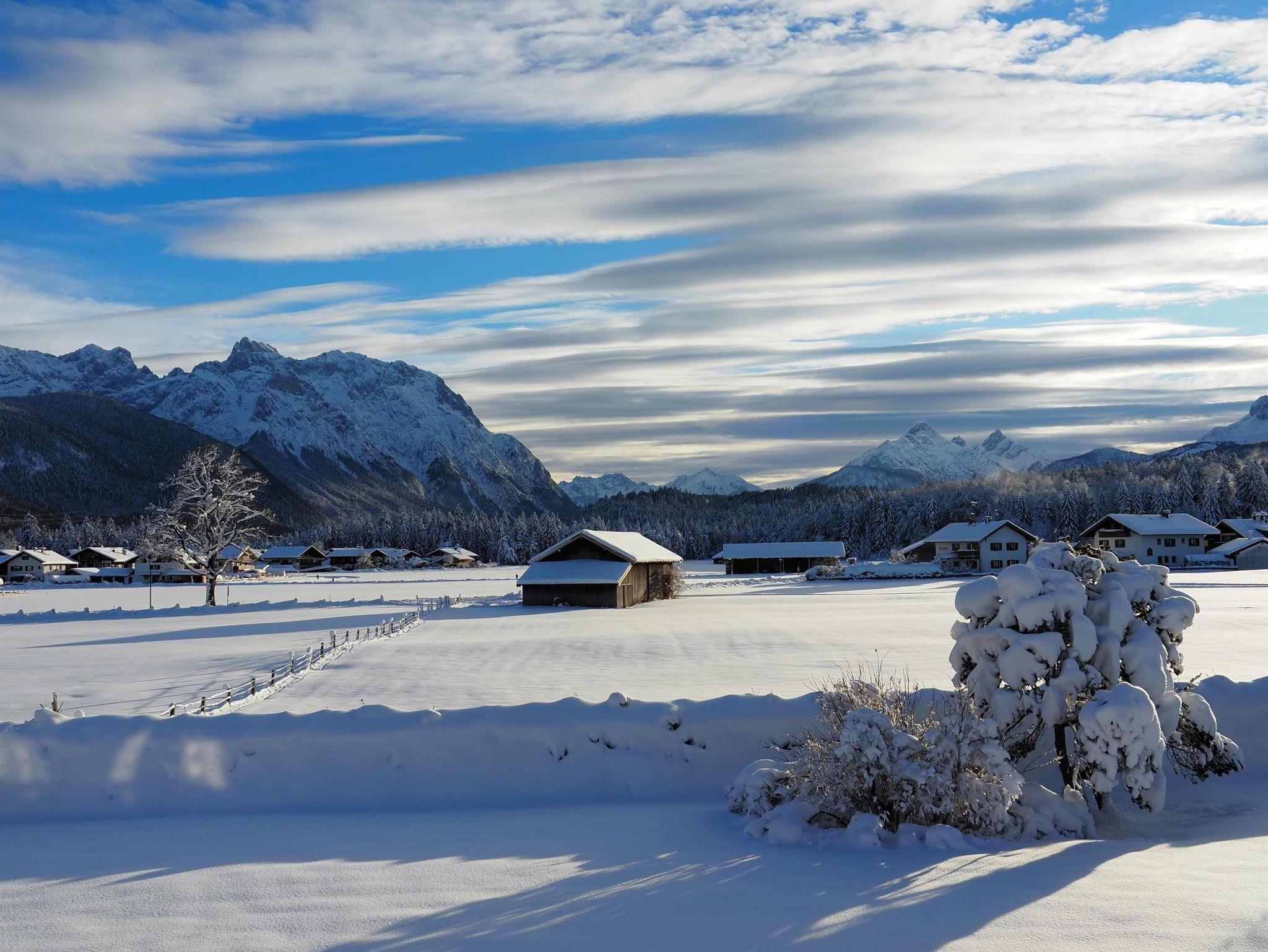 Unsere frisch renovierten Ferienwohnungen mit Blick auf das gesamte Karwendel- und Wettersteingebirge liegen in zentraler und ruhiger Lage im Herzen von Krün. Freuen Sie sich auf einen Balkon mit Ausblick auf eine atemberaubenden Bergkulisse, kostenfreies WLAN und Privatparkplätze am Haus.