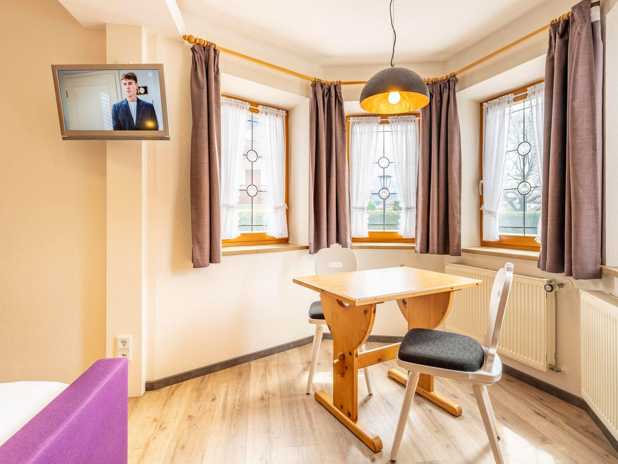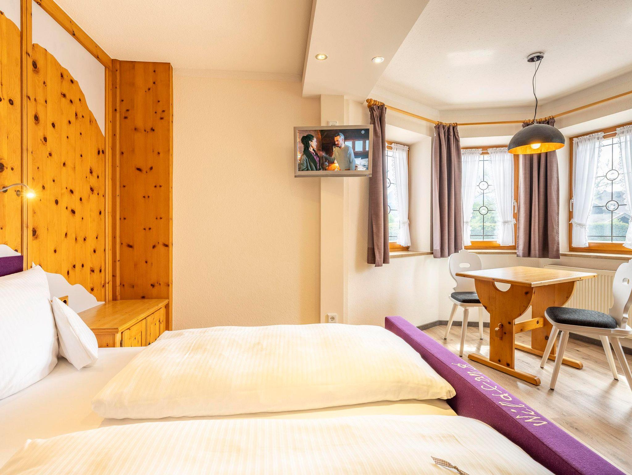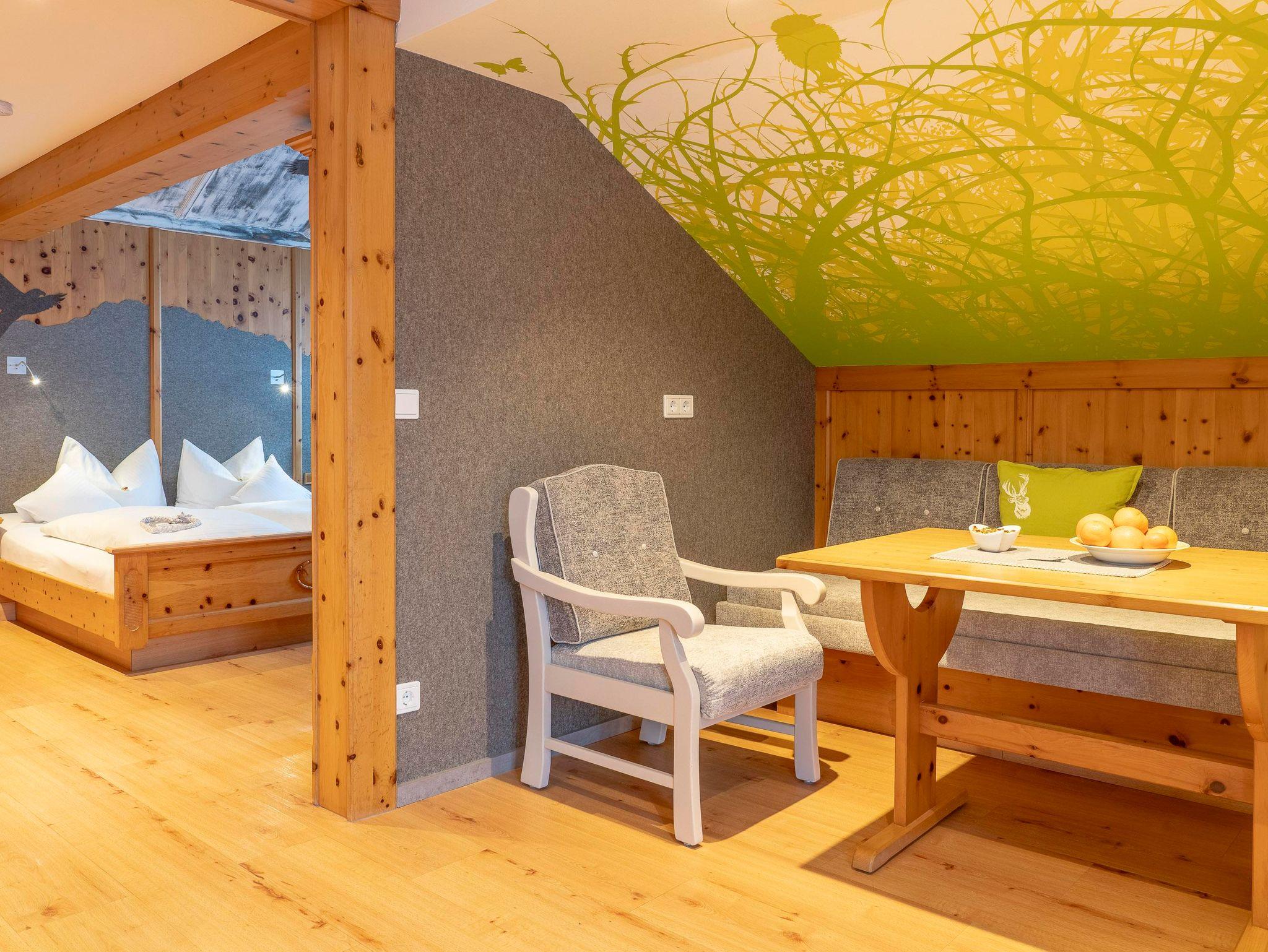 Ein echtes Schmuckstück ist das gemütliche Lodenbett, das von Gämsen eingerahmt wird – ein Ort zum Träumen, Ausruhen und einfach Wildsein im besten Sinne. Für romantische Stunden zu zweit lädt ein kleiner Erker mit Tisch und Stühlen zum Verweilen ein – mit Blick nach draußen und viel Gefühl für Details.