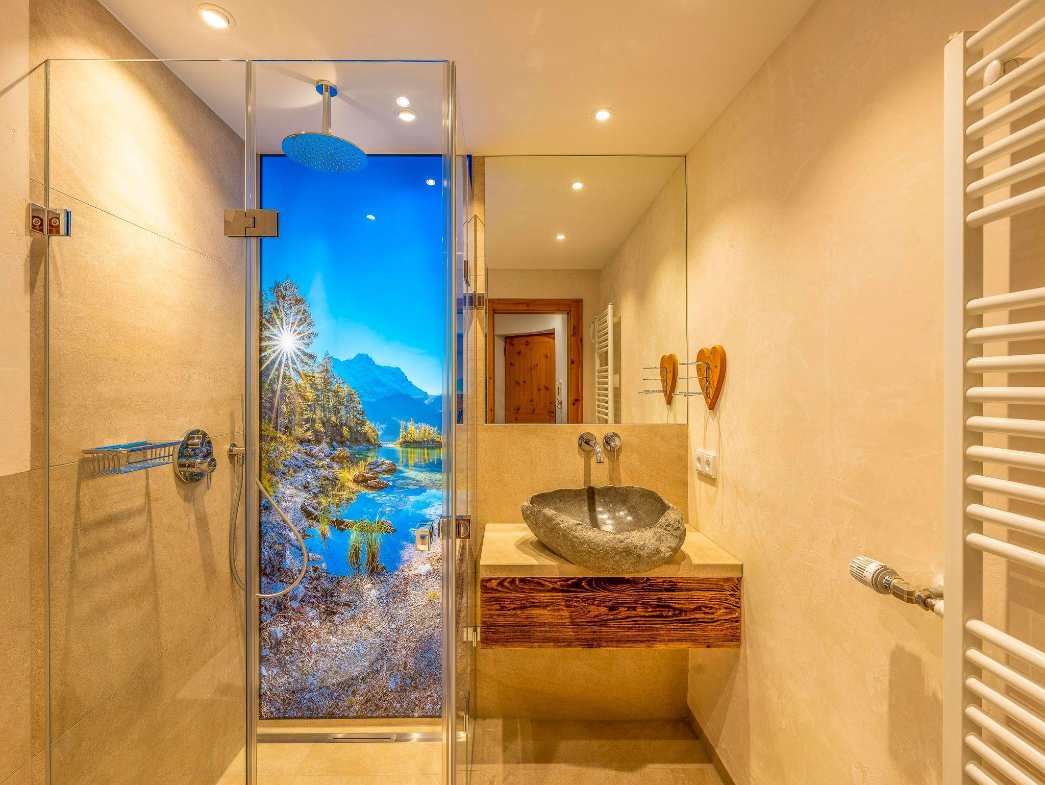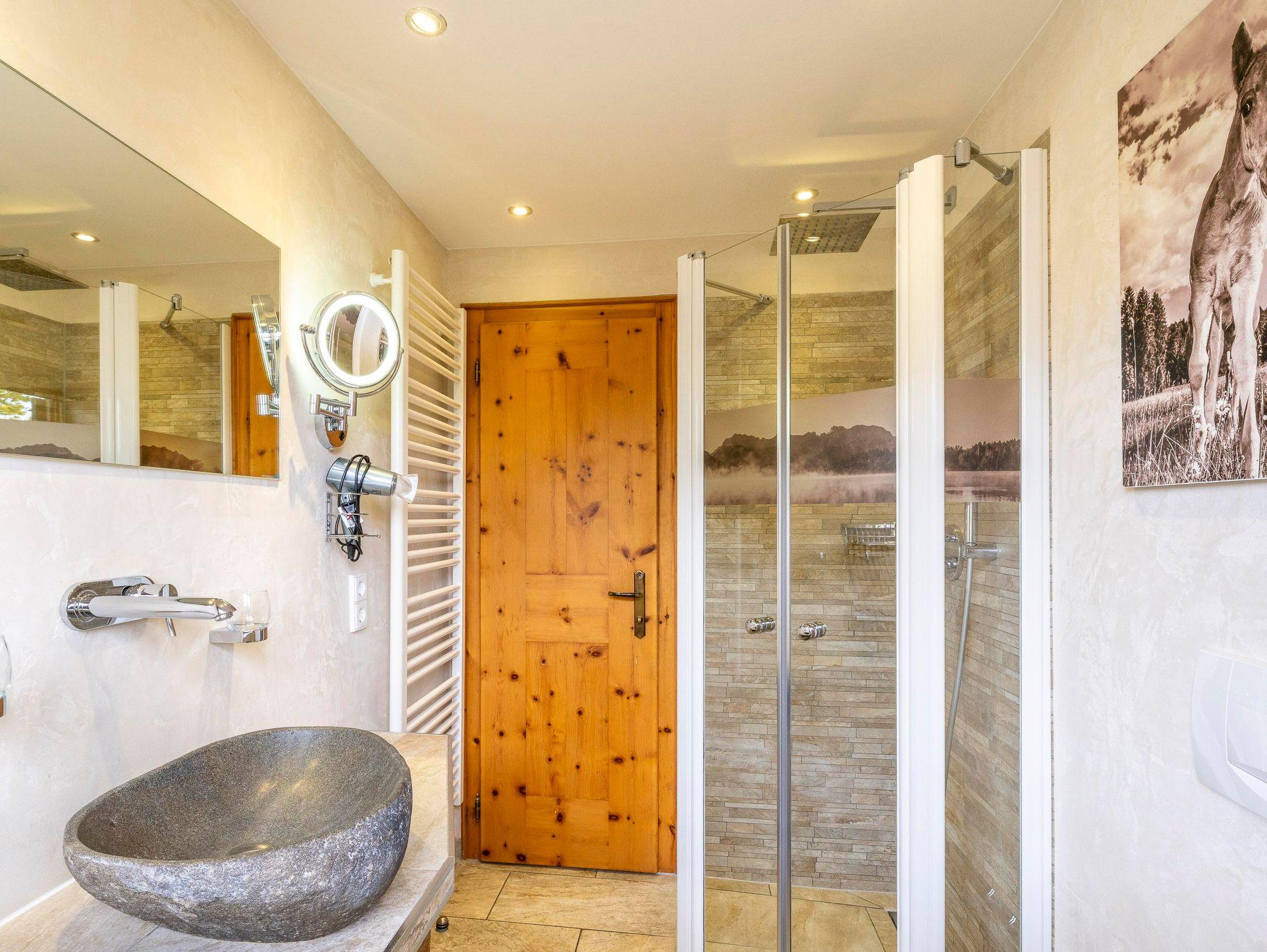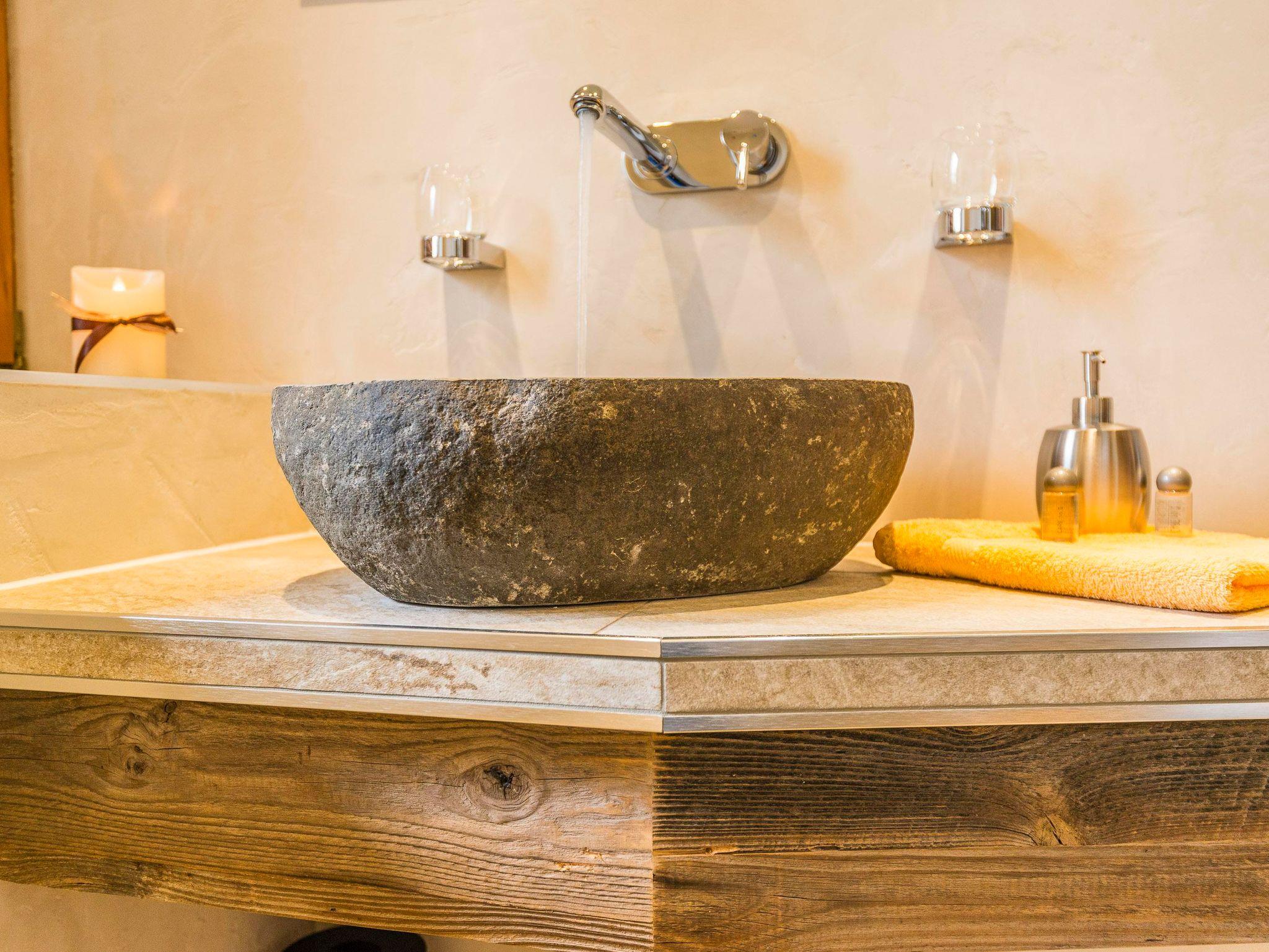 Das stilvolle Badezimmer überzeugt mit einem edlen Granitstein-Waschbecken und einer ebenerdigen Regendusche – modern, hochwertig und absolut entspannend.