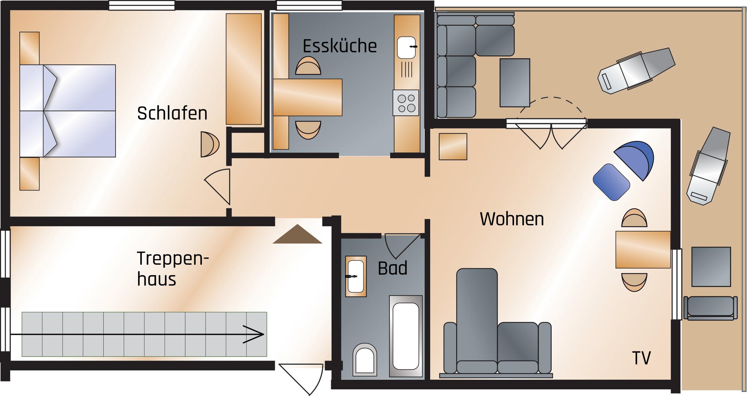 Vom Eingang kommen Sie in den Flur mit Garderobe. Hier zweigt das Badezimmer mit Badewanne und WC ab. Gegenüber befindet sich die separate, komplett eingerichtete Küche mit Spülmaschine und Cerankochfeld und Backofen. Ein gemütlicher Essplatz befindet sich ebenfalls in der Küche. Im Wohnbereich fällt gleich das große Panoramafenster ins Auge. Hier befindet sich auch ein Esstisch direkt am Fenster. Zudem gibt es einen gemütlichen Lesesessel, sowie ein Sofa zum entspannen. Die Loggia mit Loungemöbeln und der angrenzende Balkon sind über eine Türe erreichbar. Dieser Bereich kann durchaus als besonderes Highlight bezeichnet werden. Das Schlafzimmer ist mit einem neuen Boxspringbett (180x200cm), sowie einem großen Kleiderschrank mit Schiebetüren ausgestattet.