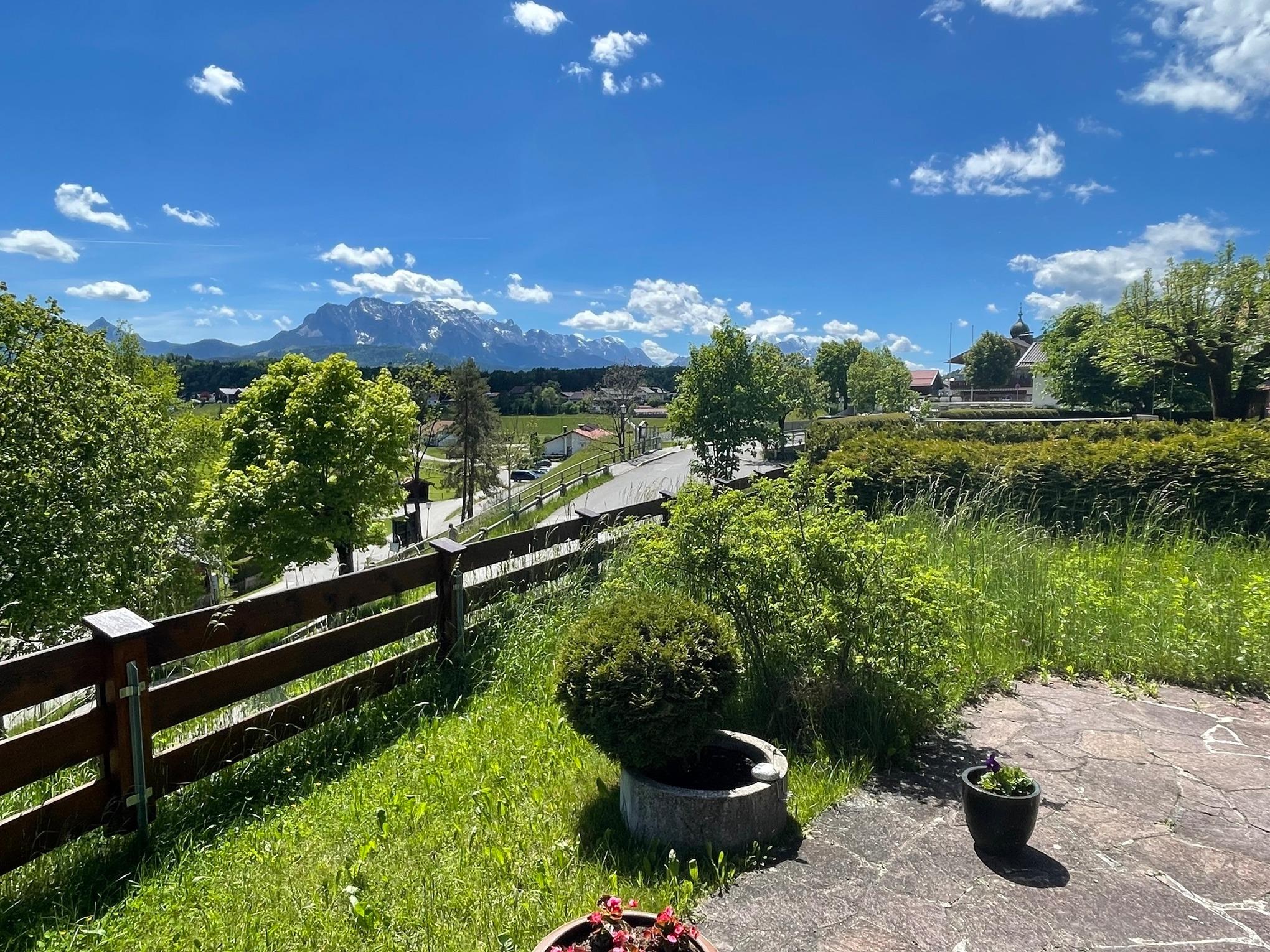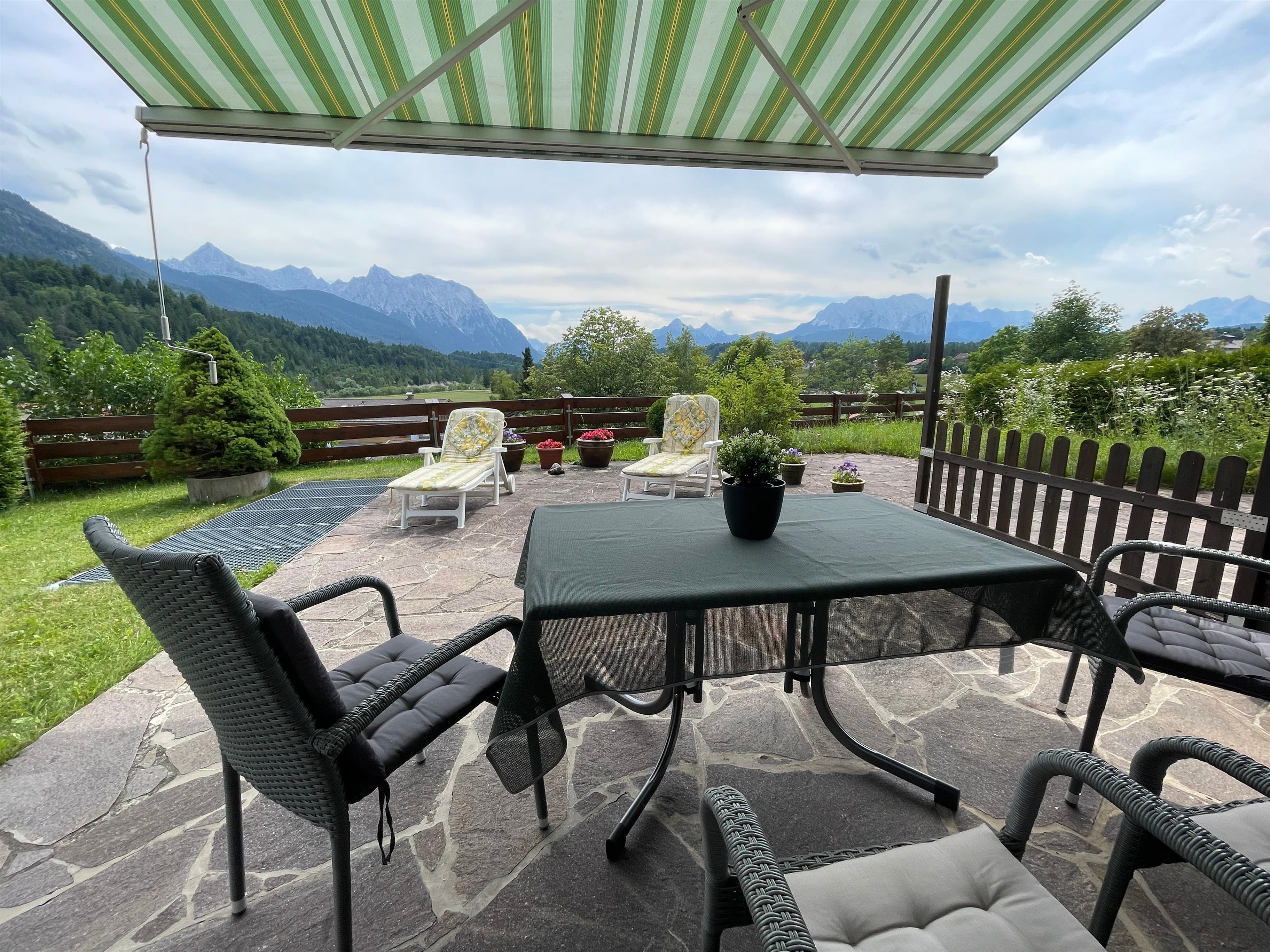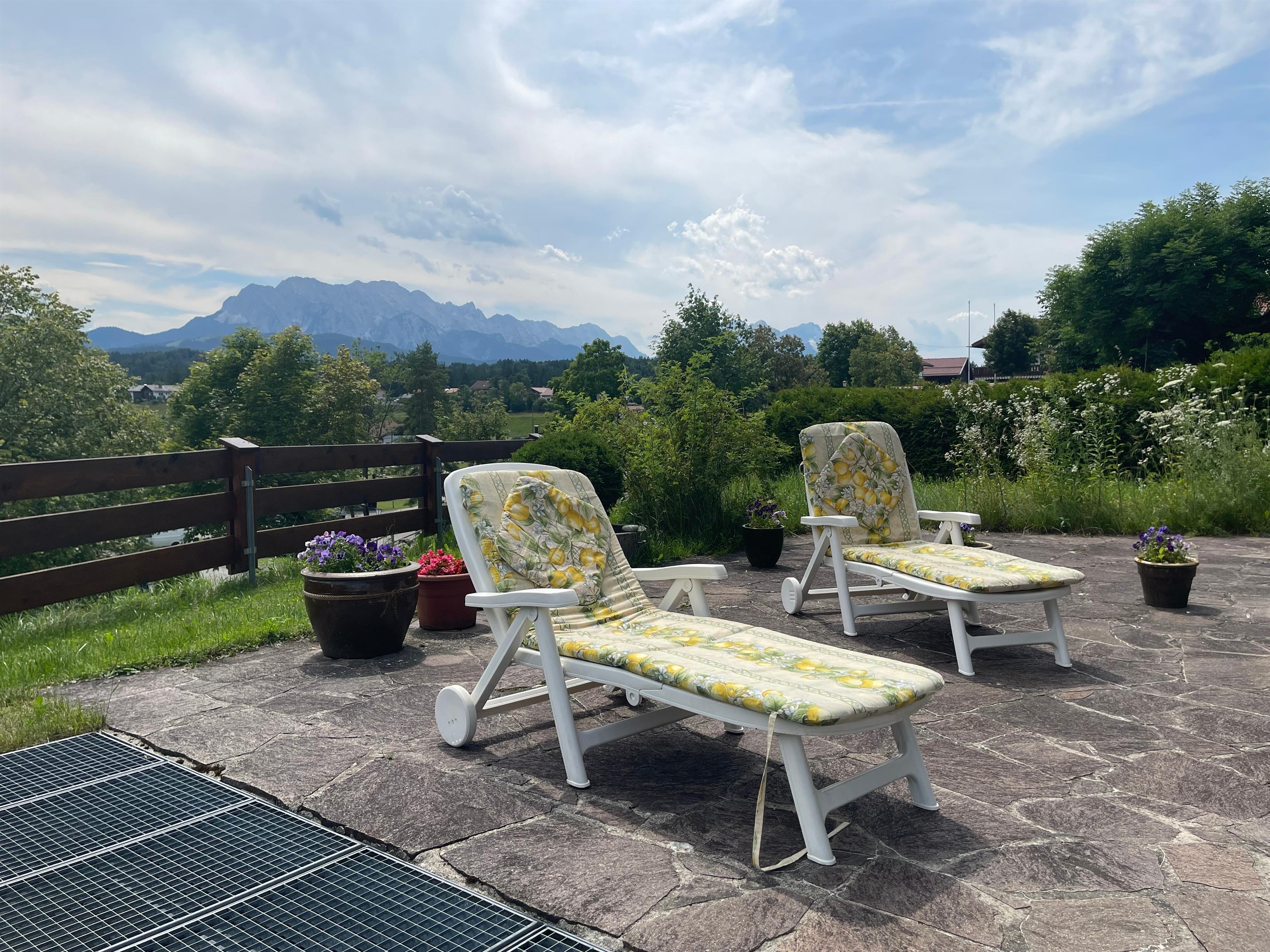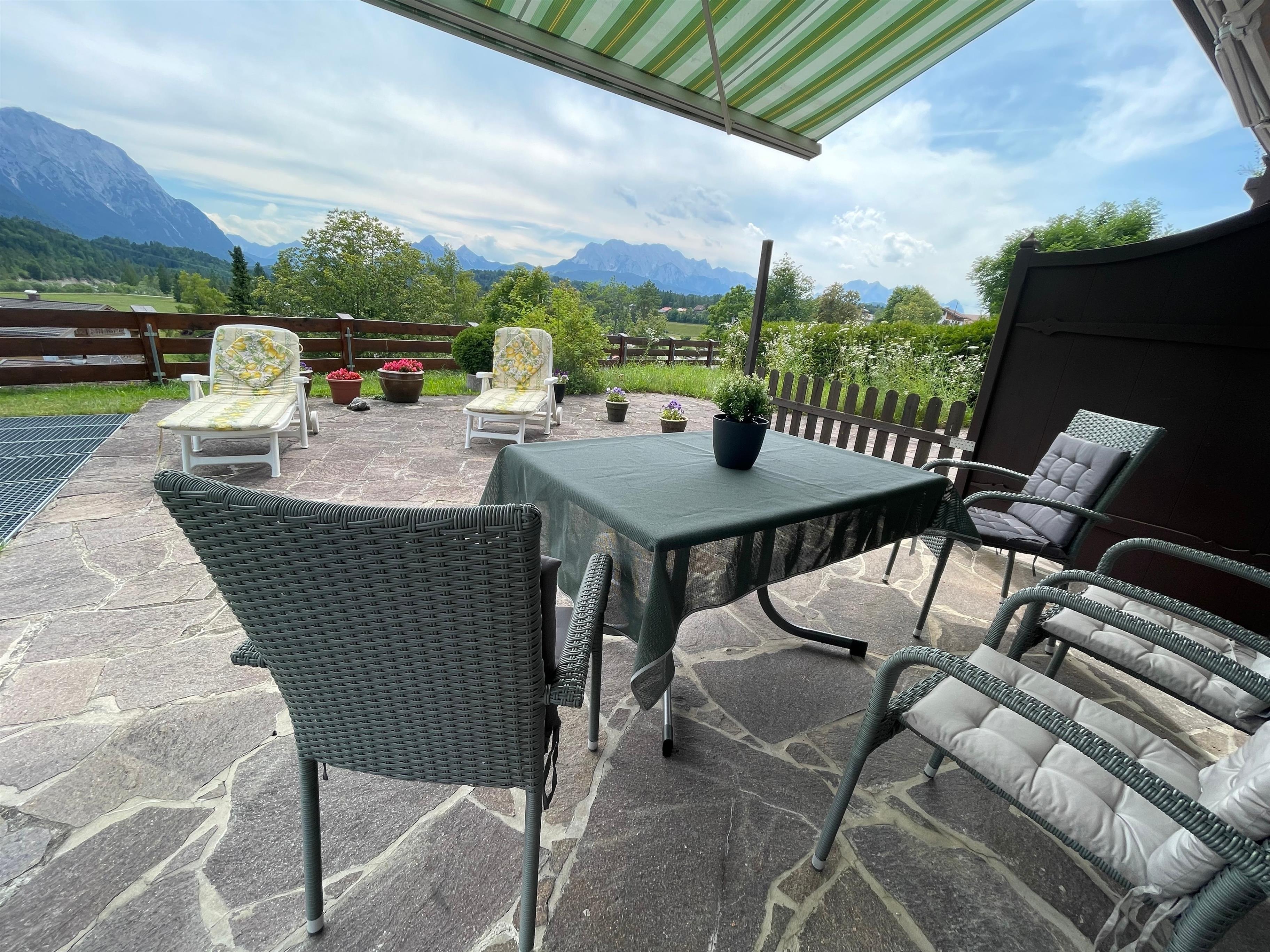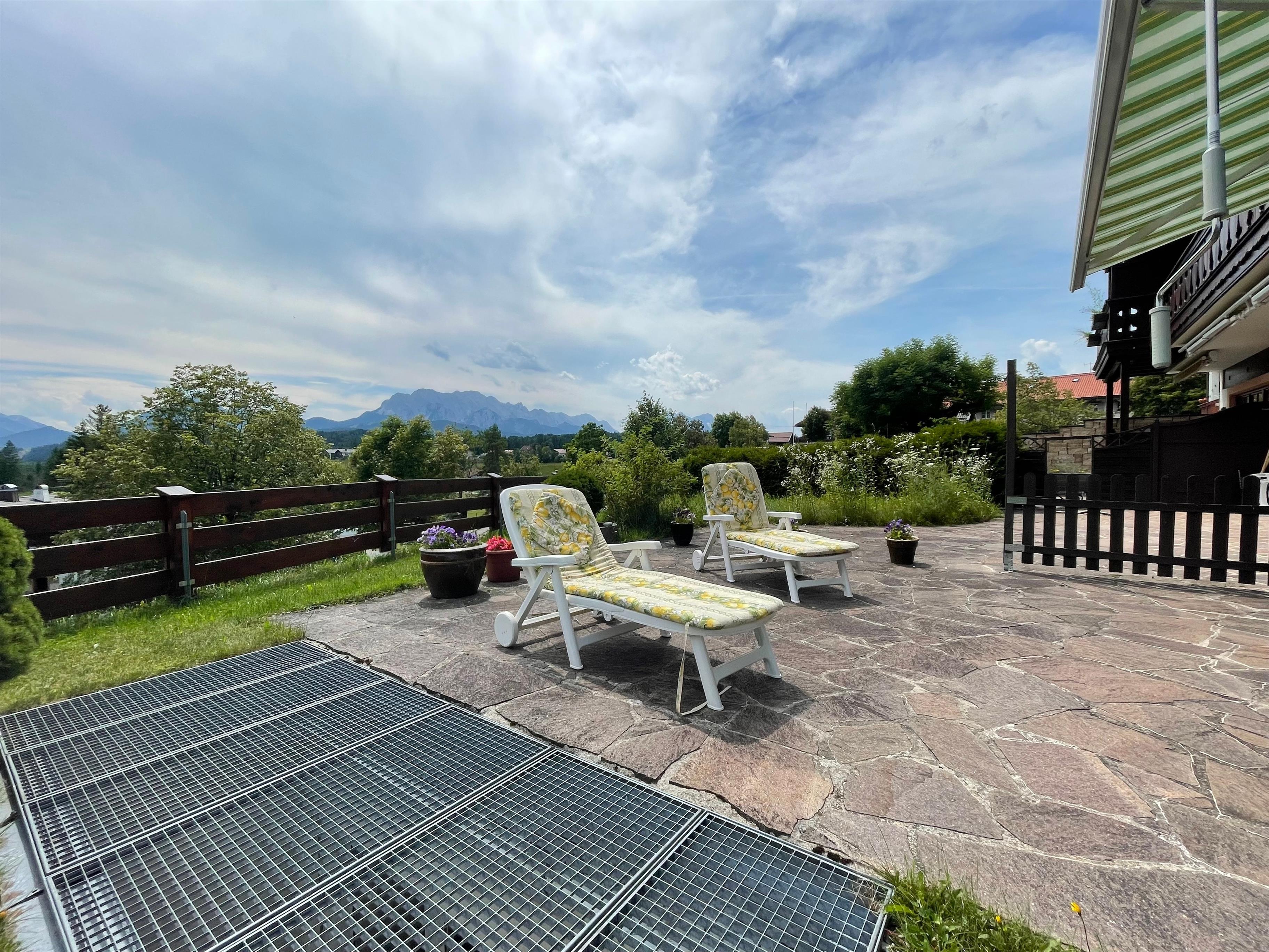 Ein besonderes Highlight ist die großzügige Terrasse mit stilvollen Gartenmöbeln und traumhaftem Blick auf die majestätische Zugspitze perfekt für entspannte Frühstücke im Freien oder abendliche Sonnenuntergänge bei einem Glas Wein.
