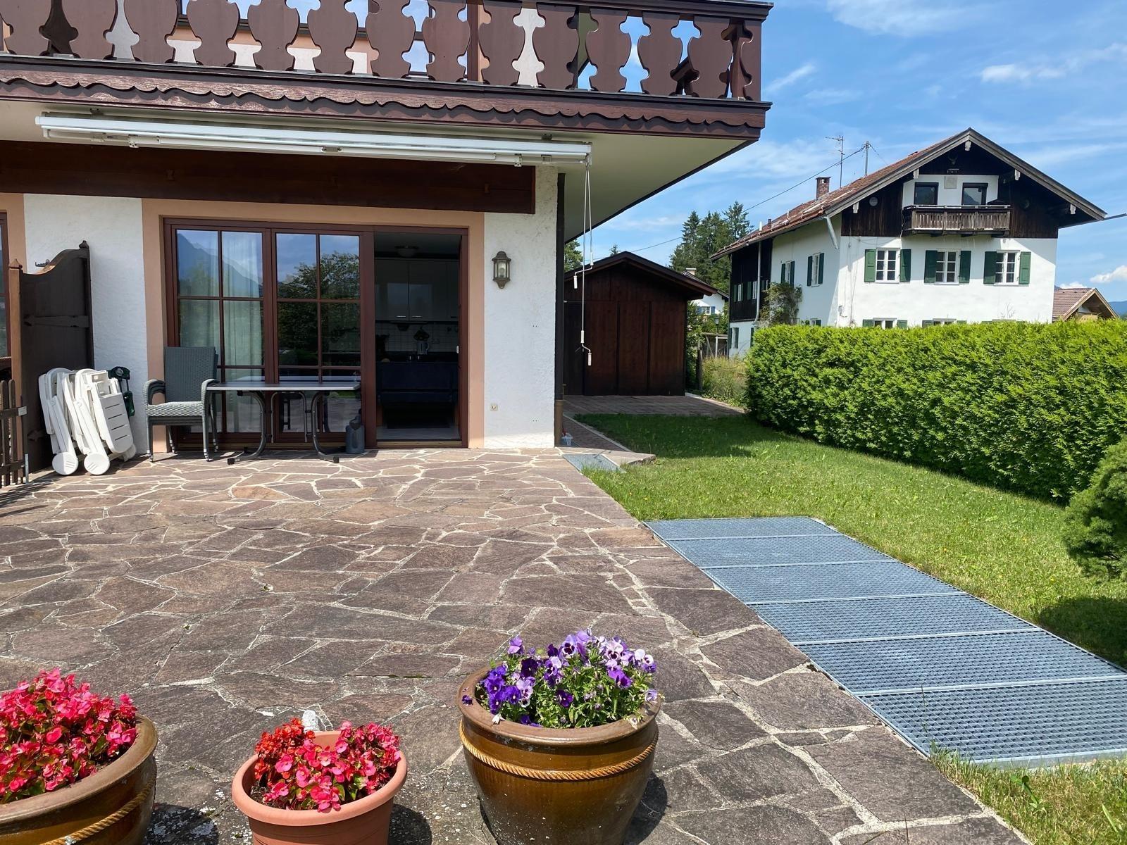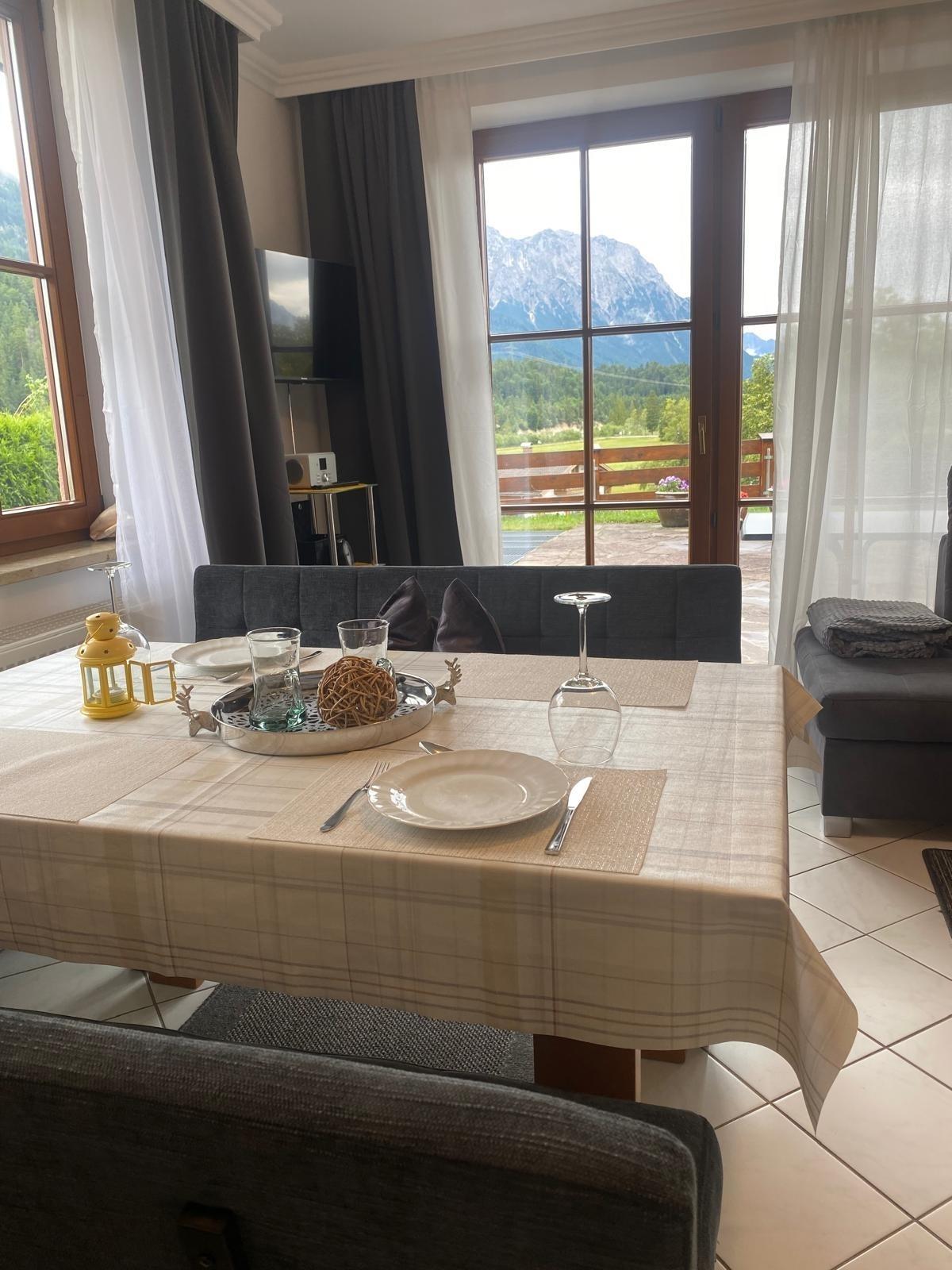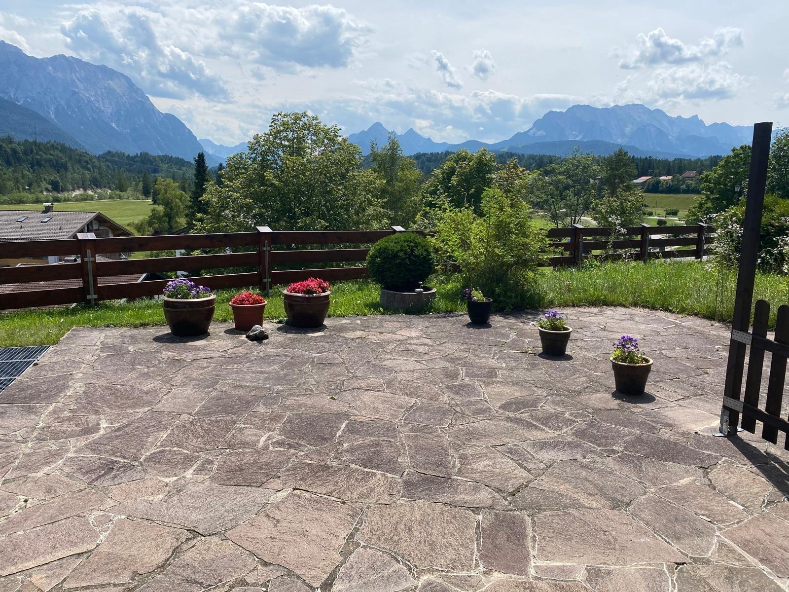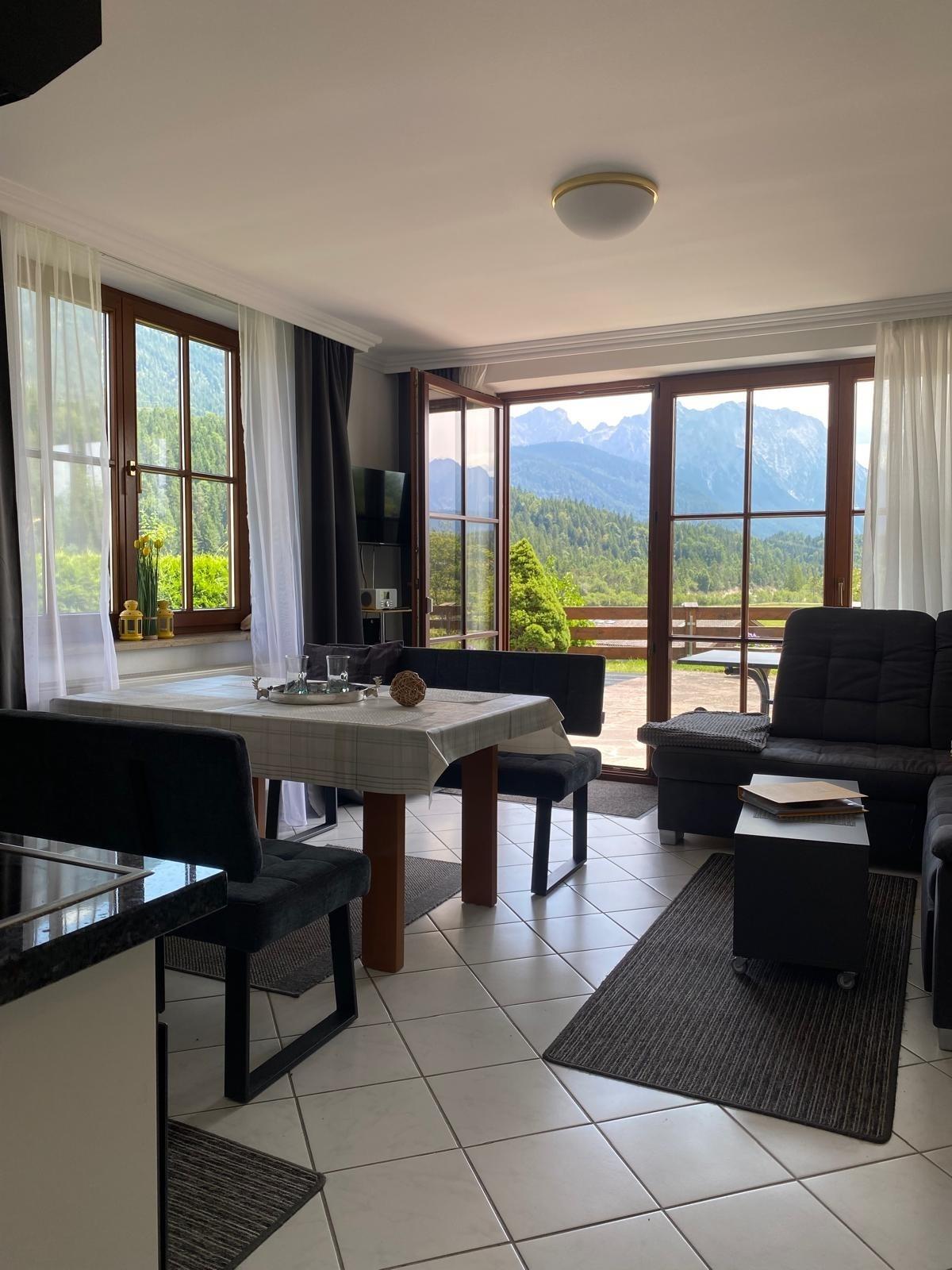 Alpenjuwel, hochwertige Ferienwohnung mit Zugspitzblick, großer Terrasse, Gartenmöbeln, 2 Schlafzimmern, Boxspringbett, Schlafcouch, Waschmaschine & Trockner, Willkommenspräsent, Haustiere erlaubt. Gästemappe vorhanden. Anreise mit Auto empfohlen.
