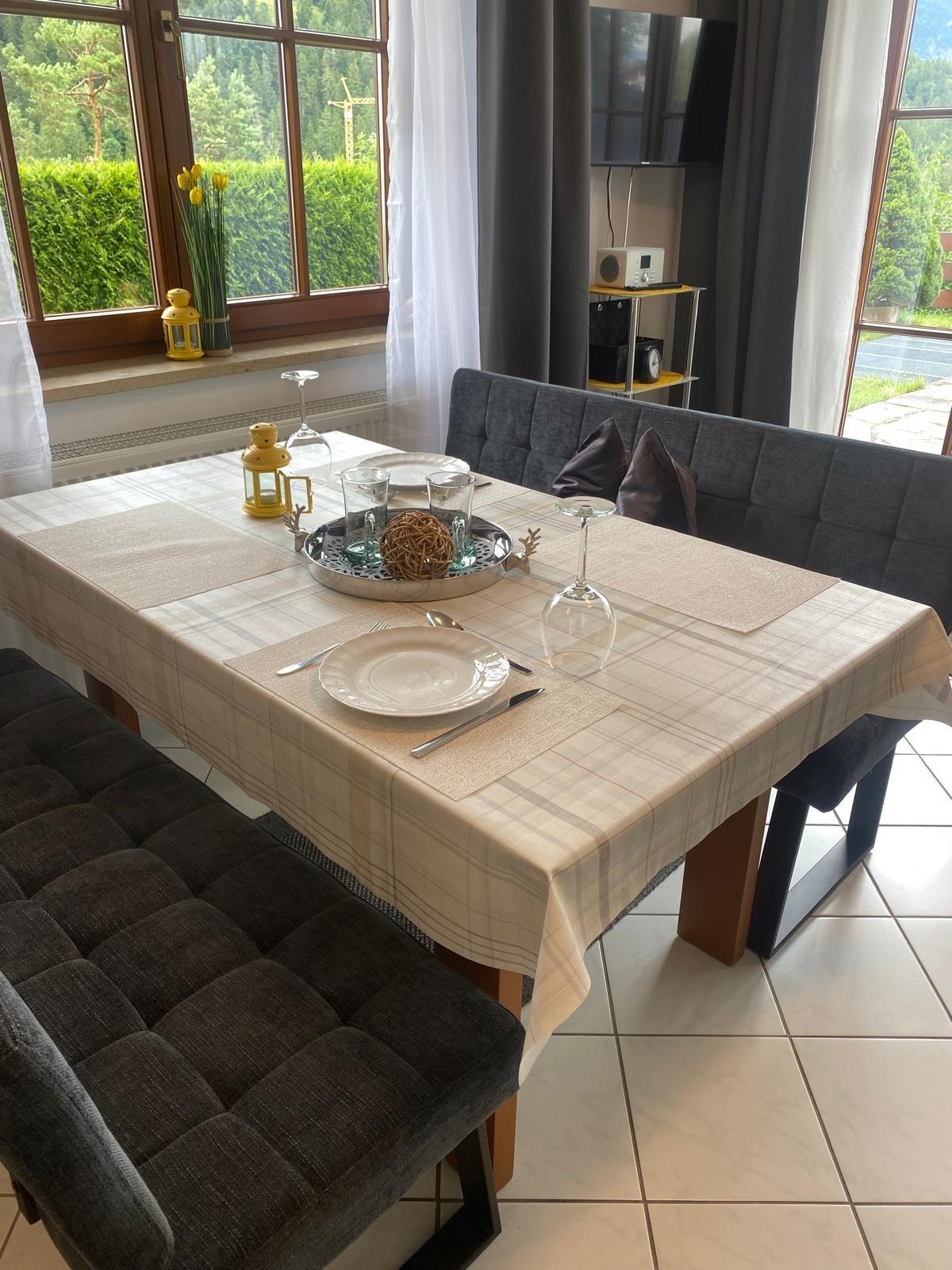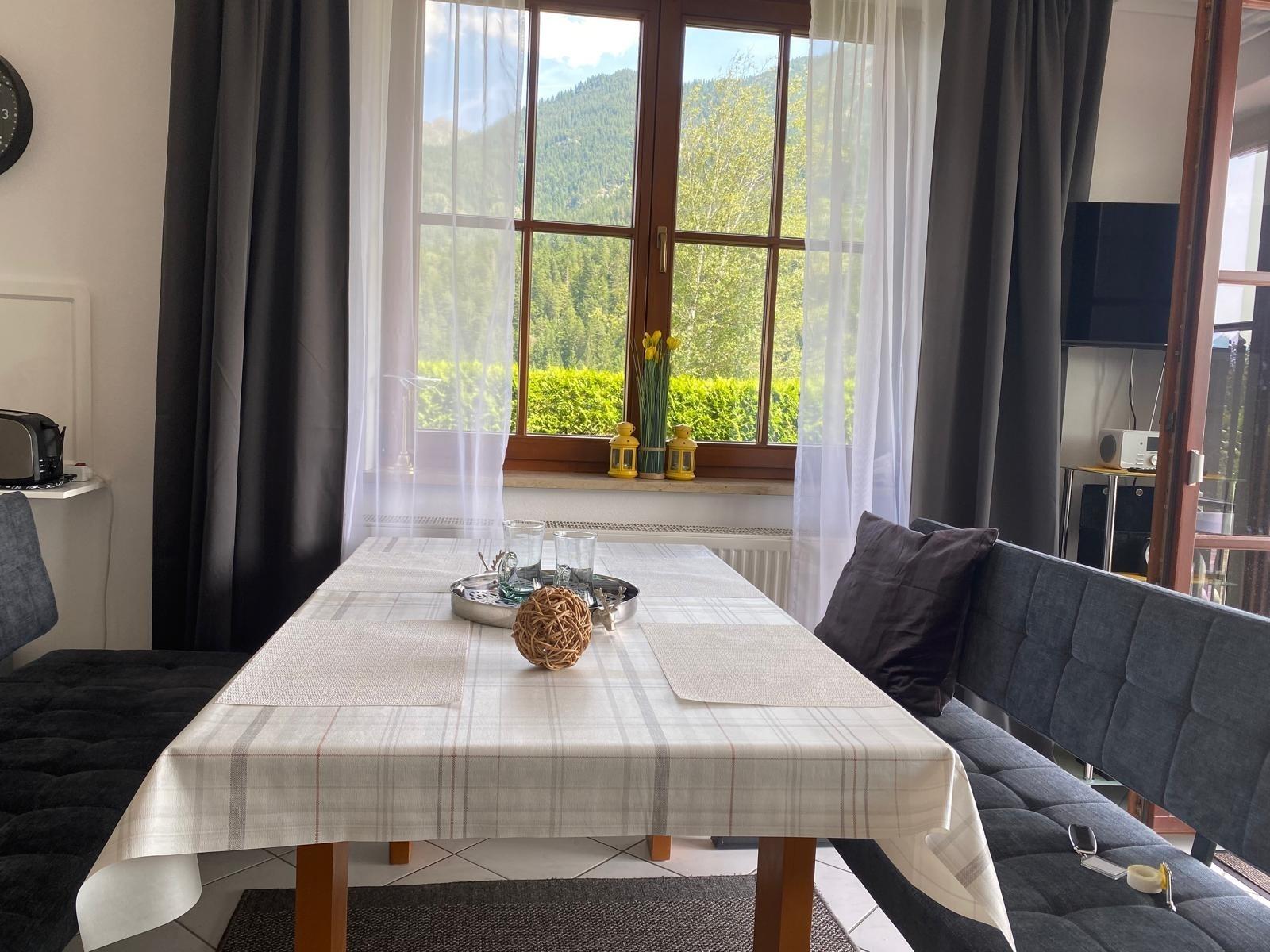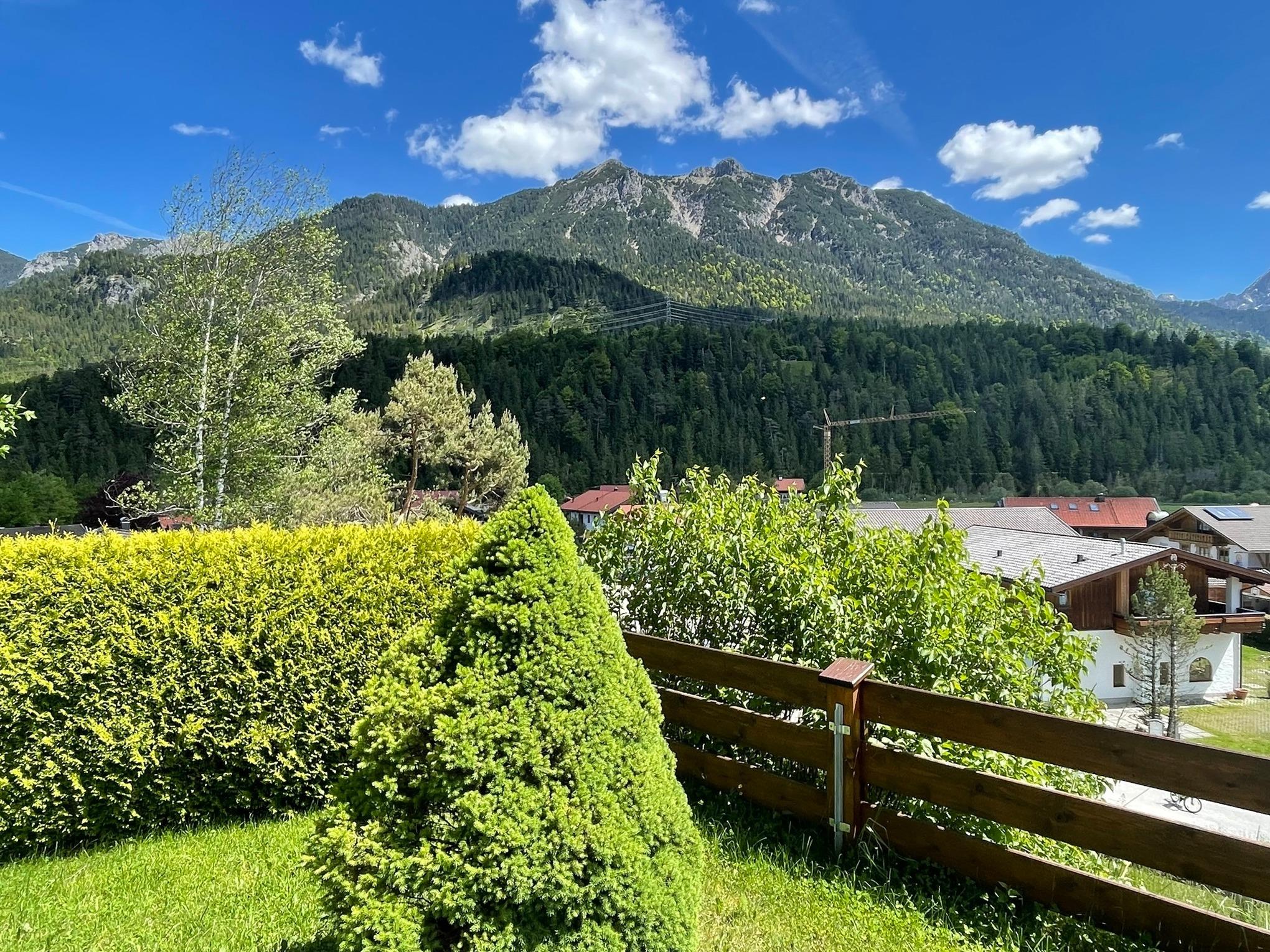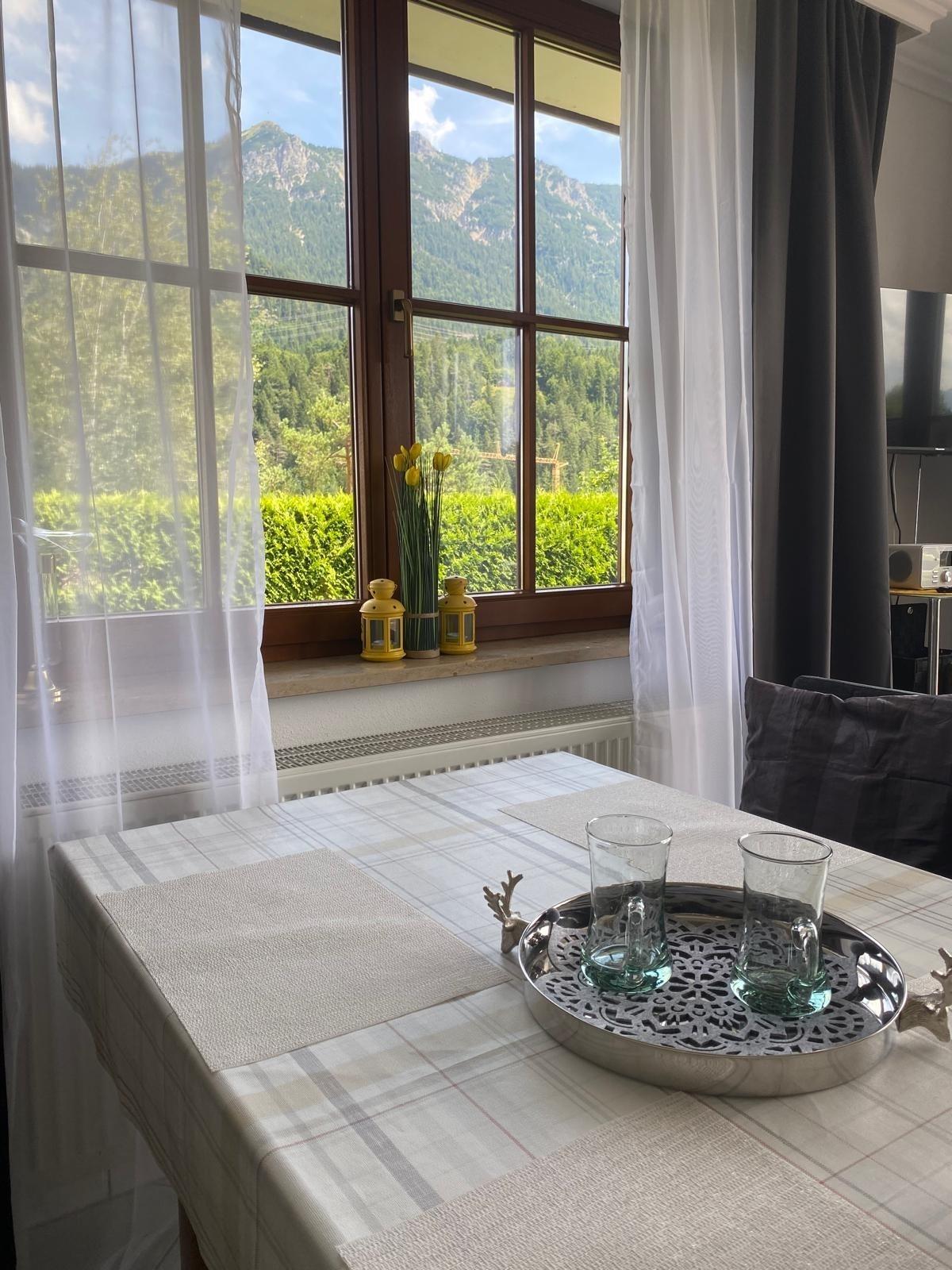 Alpenjuwel, hochwertige Ferienwohnung mit Zugspitzblick, großer Terrasse, Gartenmöbeln, 2 Schlafzimmern, Boxspringbett, Schlafcouch, Waschmaschine & Trockner, Willkommenspräsent, Haustiere erlaubt. Gästemappe vorhanden. Anreise mit Auto empfohlen.