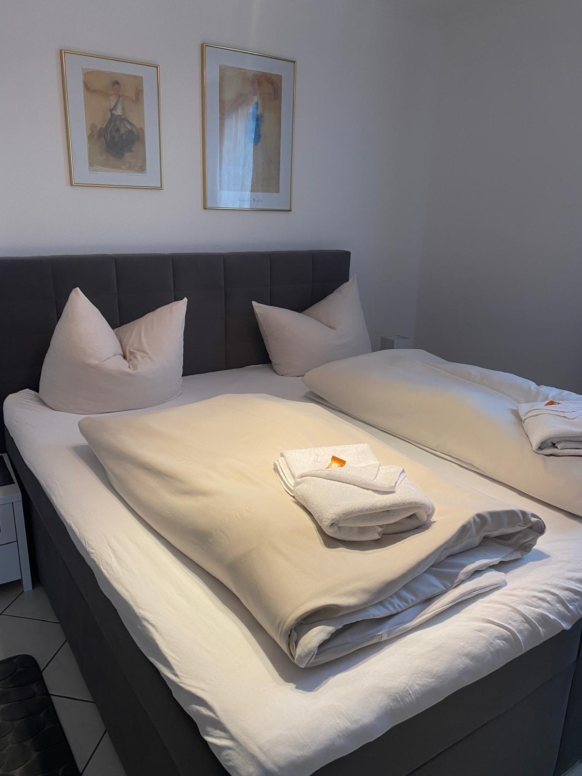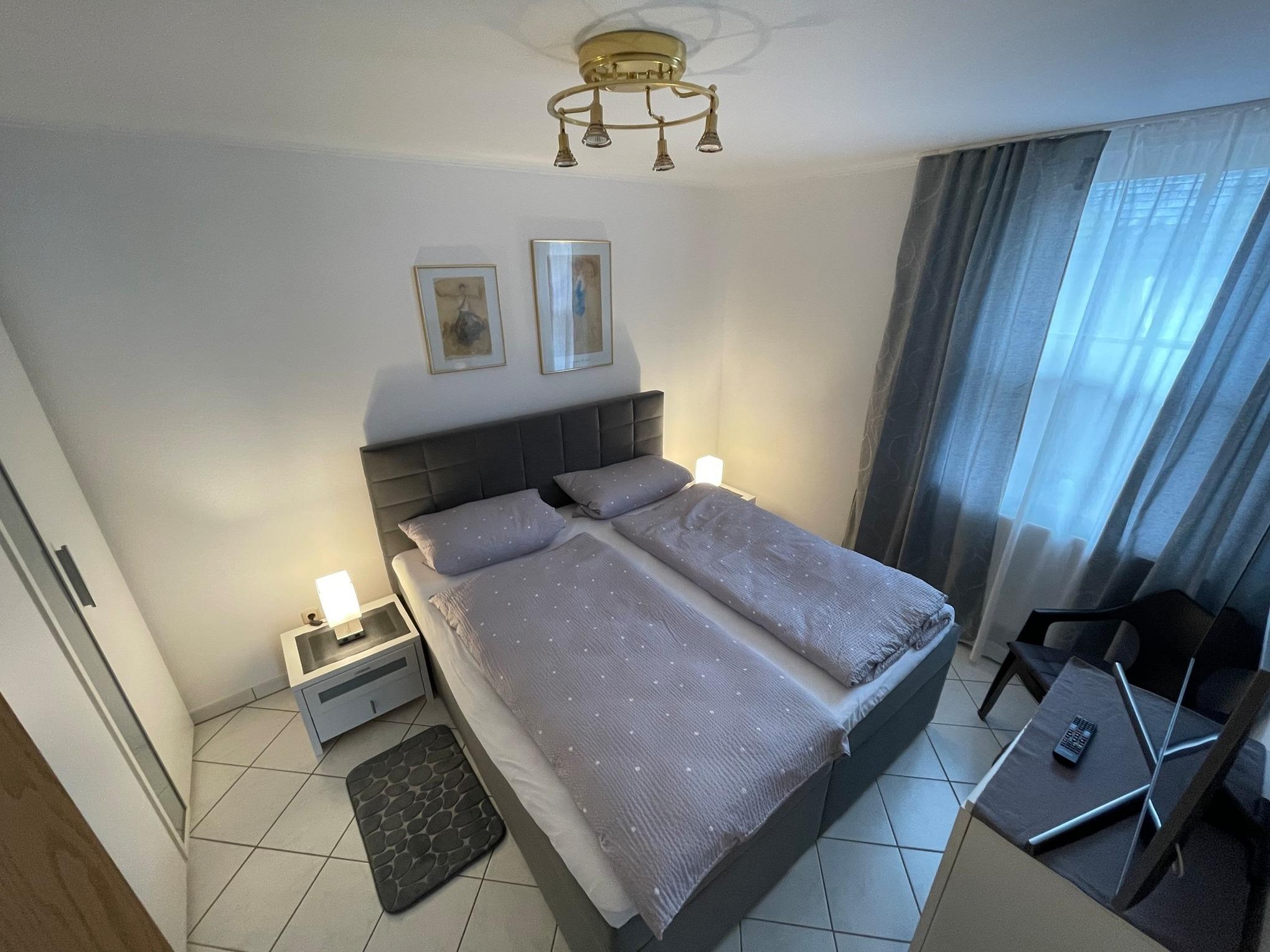Die Wohnung verfügt über zwei gemütliche Schlafzimmer. Im Master-Schlafzimmer erwartet Sie ein luxuriöses Boxspringbett sowie ein Flatscreen-TV für entspannte Abendstunden. Im stilvollen Wohnbereich sorgt ebenfalls ein Flatscreen-TV für Unterhaltung perfekt für gemeinsame Filmabende.