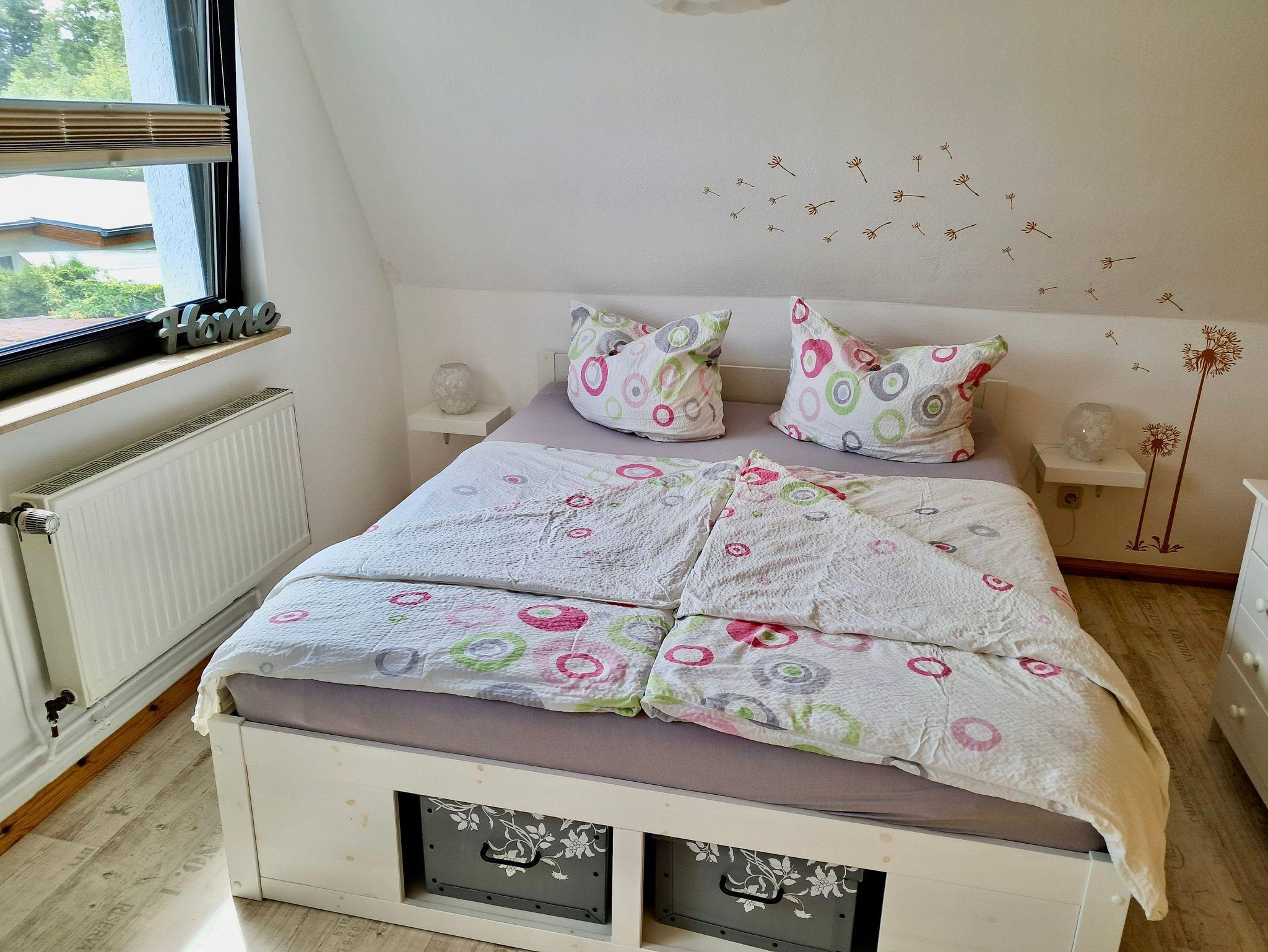 Hier befindet sich ein Schlafzimmer mit Doppelbett (160 x 200 m), zwei Nachttischregalen mit Leselampe, Kommode, offenes Kleiderregal mit Kleiderbügeln sowie eine Leseecke.