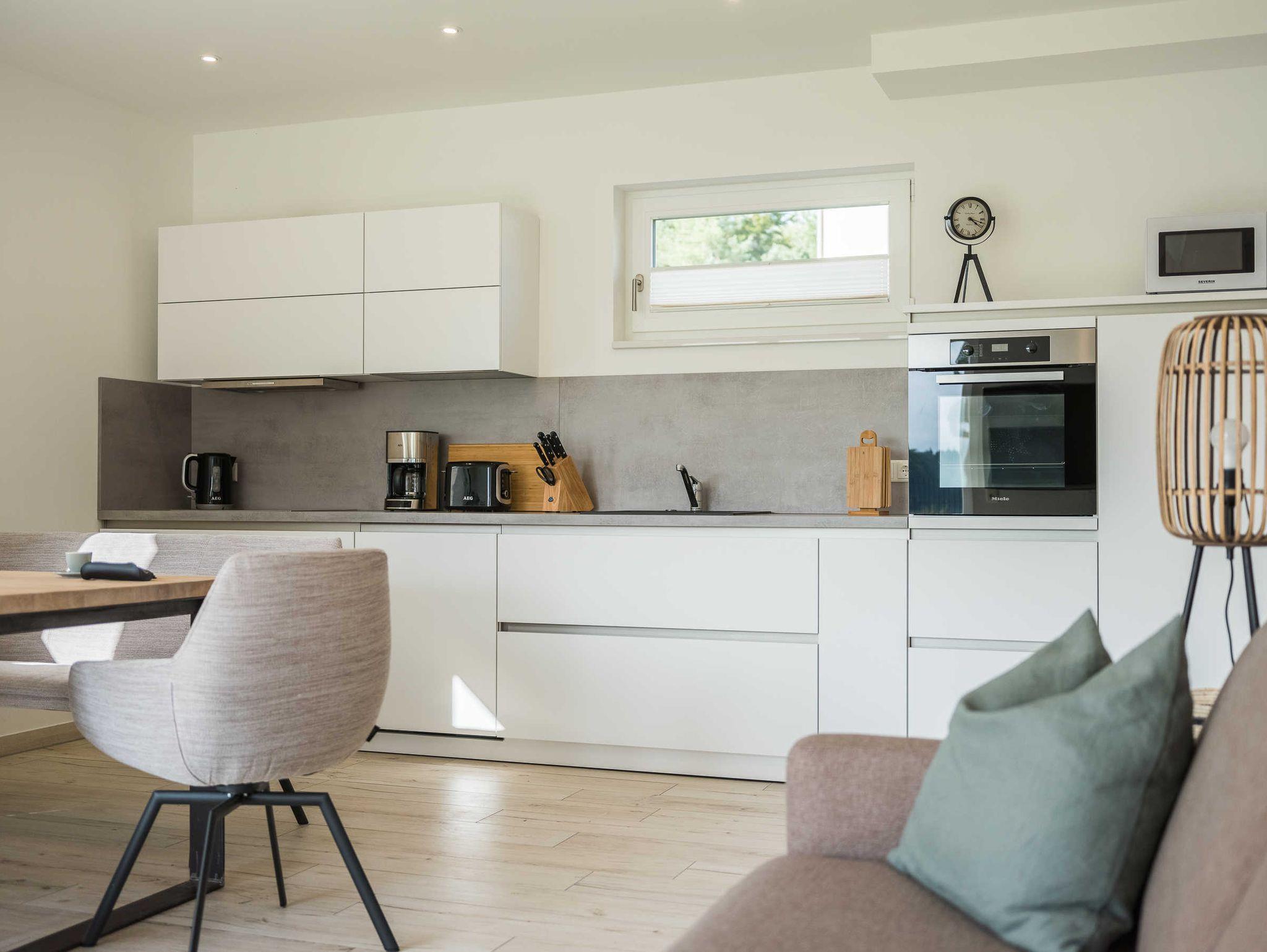 Moderne, offene Küche mit Cerankochfeld, Kühlschrank mit Gefriereinheit, Dunstabzugshaube, Backofen, Geschirrspülmaschine, Mikrowelle, Kaffeemaschine, Toaster, Wasserkocher, komplette Küchenausstattung