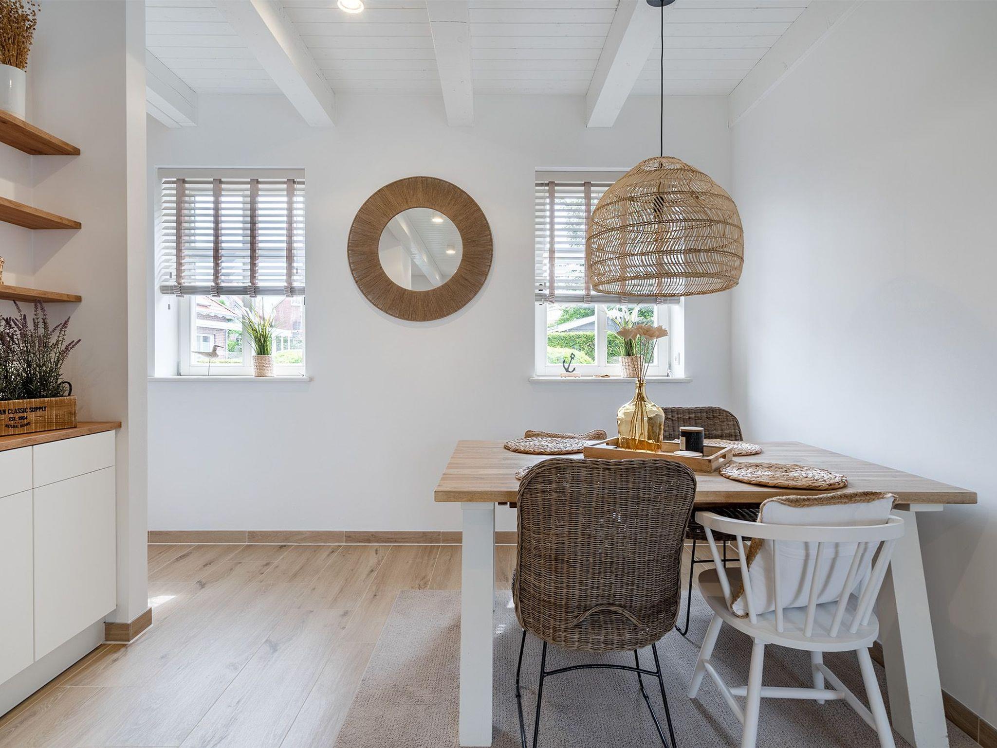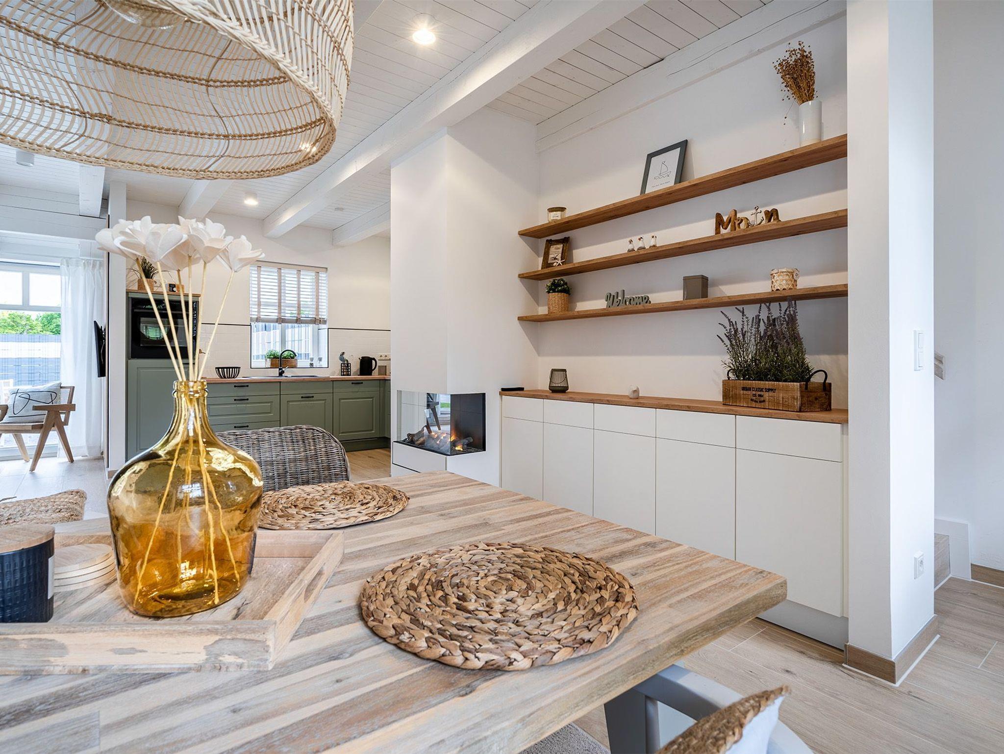 Im Erdgeschoss verfügt das hochwertige Ferienhaus über eine voll ausgestattete Küche, einen Essbereich und ein Wohnzimmer mit Elektro-Kamin. Hier befindet sich auch das großzügige Tageslichtbad mit bodengleicher Dusche und Doppelwaschtisch.