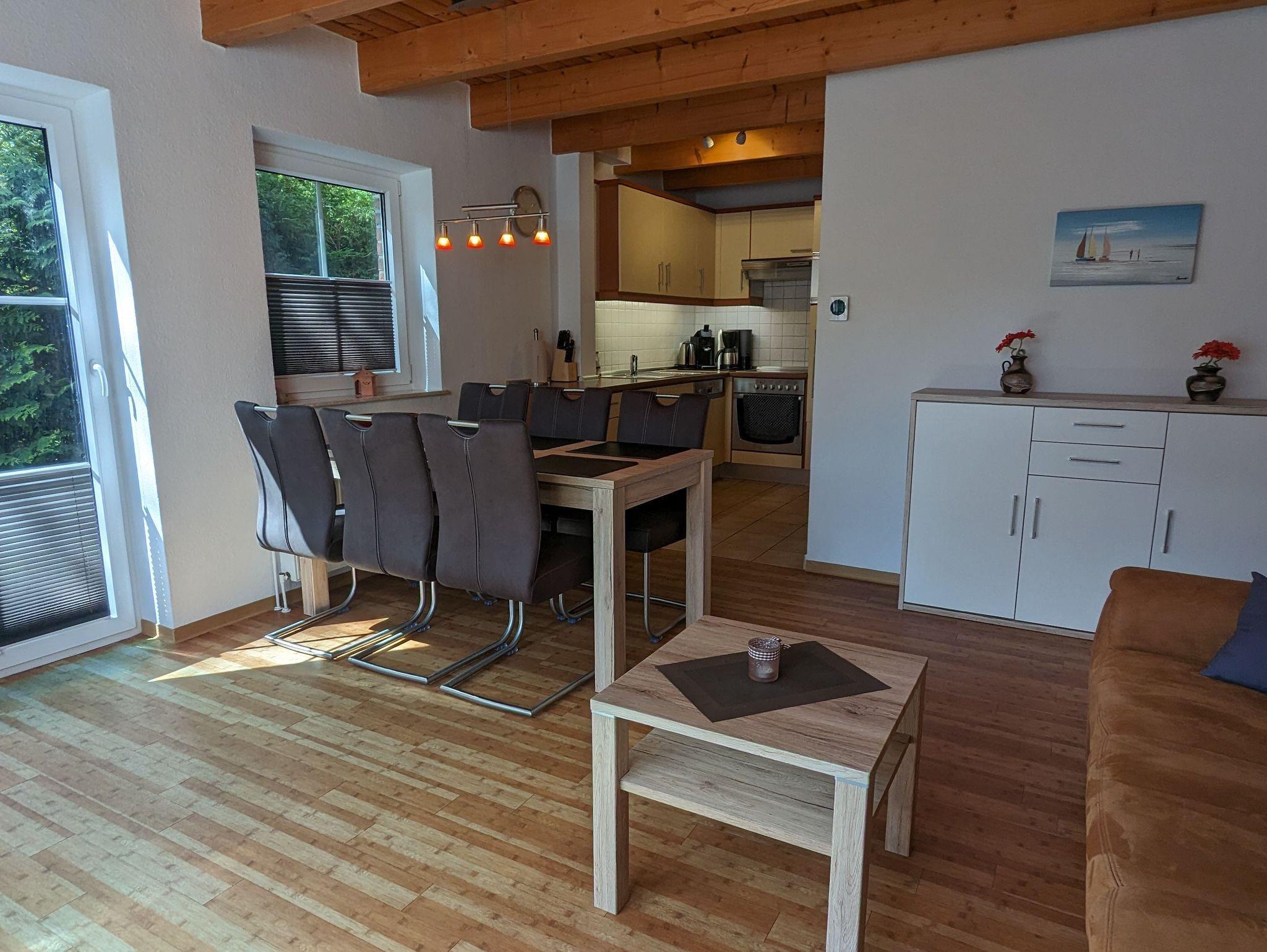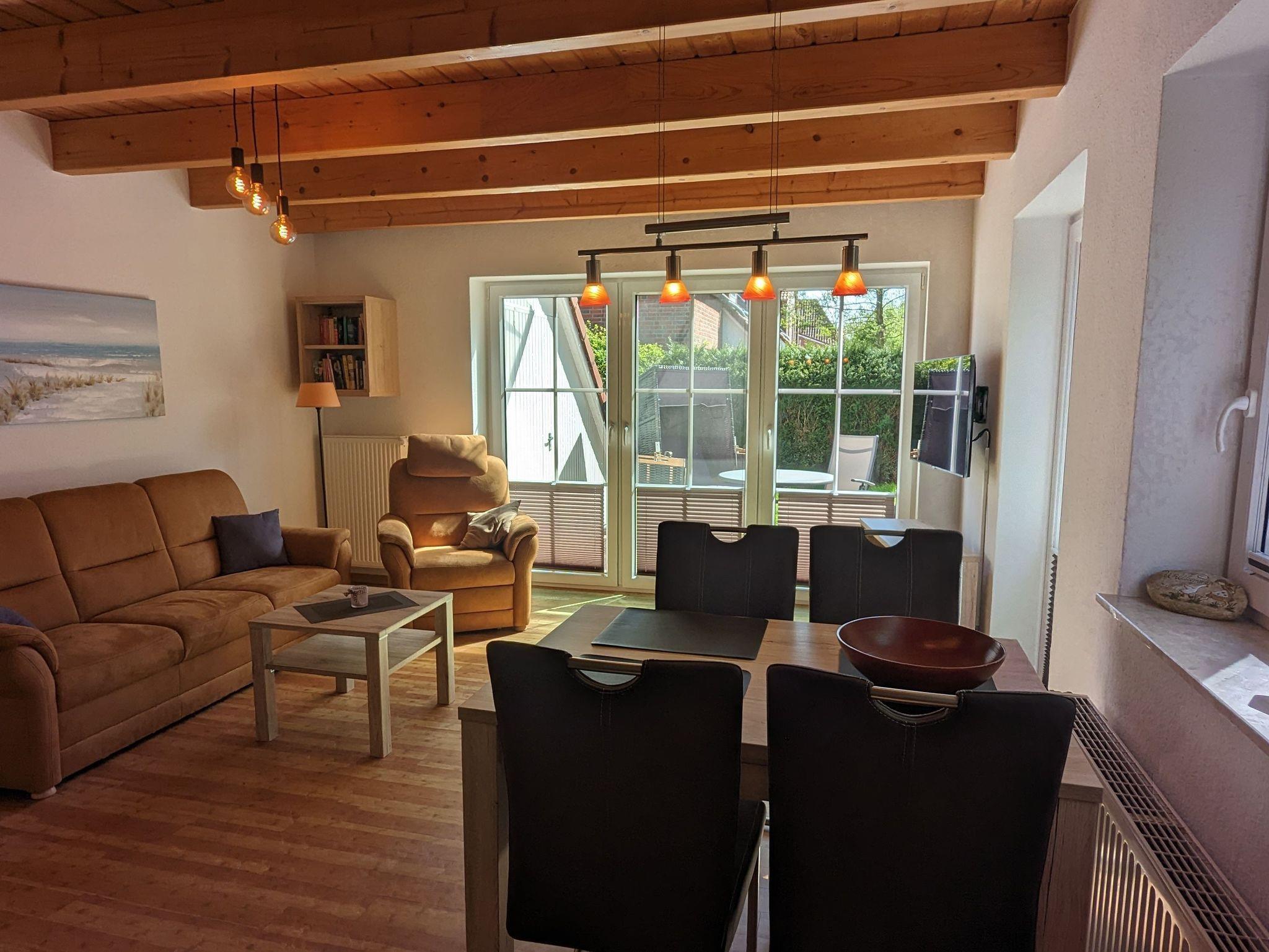 Der großzügige Wohnraum mit großen Fensterelementen ist farblich ansprechend aufeinander abgestimmt. Eine Couch sowie Sessel laden zum Lesen (kleine Bibliothek ist vorhanden), Kuscheln oder Fernsehen ein. Selbstverständlich haben Sie auch von dem separaten Essplatz aus einen sehr guten Blick auf den großen SAT-LCD-TV mit DVD-/Blu-ray-Player. Eine Musikanlage und diverse Spiele stehen für Sie zur Verfügung. Die offene Einbauküche mit allem Komfort (Geschirrspüler, Mikrowelle, Backofen, Ceranfeld, Kaffeemaschine, Senseo Maschine, Toaster, Wasserkocher, Handmixer) fügt sich harmonisch in den Wohnbereich ein. Geschmackvolle Dekorationen und Bilder runden die Einrichtung für Ihre Behaglichkeit ab.