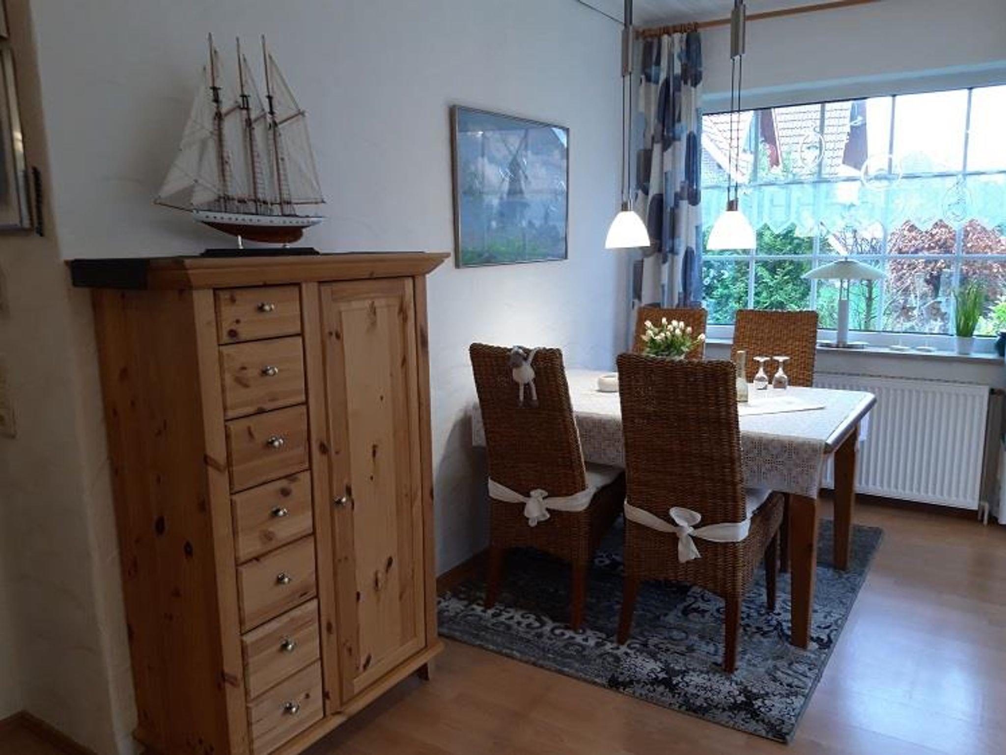 Wohnung Schollenweg 16 (EG-Wohnung links) *Seebär*. Ruhe und Erholung pur in dieser 55 qm großen, ruhig gelegenen und gepflegten EG-Wohnung, nahe am historischen Ortskern. Ausstattung: Modernes Tageslicht-Badezimmer mit Dusche, WC und Waschtisch. Größeres Schlafzimmer mit Doppelbett, kleines Schlafzimmer für 1 Erwachsener oder 2 Kinder. Wohn-Essbereich, gemütlich eingerichtet und mit allem notwendigen Zubehör, Fernseher (SAT), Musikanlage/CD + kostenloses WLAN. Integrierte Küche mit allen notwendigen Elektrogeräten + Geschirrspüler. Großzügiger heller Wohnbereich mit Zugang zur überdachten Terrasse und den, die Wohnung umgebenden Gartenbereich mit mehreren Sitzgelegenheiten und gemütlichem Strandkorb. Terasse mit Markise. PKW-Stellplatz am Haus/abschließbarer Abstellraum für Fahrräder.