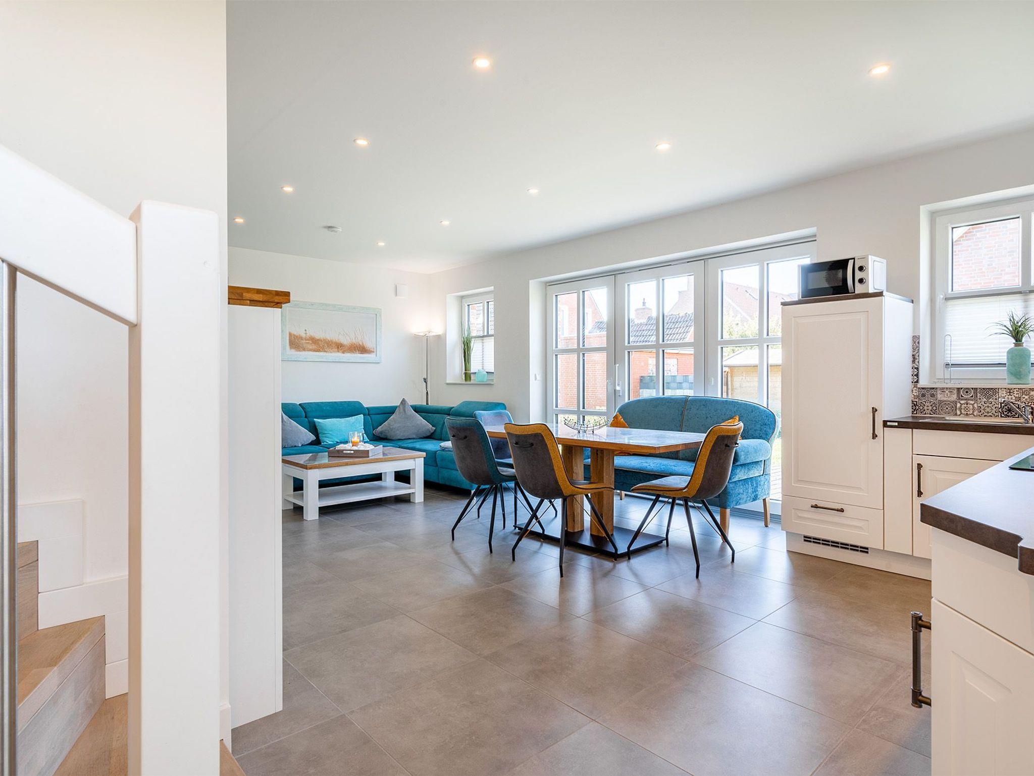 Bodengleiche Duschen, ein Doppelwaschbecken, Fußbodenheizung, eine Waschmaschine und die voll ausgestattete Küche machen das Haus zu einem komfortablen Feriendomizil. Das Haus verfügt über einen großen Garten mit Terrasse, sowie einen PKW-Stellplatz. Auch ein Abstellraum für Fahrräder ist vorhanden.