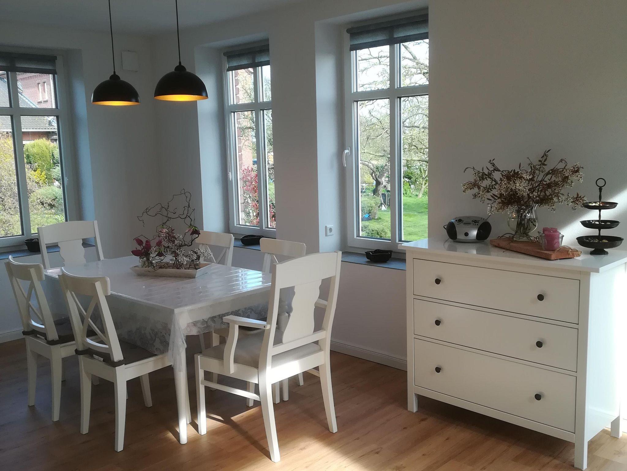 „Zur Marsch“, die hintere der beiden Ferienwohnungen, ist 100 m² groß und erstreckt sich über zwei Etagen. Der separate Eingang an der Seite des Hauses ist über einen beleuchteten Pflasterweg vom Parkplatz aus zu erreichen. Vor dem Wohnbereich liegt eine sonnige Terrasse, von der man einen wunderschönen weiten Blick auf die anliegenden Wiesen des Marschlandes hat. Der zu dieser Wohnung gehörende Garten mit seiner großen Rasenfläche bietet viel Platz zum Erholen und Spielen. Im offenen Wohnbereich hat man von der großen Galerie aus ebenfalls einen schönen Blick auf die weite Landschaft. Die zahlreichen Fenster im Wohn- und im angrenzenden Küchen- und Essbereich und die torähnliche Tür zum Garten sorgen für eine helle und freundliche Atmosphäre. Für wohlige Wärme an kühlen Abenden oder windigen Herbst- und Wintertagen sorgt der Kaminofen.