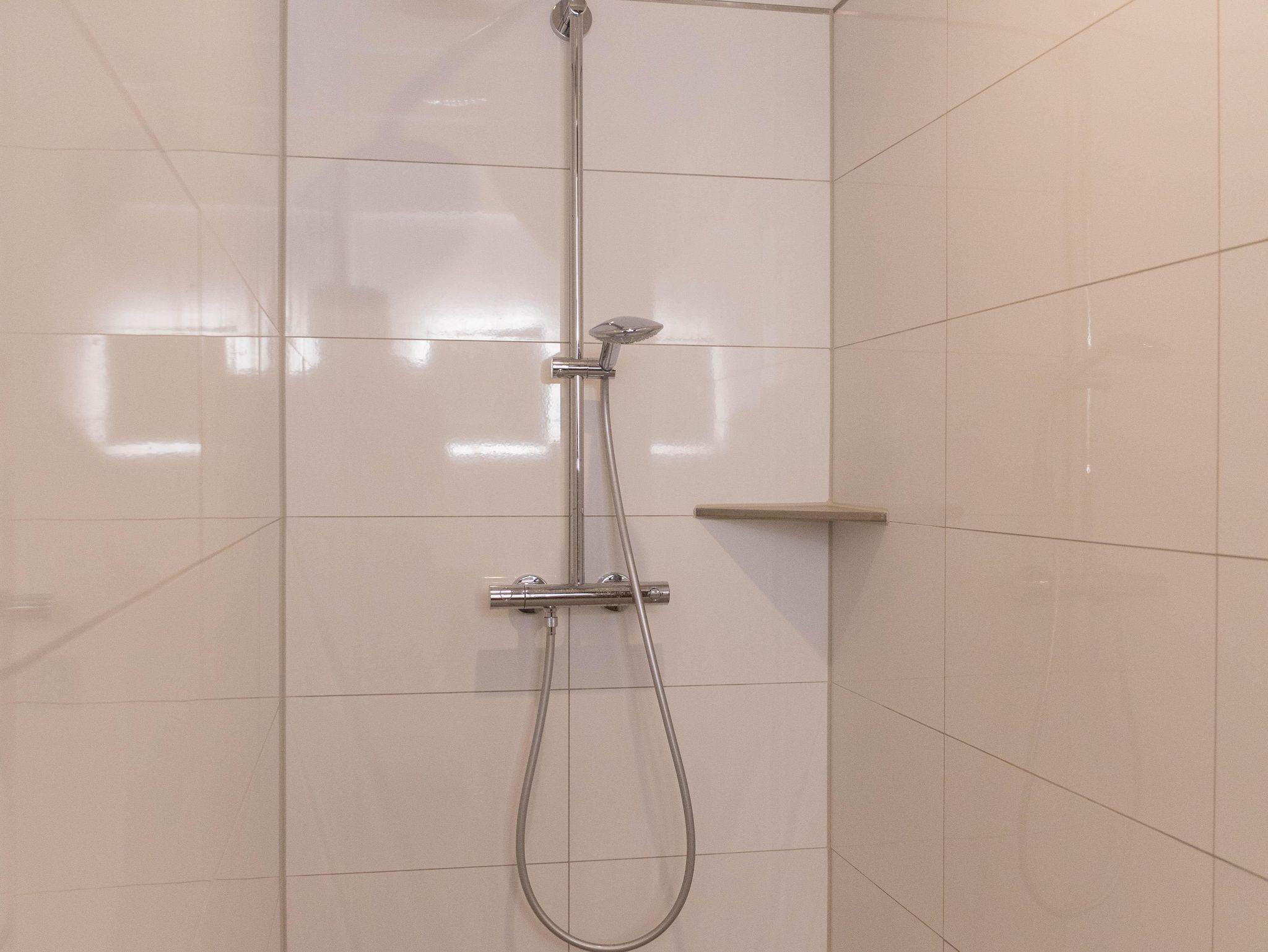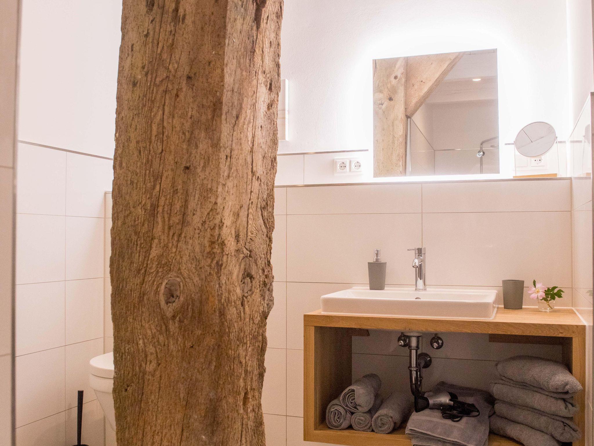 Das moderne Bad im Obergeschoss verfügt über eine bodenebene Dusche, Handtuchheizung und hochwertige Armaturen. Im Erdgeschoss gibt es ein Gäste WC.