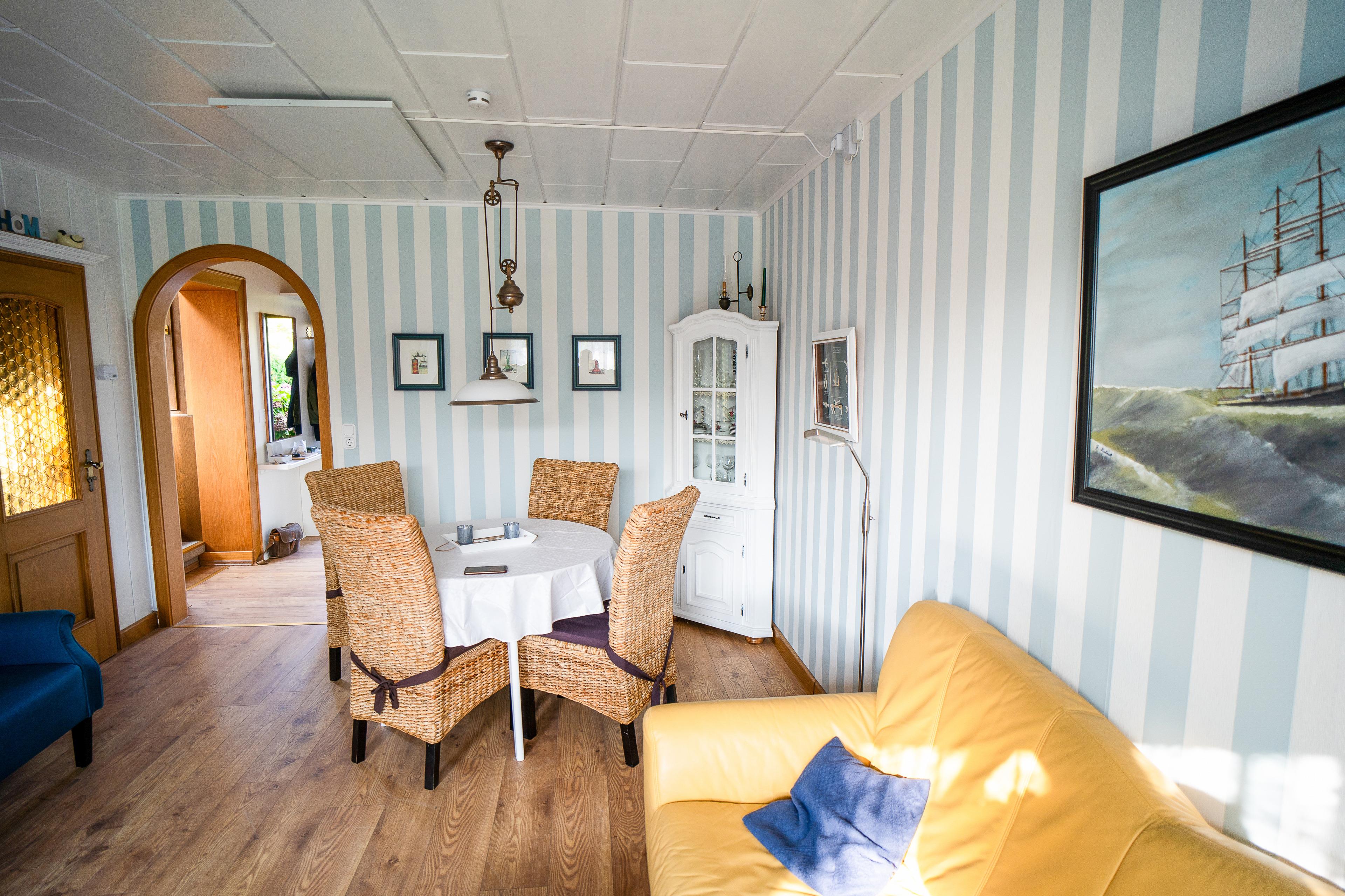 Das Haus relativ liegt nah am Zentrum des sehr malerischen Ortskerns. Alles ist fußläufig zu erreichen. Dabei ist die Lage des Ferienhauses ausgesprochen ruhig. Der eigene Parkplatz liegt direkt am Haus. Das Ferienhaus mit Küche, Bad und drei Zimmern, davon zwei Schlafzimmer, verfügt zudem über eine Terrasse und zwei Abstellräume. Das ehemalige, innenliegende Treppenhaus wurde durch einen Treppenhausanbau ersetzt und die Fläche den Wohnräumen zugeteilt. Somit vergrößerte sich im Erdgeschoss das Ess-/ Wohnzimmer und im Obergeschoss wurden zwei übereinanderliegende Kojen mit vollwertigen Betten eingebaut. Über dem Sofa und im Treppenhausturm hängen ein maritimes Werk und traditionelle Landschaftsbilder eines Emder Künstlers. Insbesondere das Wohn- und Esszimmer wurde im friesischen Stil eingerichtet.