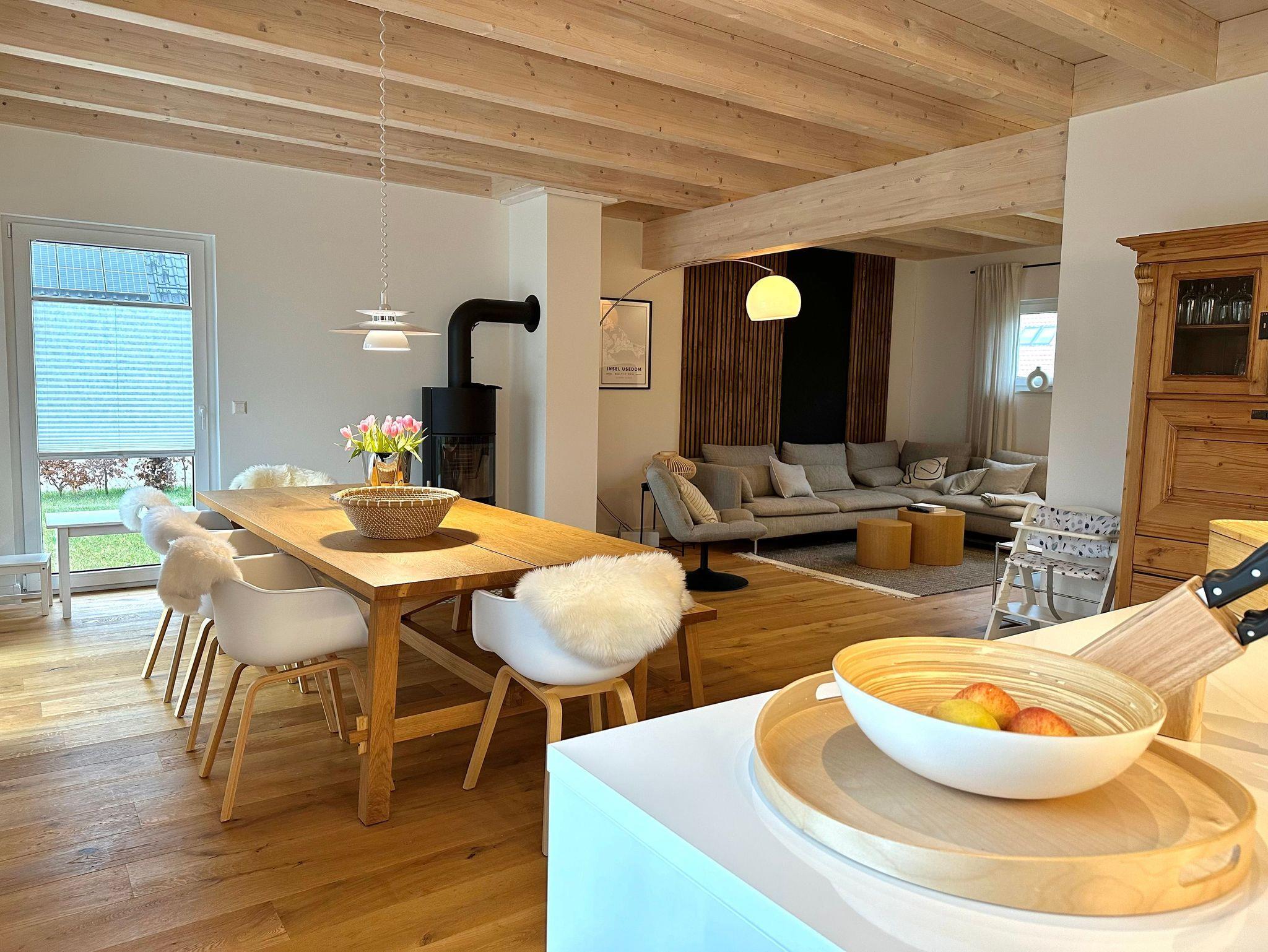 Ferienhaus No. 1: ca. 140 m², 2 Schlafzimmer, großzügiger Wohn/Essbereich mit Kamin, voll ausgestattete Küche, Bad mit Sauna, Terrasse & Garten.