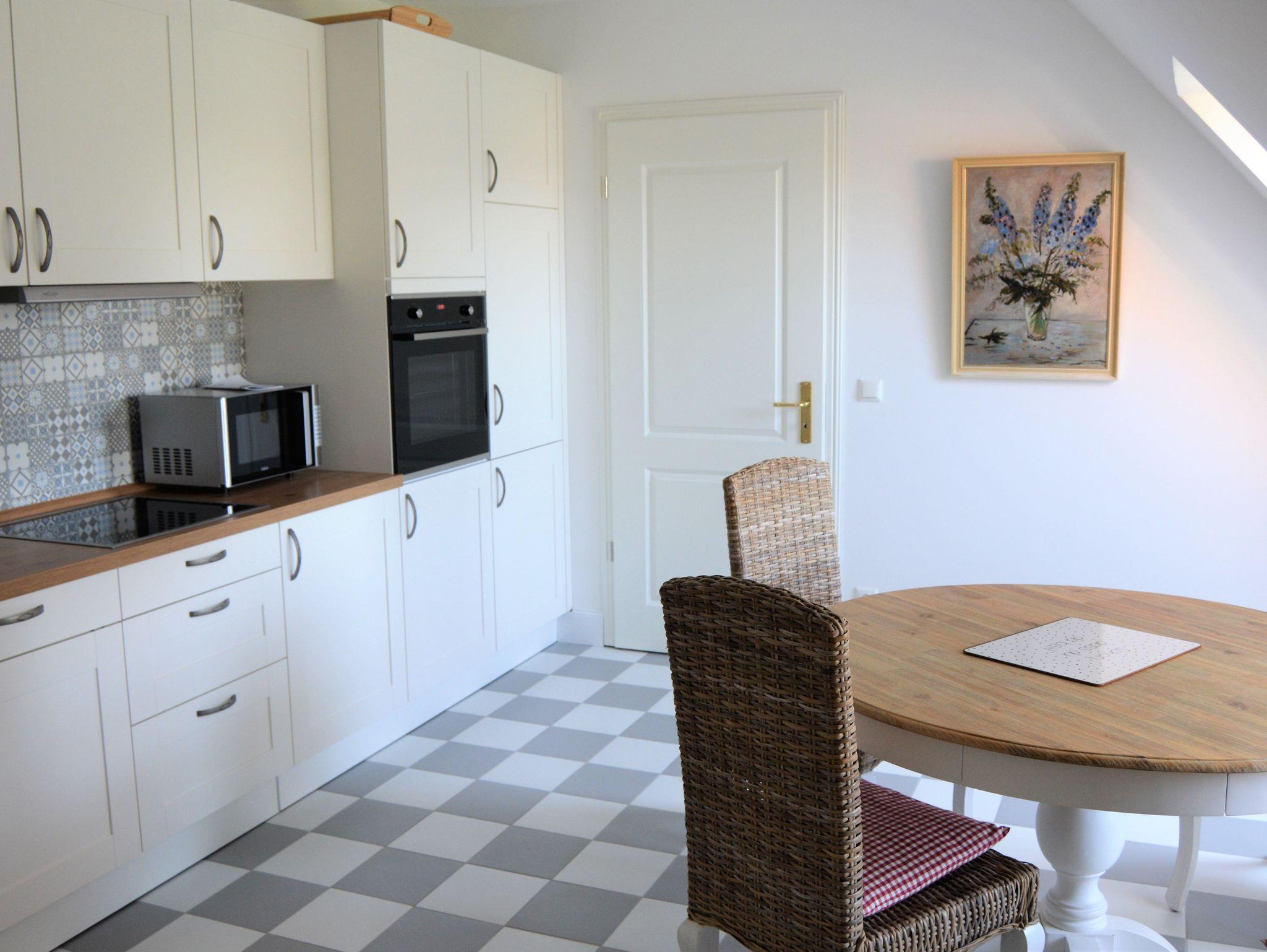 Die Wohnung Kranichhöhe verfügt über Wohnzimmer, Schlafzimmer, Küche mit Essbereich und Bad. Sie ist etwa 70qm groß und bietet bis zu 4 Personen Platz. Die Ausstattung vermittelt maritimen Flair. Highlight ist das Wohnzimmer mit Galerie. Herrliche Blicke auf die Wismarer Bucht und die untergehende Sonne sind quasi garantiert. Die Sonne vermittelt wunderbare Farbspiele im Raum. In der großen Küche mit Essbereich findet sich alles Notwendige und Wünschenswerte: Kühlschrank/Gefrierschrank, Herd und Backofen, Mikrowelle, Kaffeemaschine sowie Wasser- und Eierkocher. Weitere technische Ausstattungsmerkmale sind: WLAN, Fernseher, Radio und CD-Player. Im Garten gehört eine Strandkorb-Gruppe zur Wohnung.