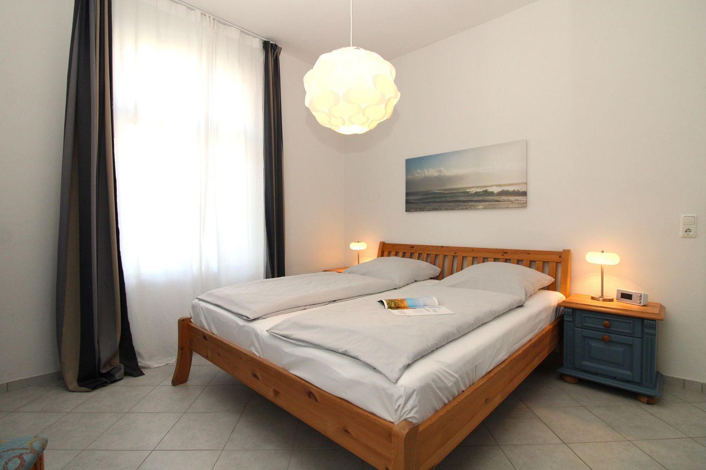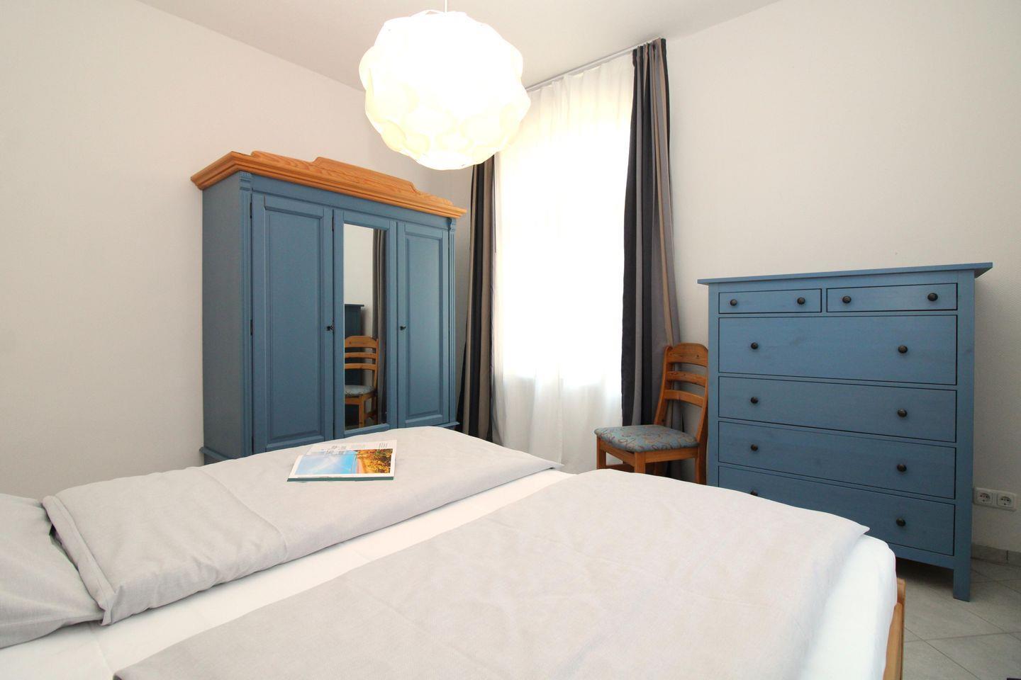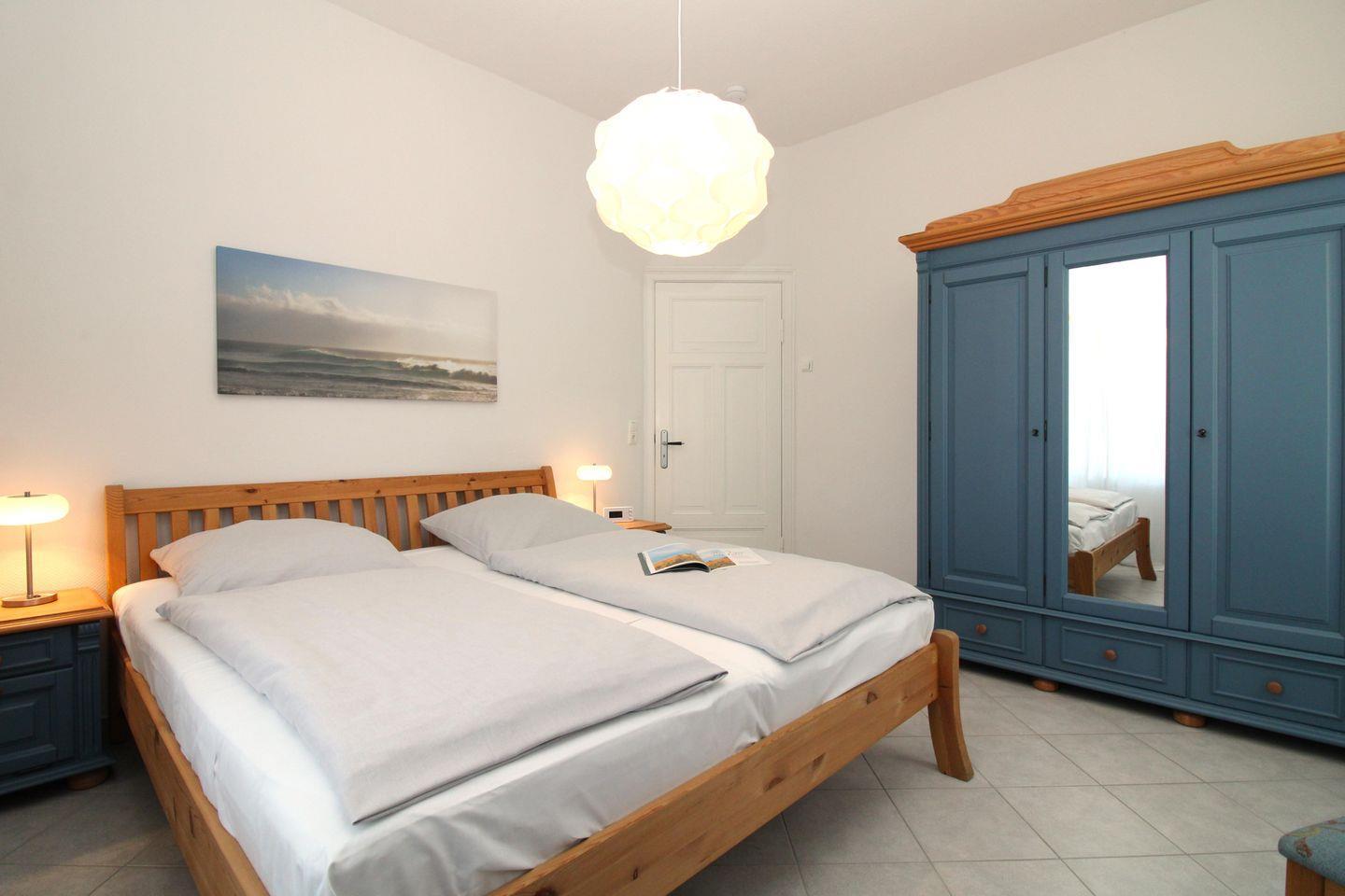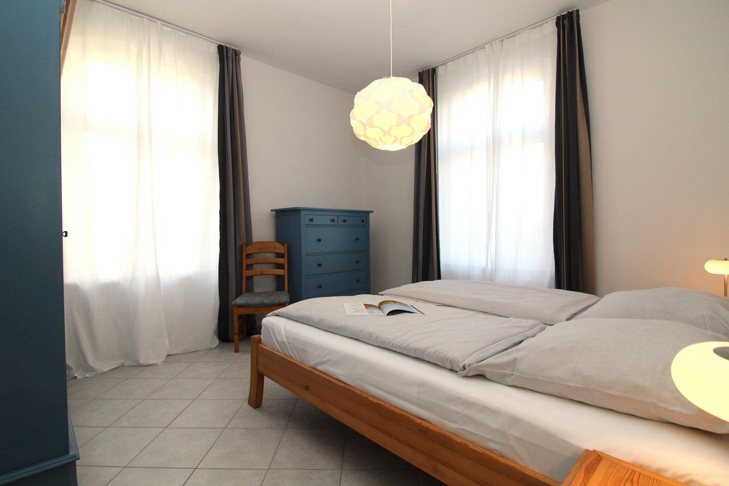 Das freundliche und gemütliche Schlafzimmer ist mit einem bequemen Doppelbett (2 x 90 cm x 200 cm), Nachttischen mit Nachttischlampen, einem geräumigen Kleiderschrank sowie einer geräumigen Wäschekommode eingerichtet. Für einen hohen Schlafkomfort sorgen die vorhandenen Verdunkelungsvorhänge an beiden Fenstern.