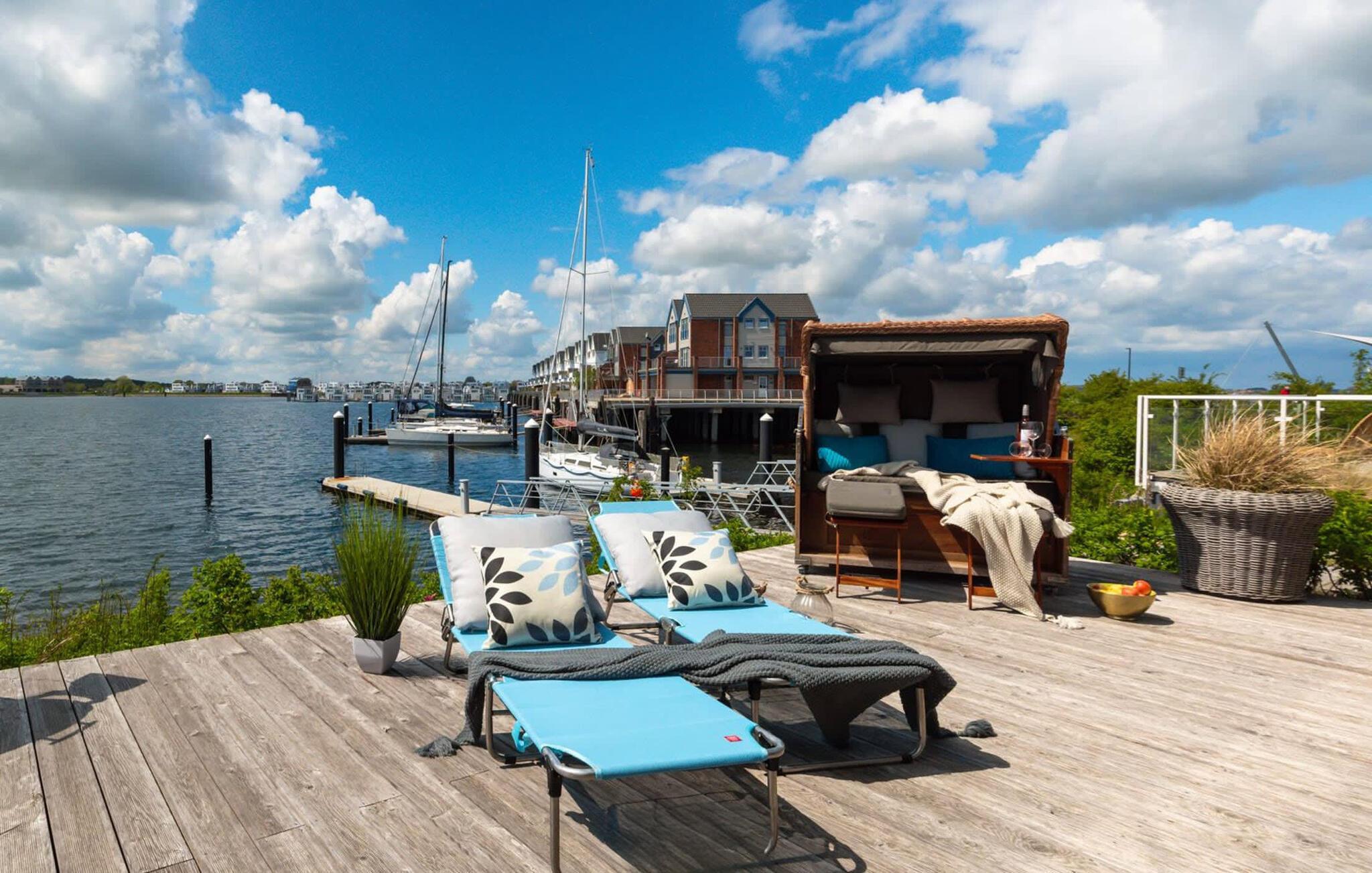 Die 40 m² große Holzterrasse mit Blick auf die Marina zur einen und Schleimündung zur anderen Seite bietet neben einem Esstisch auch einen maritimen Strandkorb. Die Terrasse ist gen Süd-Westen ausgerichtet und verspricht somit ganztags Sonne.
