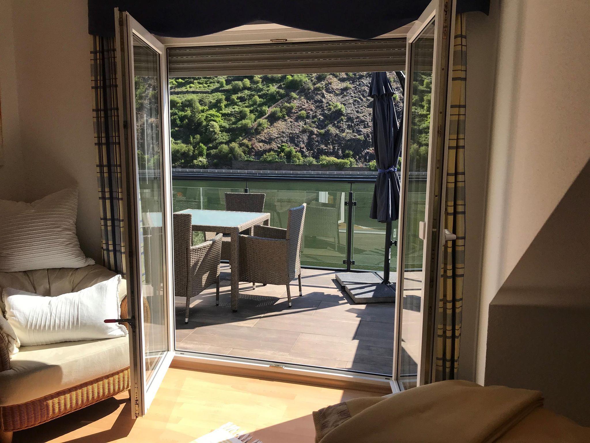 Unsere helle Ferienwohnung Panoramablick, lädt zum Genießen und Verweilen ein. Vom Balkon haben Sie eine tolle Aussicht auf den Moselort Alken mit der Burg Thurant. In der Küche finden Sie neben einem Kühlschrank mit Gefrierfach auch eine Geschirrspülmaschine, eine Mikrowelle sowie ein Backofen vor. Zudem sind Haushaltsgeräte wie Toaster, Wasserkocher, Mixer und Pürierstab vorhanden. Ein großer Esstisch mit Moselblick lädt zum gemeinsamen Essen ein. Im Wohnraum befindet sich ein großer Flachbildschirm SAT-TV. Das Schlafzimmer ist mit einem Boxspringbett und einem weiteren TV ausgestattet. Ebenfalls befindet sich dort ein Safe.