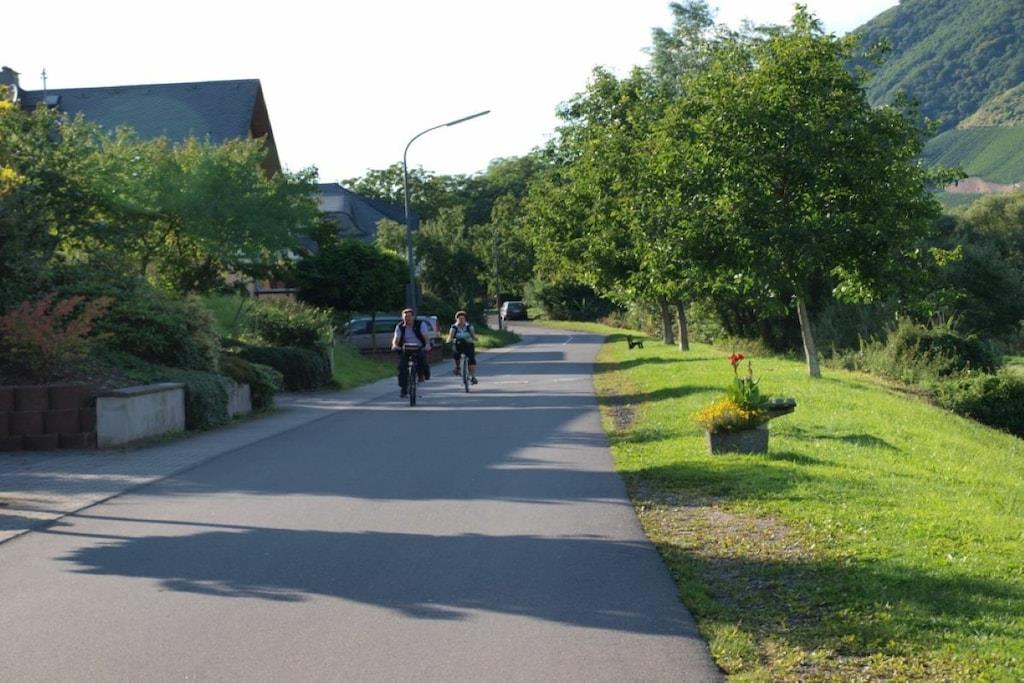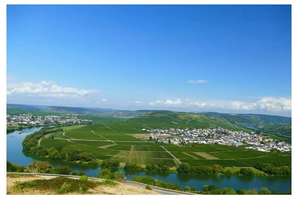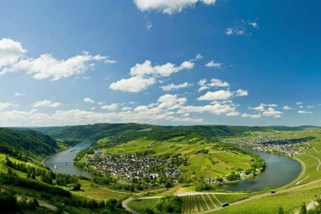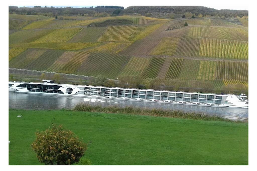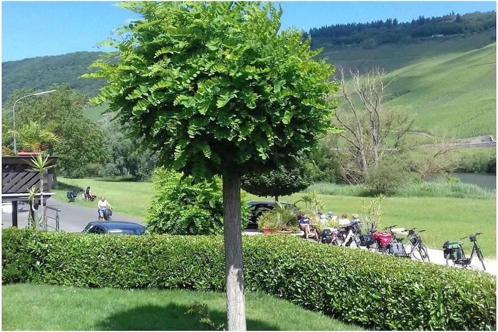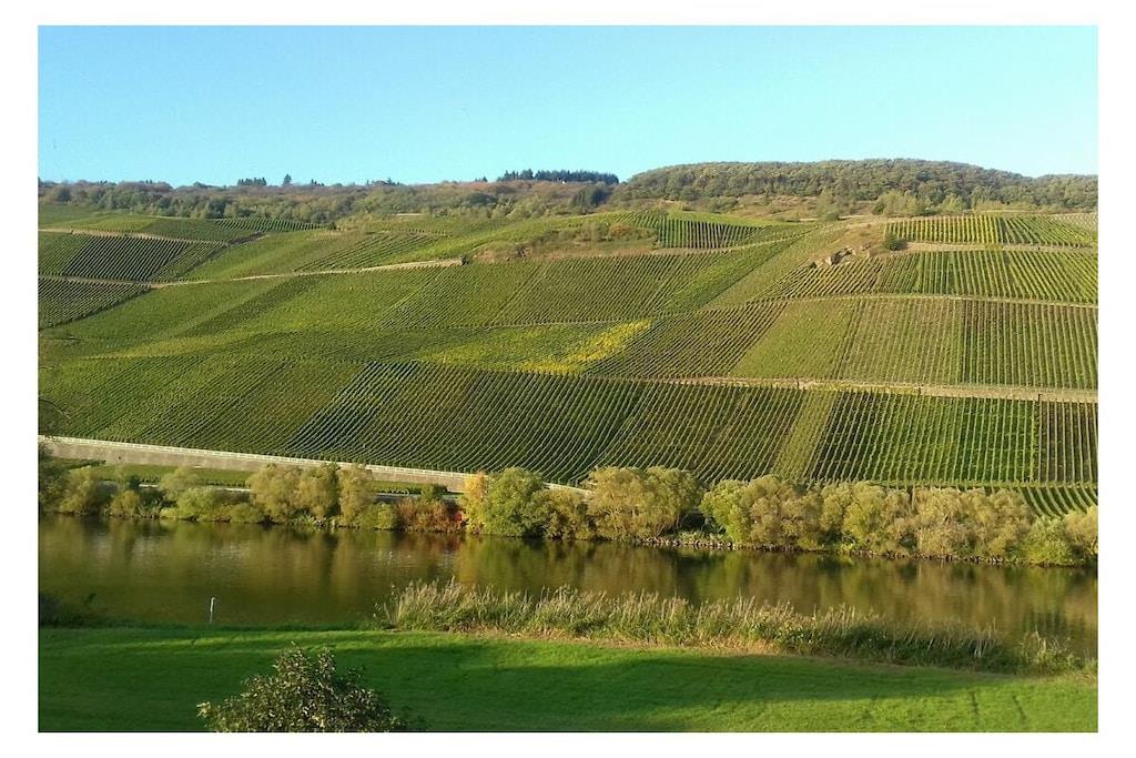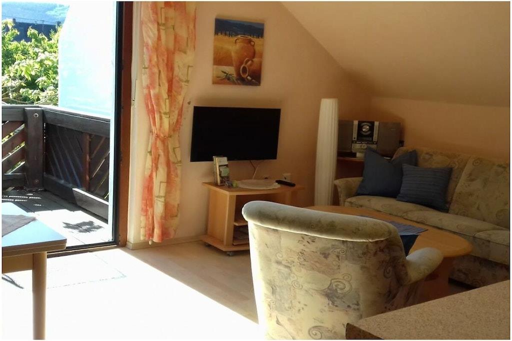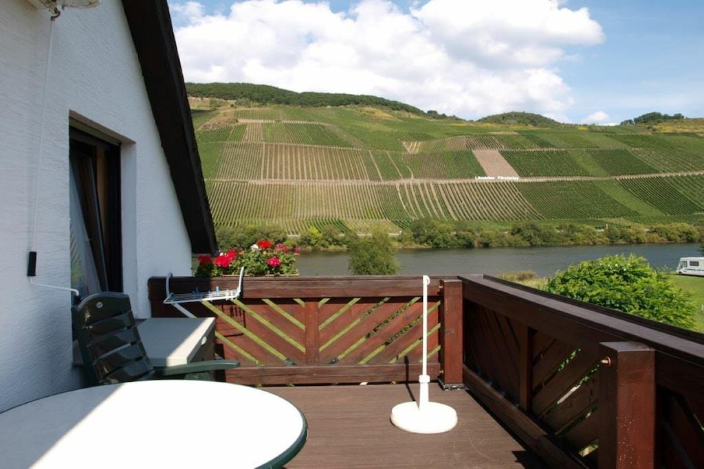 The cozy apartment (approx. 50sqm) offers enough space for 2 possibly 3 people with a large balcony (approx. 12qm) with a seating group. From here you have a view of the Moselle and the opposite vineyards. The apartment is located directly on the Moselle Cycle Path. With us you will find relaxation in a prime location. Apartment with a spacious parking lot and a closed bike/motorcycle garage. Internet connection. Bread service.