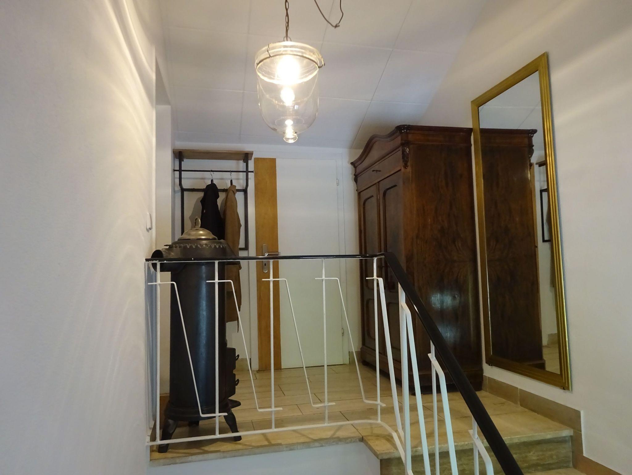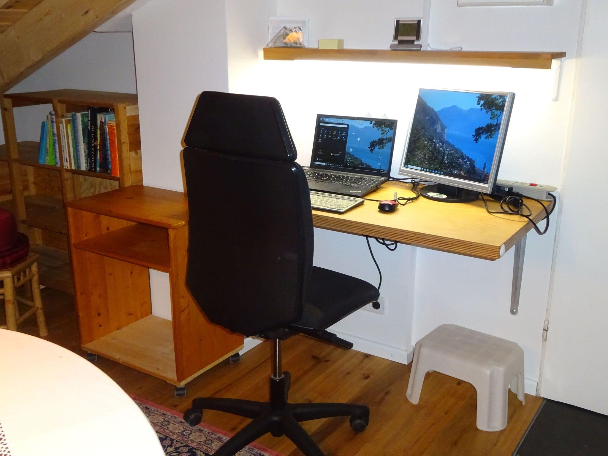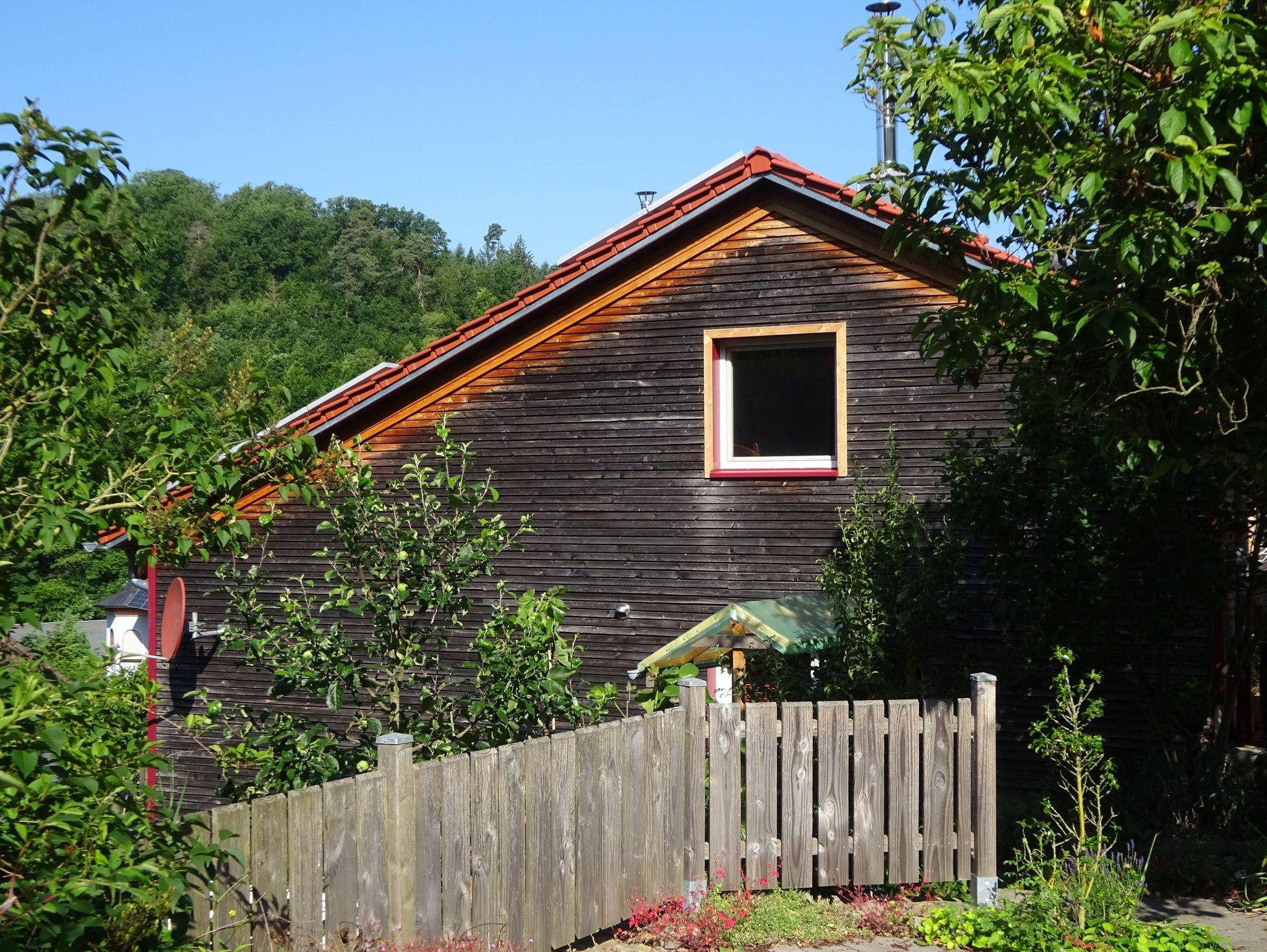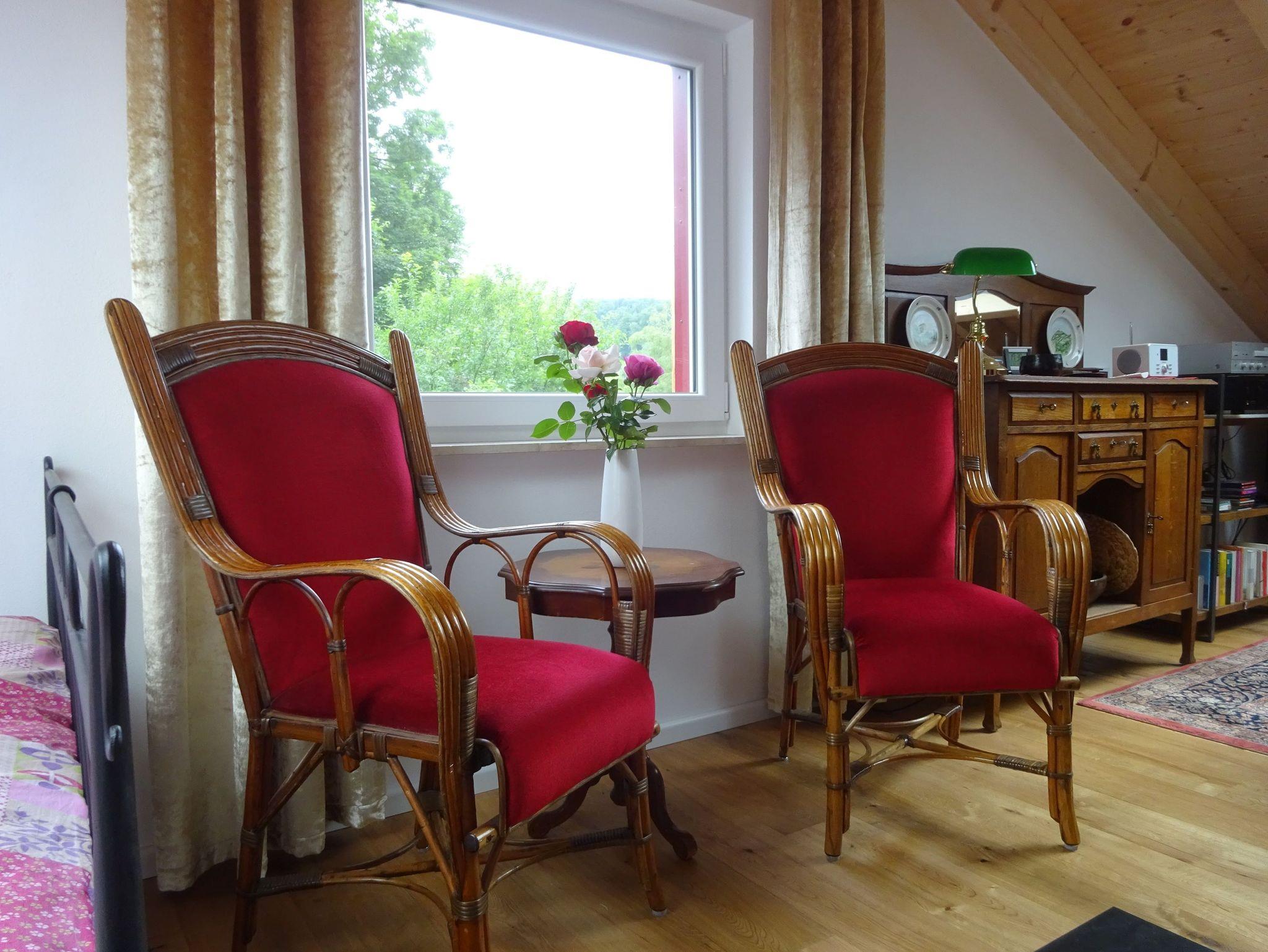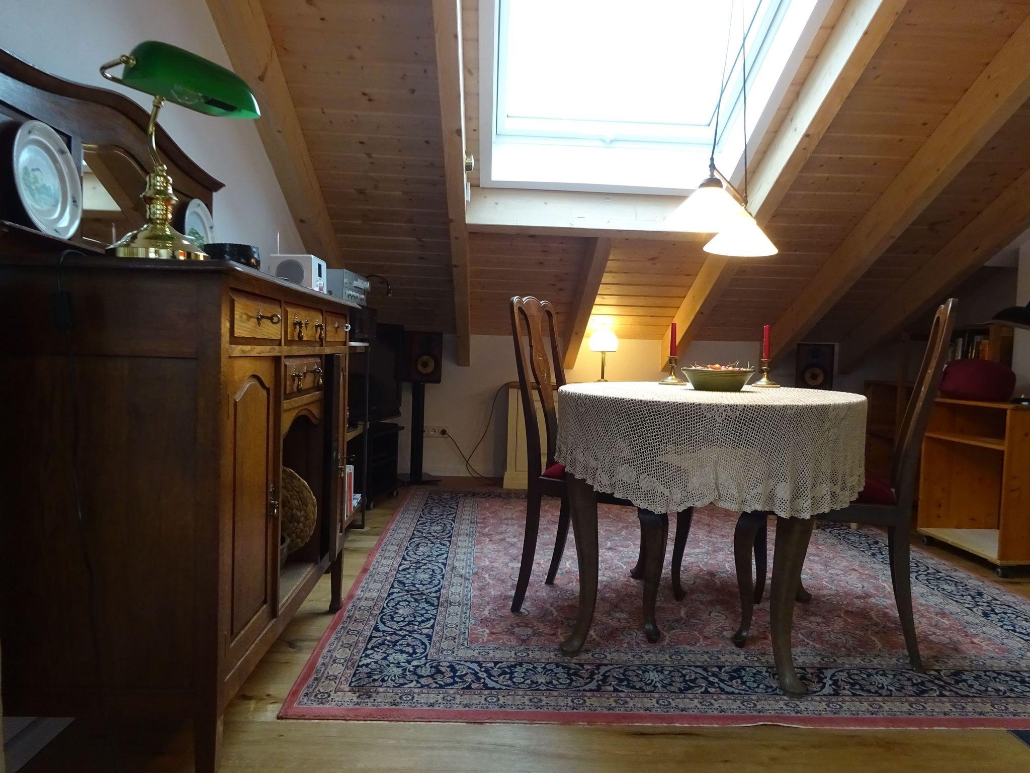 Nur sieben Stufen führen zur Wohnung im ersten Obergeschoss. Durch das Dachfenster eröffnet sich nachts ein Blick auf den Sternenhimmel, tagsüber schweift der Blick durchs Giebelfenster über Wiesen und Wälder. Vor dem Haus lädt eine kleine Terrasse mit Tisch und Stühlen zum Verweilen ein mitten in einer Sackgasse mit fast ländlichem Charakter.