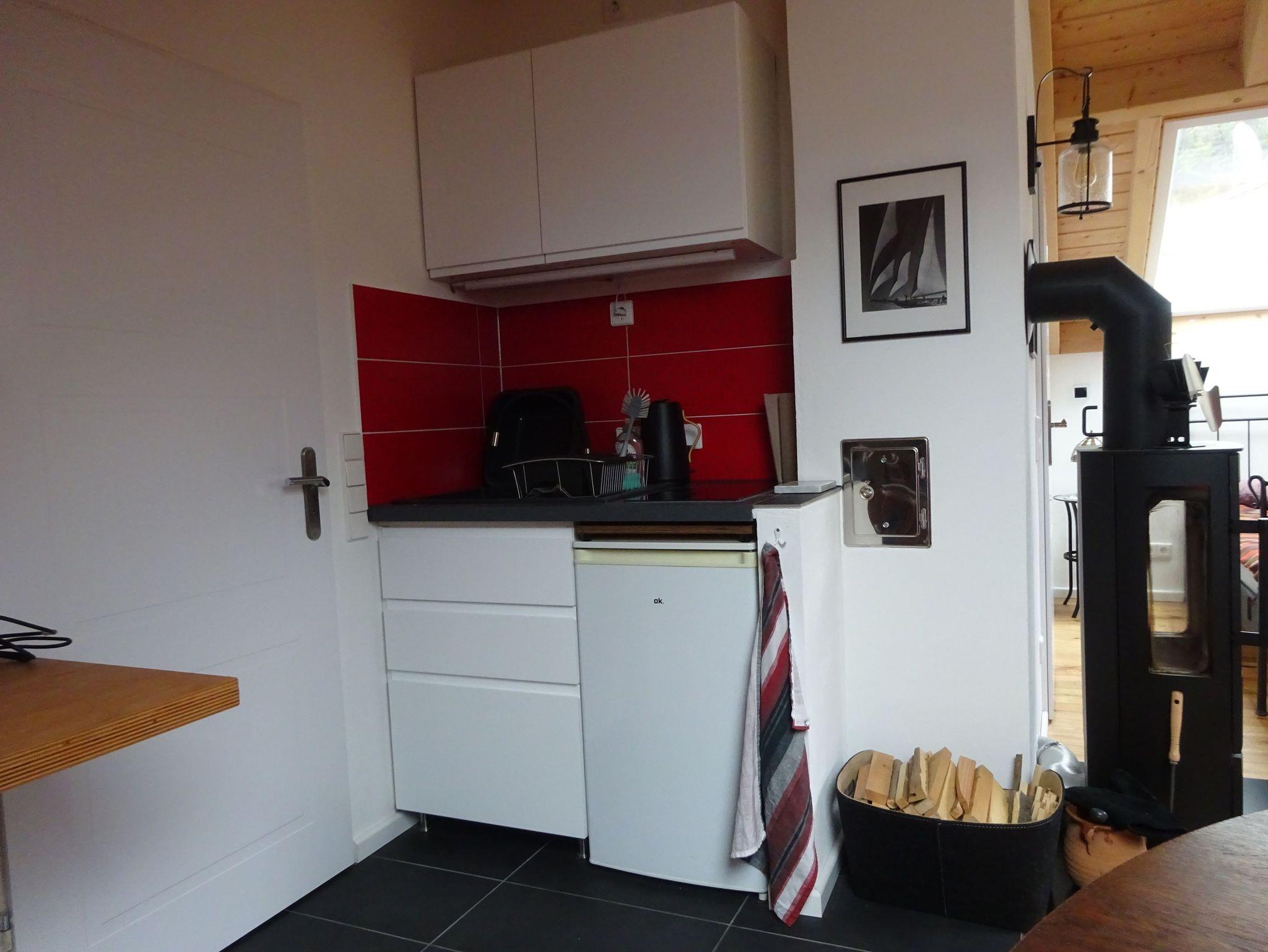 Ein französisches Bett lädt zum Ausschlafen ein, während der offene Wohnbereich mit Kaminofen und elektrischer Fußbodenheizung auch an kühlen Tagen für Wohlbehagen sorgt. Die kleine, aber gut durchdachte Miniküche ist mit zwei Ceranfeldern, einem Kühlschrank, einem Wasserkocher, einer Kaffeemaschine und einem Toaster ausgestattet, ideal für das Frühstück oder eine einfache Mahlzeit zwischendurch.