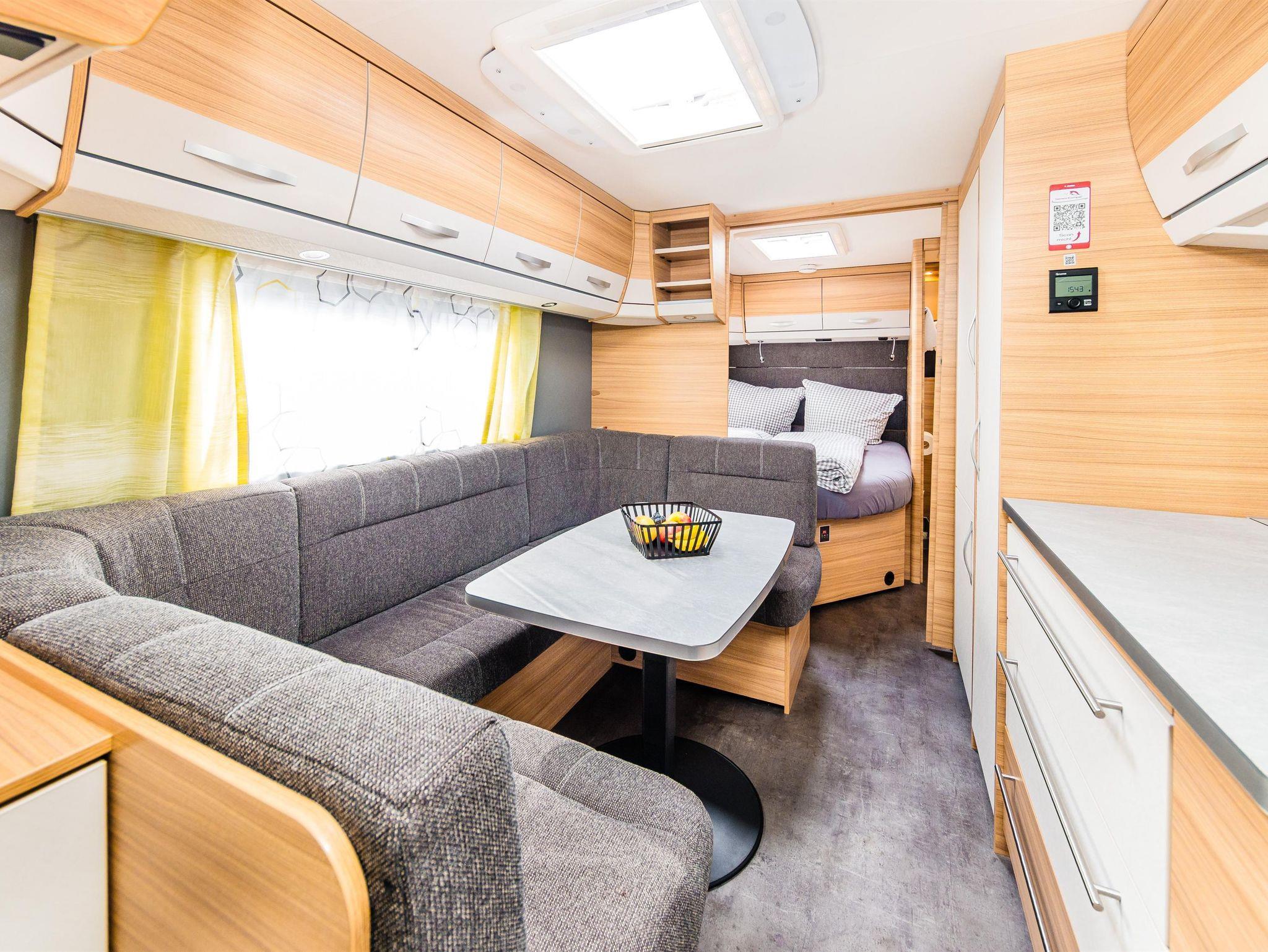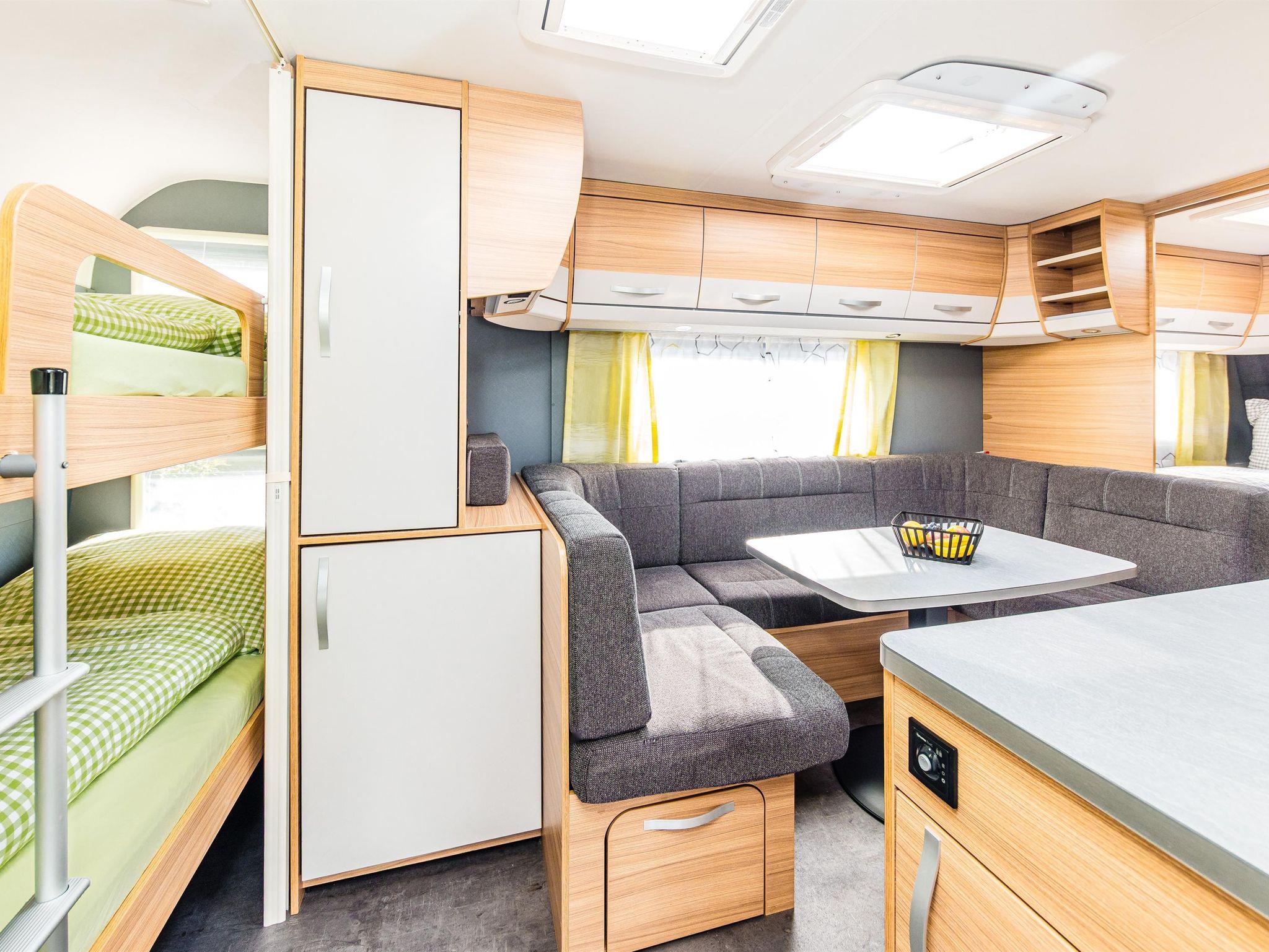 Der Wohnwagen im modernen Design ist für maximal 5 Personen ausgelegt. Hohen Komfort bieten das jeweils vorhandene Doppelbett und das Etagenbett. Um den Schlafplatz für die 5. Person bereitzustellen, kann die Sitzecke ganz bequem zu einem Bett umgebaut werden. Im Wohnwagen und Vorzelt gibt es jeweils einen Wasser- und Abwasseranschluss. Das Vorzelt ist beheizbar, hat einen festen Fußboden und bietet eine Sitzgelegenheit mit Küchenzeile und ausgestattetem Inventar. Auch das geräumige Vorzelt können Sie nutzen. Hier steht Ihnen eine luxuriöse Küche, eine komfortable Dusche und natürlich eine gemütliche Sitzecke um dem Campingfeeling treu zu bleiben, zur Verfügung. Haustiere sind in den Mietwohnwägen nicht erlaubt.