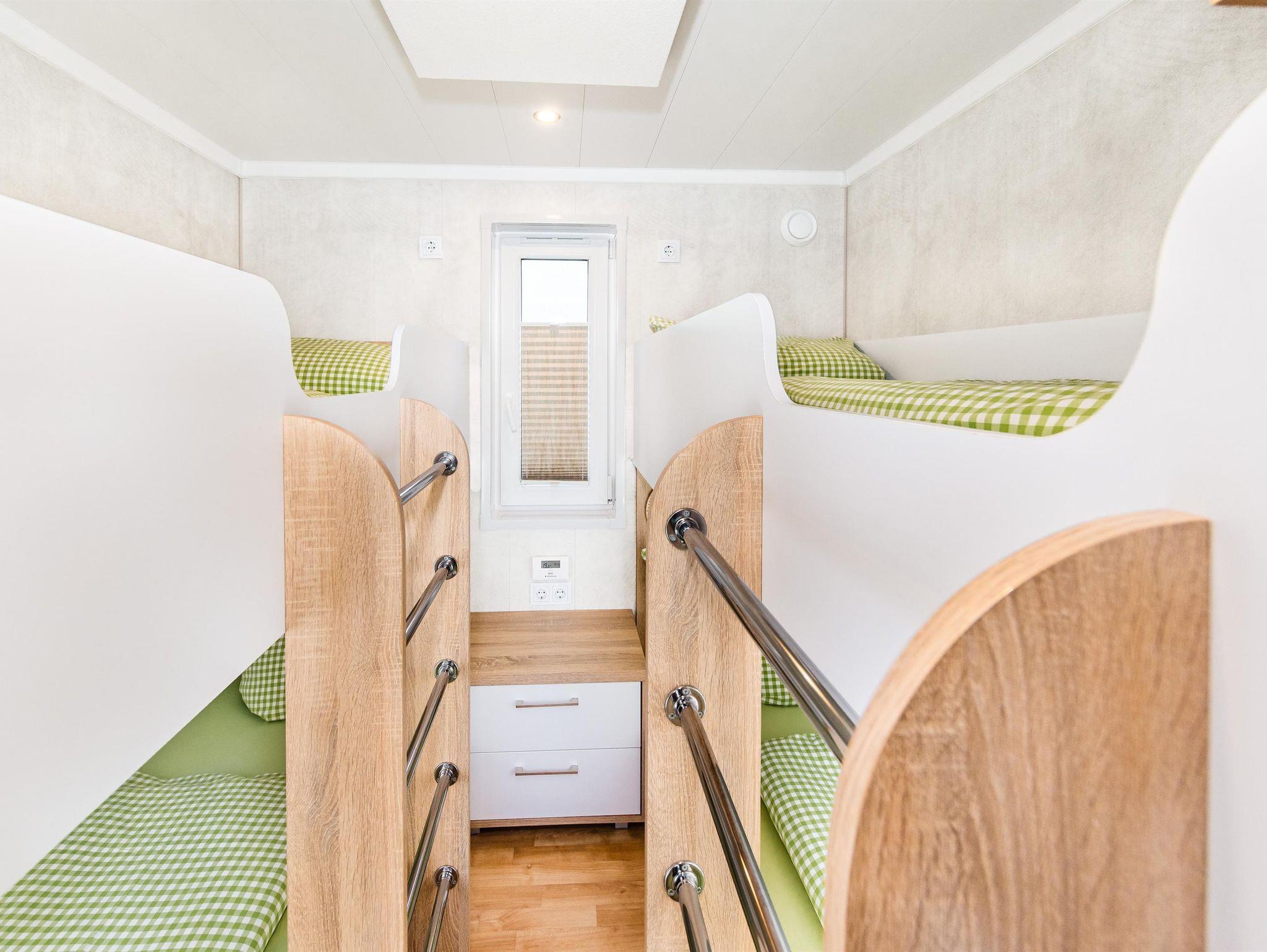 Sie wohnen in gemütlichen, liebevoll eingerichteten hochwertigen Mobile Home. Die Mobile Homes verfügen über ein Elternschlafzimmer und ein kleines Kinderzimmer mit 2 Kinderetagenbetten, Bettwäsche inklusive. Zudem finden Sie eine komplett eingerichtete Wohnküche mit Sitzecke, einen Herd mit mind. 2 Kochfeldern, Warmwasser, Kühlschrank und TV. Eine teilüberdachte Terrasse mit Sitzgelegenheiten für bis zu 6 Personen steht zur Verfügung.