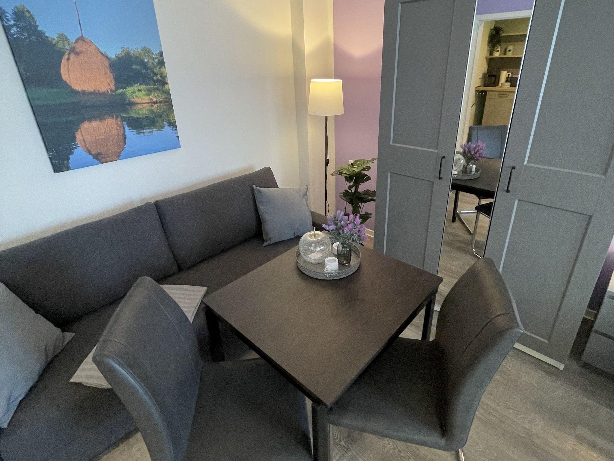 Entdecken Sie die charmante Ferienwohnung Spatzennest im Haus Delphinen im Herzen von Lübben. Mit ihrer zentralen Lage genießen Sie die Vorzüge der Stadt und die malerische Umgebung des Spreewalds. Die modern eingerichtete Wohnung bietet Ihnen eine voll ausgestattete Küche, ein einladendes Sofa sowie einen Esstisch, ideal für gesellige Abende. Ein zusätzlicher Bartisch mit zwei Hockern lädt zum Verweilen ein.