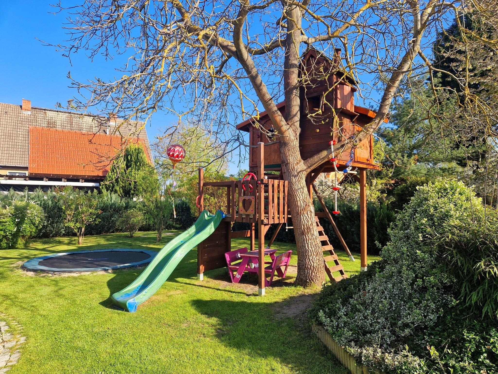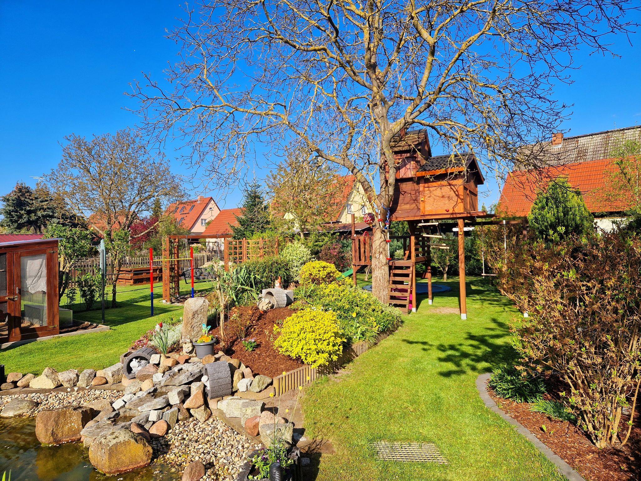 Kleiner Spielplatz mit Schaukel, Rutsche und Baumhaus