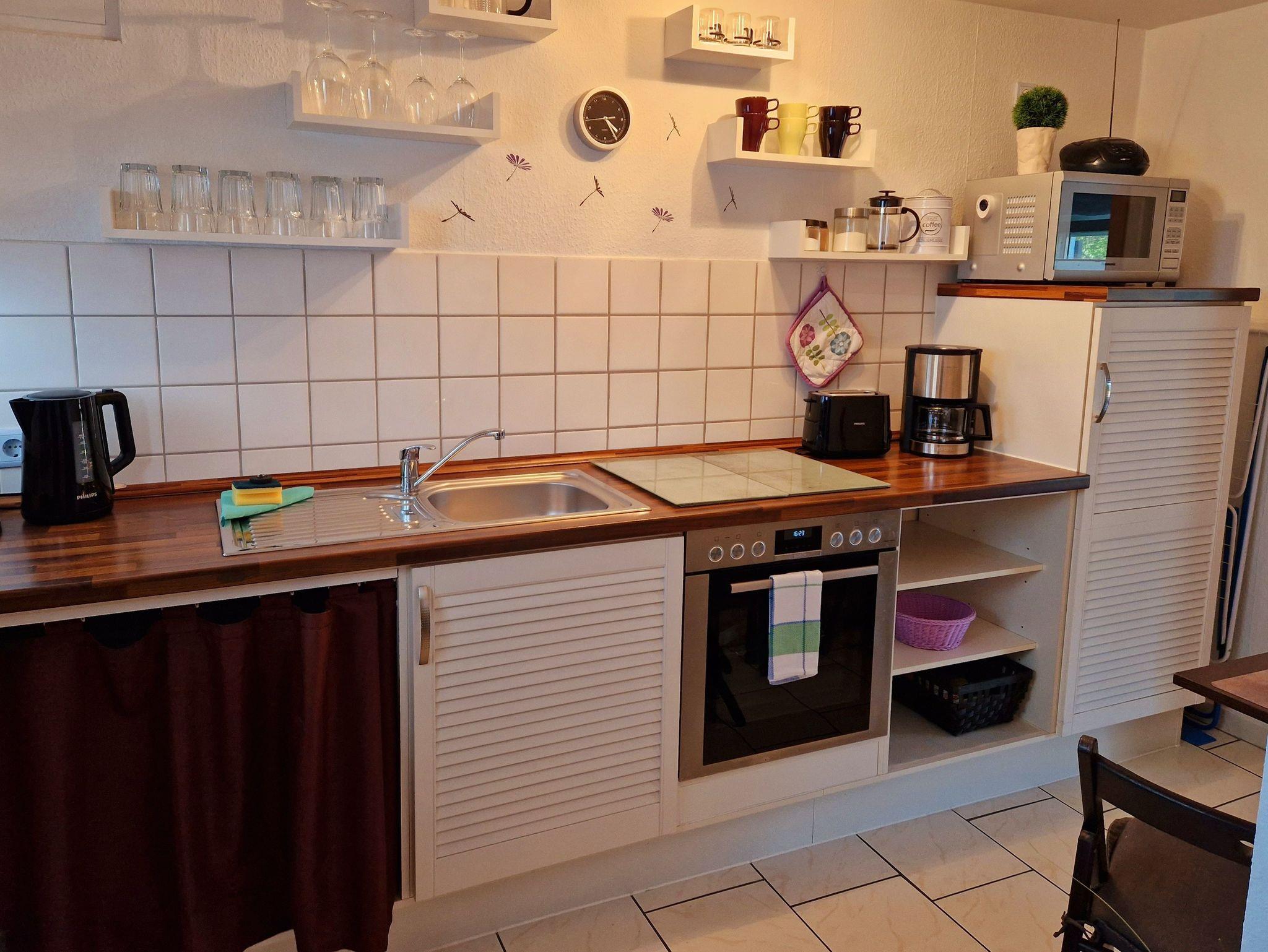 Die Küche verfügt über einen Kühlschrank, ein Kaffeemaschine, einen Toaster, einen Wasserkocher, eine Mikrowelle sowie einen Herd mit Backofen.