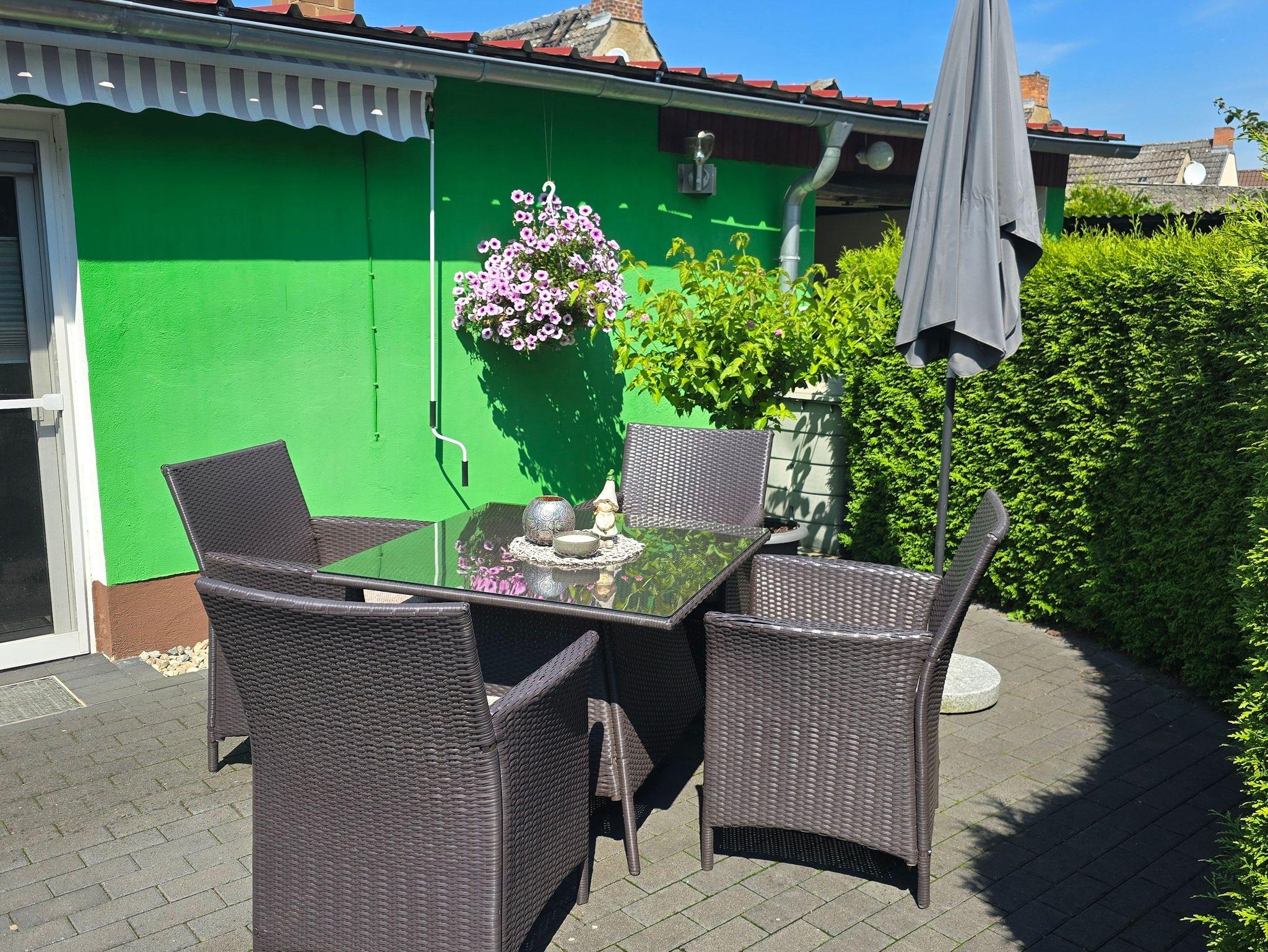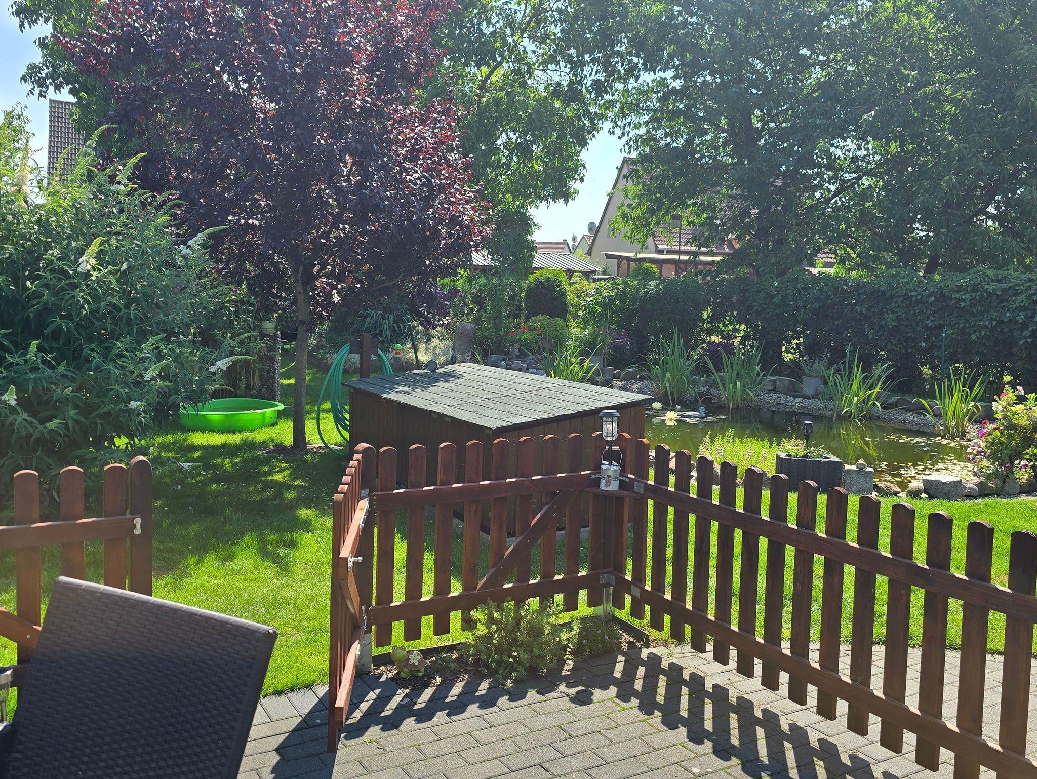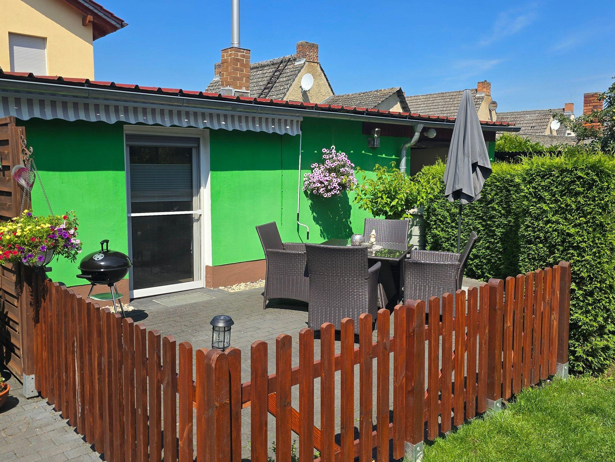 Der Garten kann genutzt werden und hat eine Liegewiese mit Grillmöglichkeit und großer Terrasse zum entspannen.